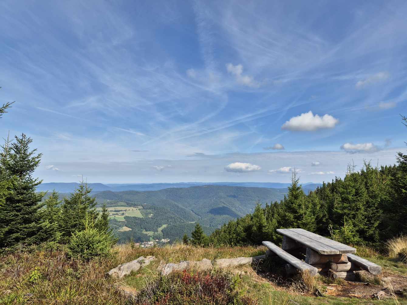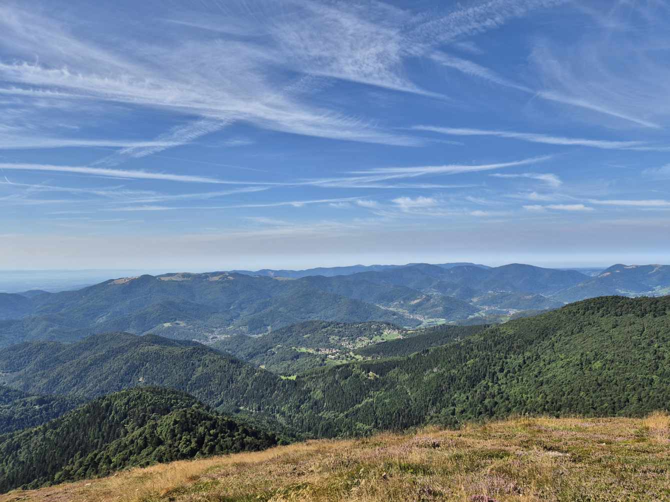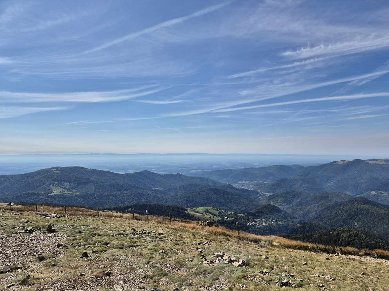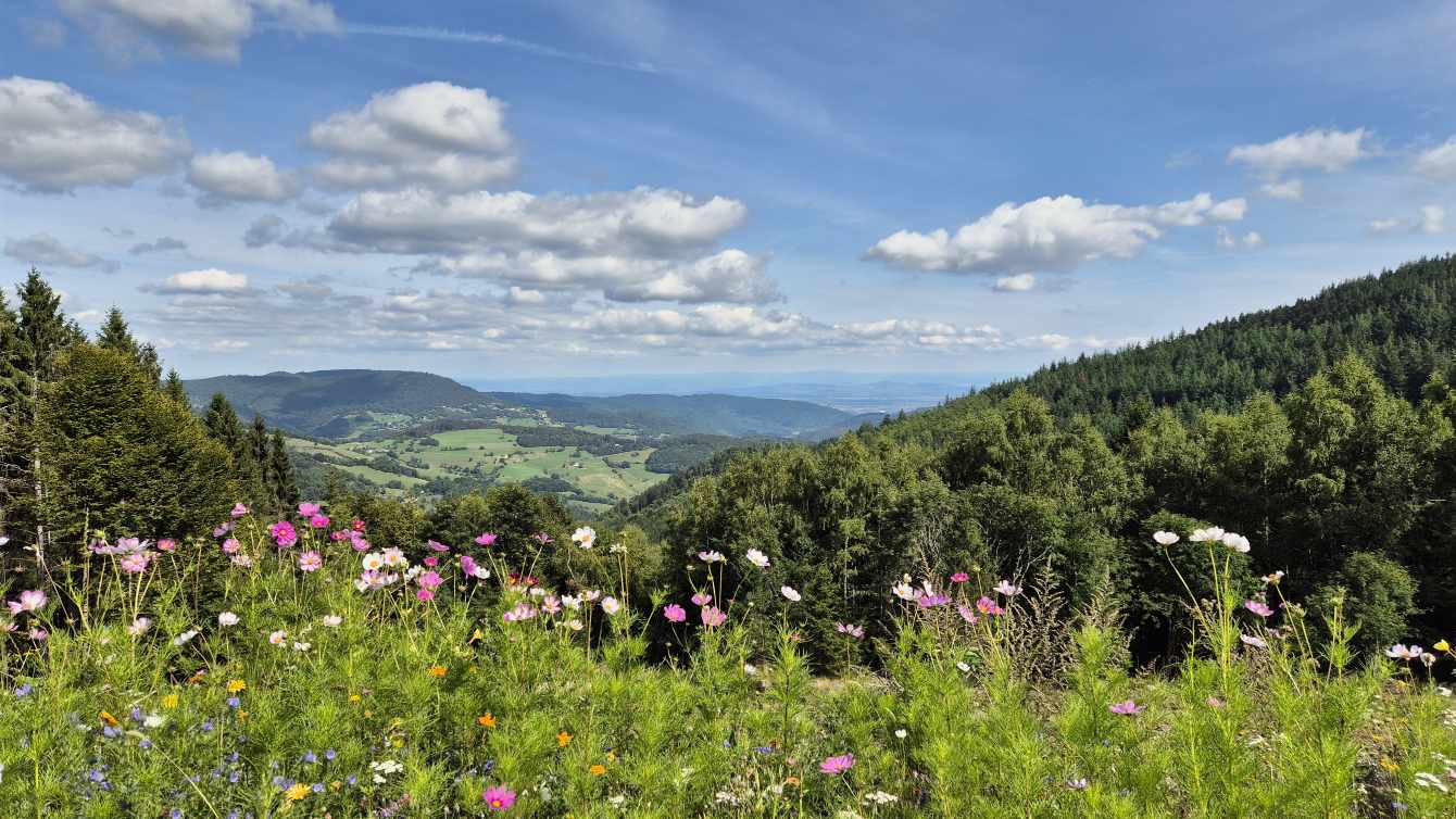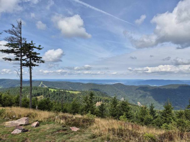 Wetter: blauer Himmel und Sonnenschein, vereinzelt Wolken, angenehme Temperatur, auf dem Grand Ballon ein frischer Wind