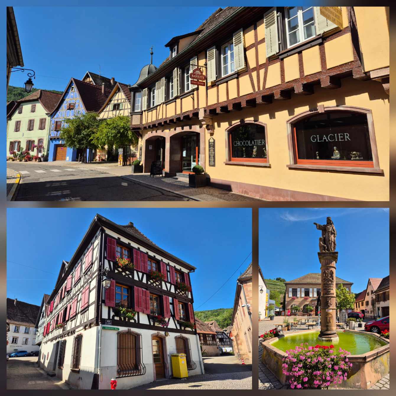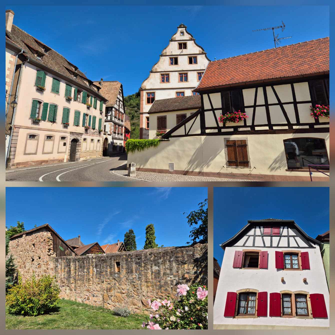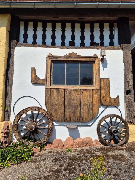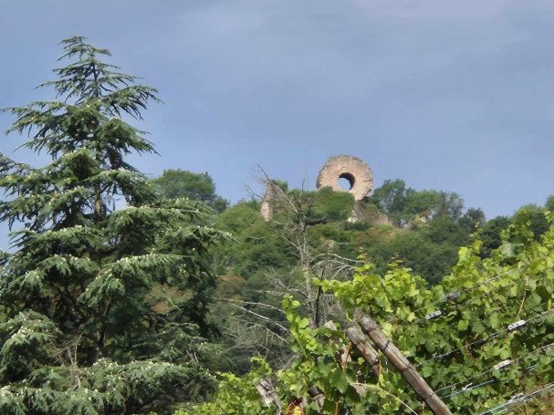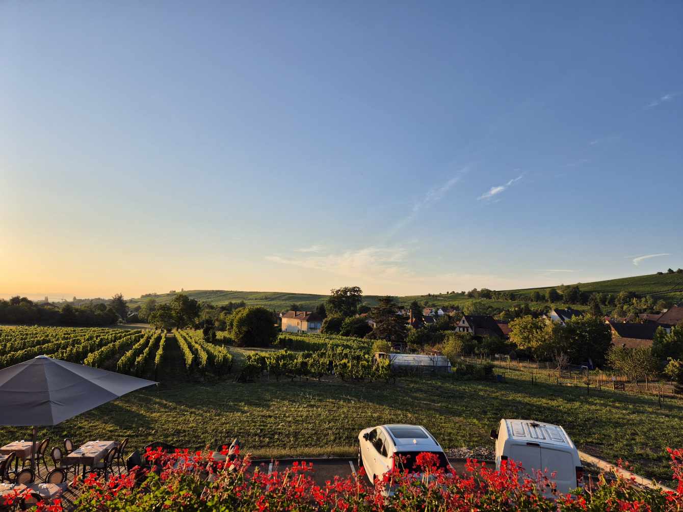 Tagesbericht: Ruhetag - wir schlafen bis um halb acht aus und genießen dann ausgiebig das Frühstück. Anschließend kommt die "Materialpflege", d.h. alles, was erforderlich ist, wird gewaschen und auf unserem idealen Süd-Ost Balkon in die Sonne gehängt. Danach drehen wir eine Runde durch Andlau, erfreuen uns an netten Häusern und besichtigen die Stiftskirche Ste-Richarde. In einem kleinen Supermarkt versorgen wir uns mit Sprudel für den Tag, frischen unseren Vorrat an Nüssen und Trockenfeigen auf und nehmen für den Nachmittag ein paar Aprikosen mit. Und dann ist "Menschpflege" angesagt, d.h. Füße hochlegen, am Handy rumdaddeln, Nickerchen machen und das in mehreren Wiederholungen - seeehr erholsam.