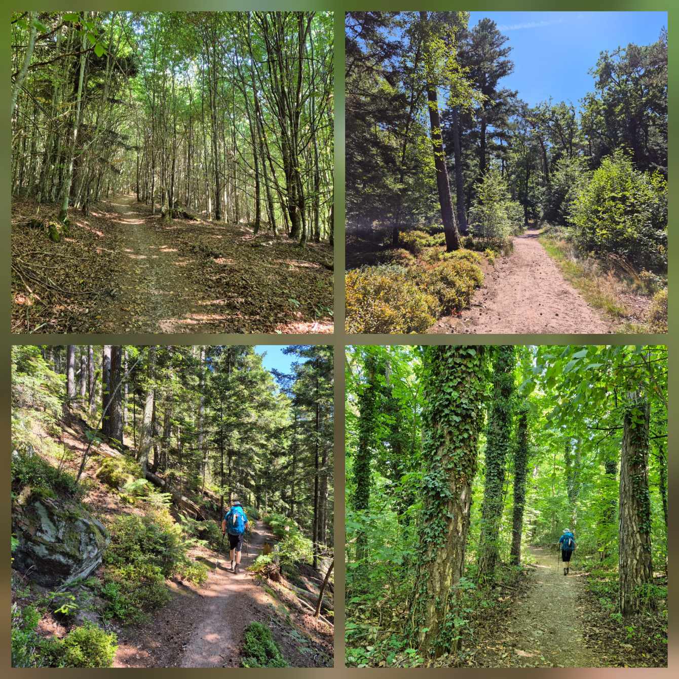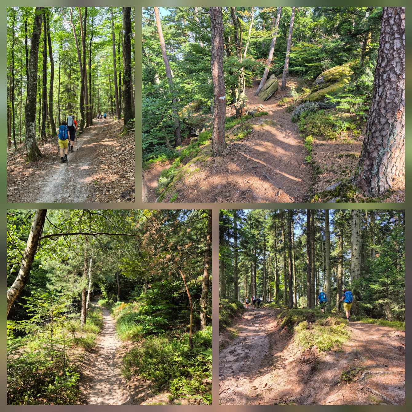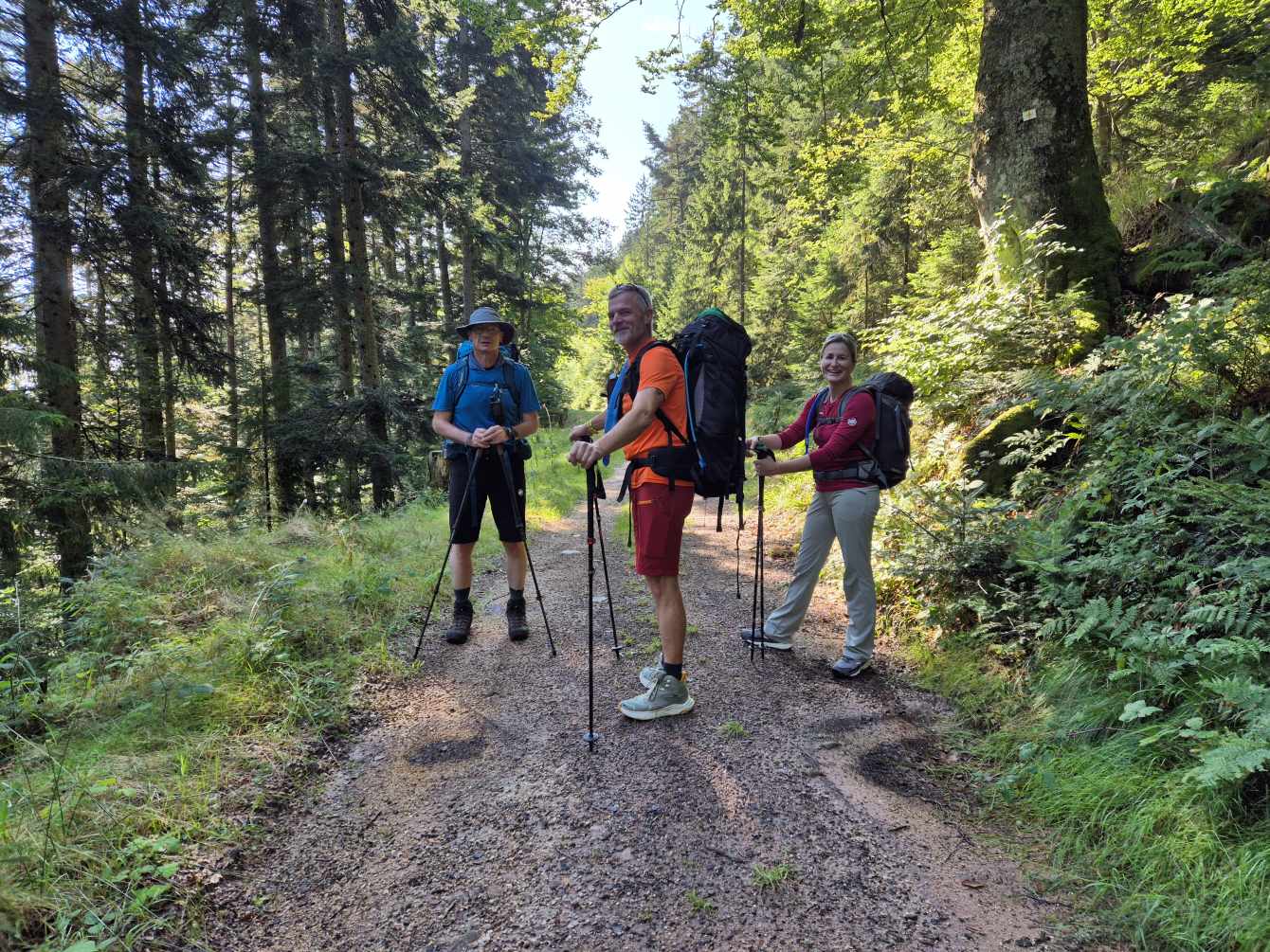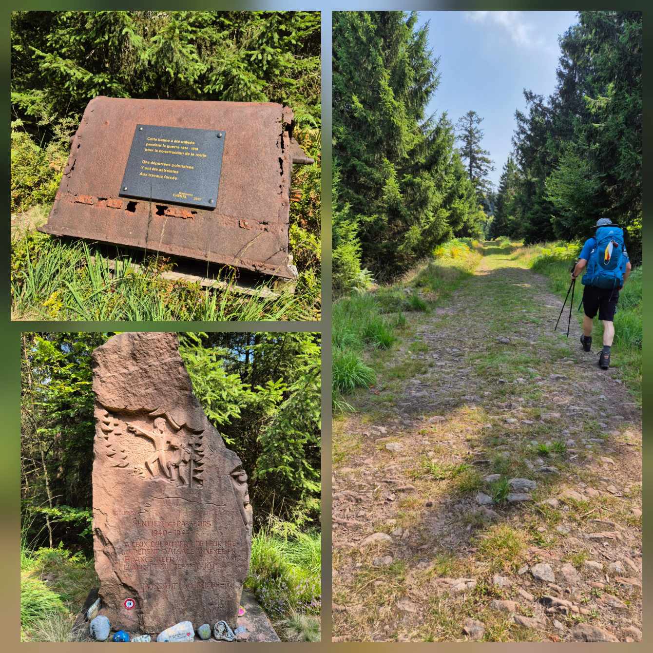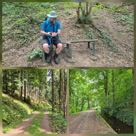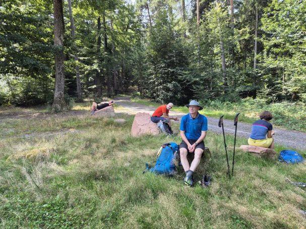Tagesbericht: Nachdem wir nach Sonnenuntergang das Fenster unserer "Obstkiste" (wie Ulli unser Zimmer nennt) öffnen, wird die Innentemperatur so weit erträglich, dass wir einigermaßen schlafen können. Etwas erholt geht's um 7:30 Uhr zum Frühstück und eine starke Stunde später starten wir zu dritt in den Wandertag, den wir mit einer kleinen Extra-Schleife beginnen, um an einem französischen Militärfriedhof vorbeizugehen. Da unsere heutige Route nicht auf dem GR53/GR5 verläuft, sondern eine alternative Empfehlung aus unserem Wanderführer ist, wird die Streckenführung für Peter eine Challenge, da wir keinem festen Wanderzeichen folgen. Schnell wird der breite Forstweg wieder zum Pfad und wir kommen an etlichen halb verschütteten Bunkern, einem Graben und mehreren Kampfständen vorbei. EInmal mehr wird bewusst, dass dies ein lange und immer wieder umkämpftes Gebiet gewesen ist. Bald danach beginnt der Pfad mäßig steil anzusteigen, bis wir -oben angekommen- eine herrliche Höhenwanderung auf schmalen Pfaden vor uns haben; mal bewaldet, mal auf offener Fläche, mal mit etwas Ausblick; dazu häufig ein leichter Wind - wirklich sehr schön! Nach rund zwei Stunden verabschiedet sich Ulli und kehrt auf anderem Weg ins Hotel zurück; Peter und Michaela setzen die Tour fort. Es folgen wechselnde Abschnitte - Forstwege und Höhenwegs-Pfädchen; erneut "Kunst im Wald" und wir fragen uns, wer das warum so im "nirgendwo" platziert; auch einen weiteren Kriegsgedenkplatz passieren wir. Über einen sehr hohen Übergang kommen wir in ein 50 ha großes eingezäuntes Naturschutzgebiet und erreichen dort einen sehr schönen Aussichtspunkt - das Gipfelplateau der Chatte Pendue, 899m. Auf felsigem Pfad geht es wieder bergab und wir legen bald nach dem Verlassen des Naturschutzgebietes eine kleine Pause ein. Im weiteren Verlauf kommen wir an der Ruine Salm vorbei, bevor wir das kleine Dörfchen Salm durchqueren. Auf breitem Forstweg geht es leicht bergab weiter bis nach Rothau. Nachdem die Pfade am Vormittag viel Konzentration gefordert hatten, würde es uns für heute eigentlich reichen, aber unser Ziel liegt noch 5 km weiter und 120m höher... ...noch einmal legen wir eine kleine Pause ein, um dann auf einem netten Waldweg mit Wasserlauf nebendran den "Endspurt" zu starten. Erschöpft, aber zufrieden erreichen wir unser Hotel - das sehr schön ist und mit seiner Atmosphäre von der ersten Minute an für Erholung sorgt. Zu dem sehr leckeren Abendessen kommt Ulli nochmals zu uns und wir lassen den Abend gemütlich gemeinsam ausklingen.