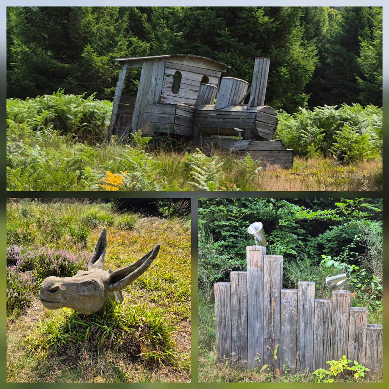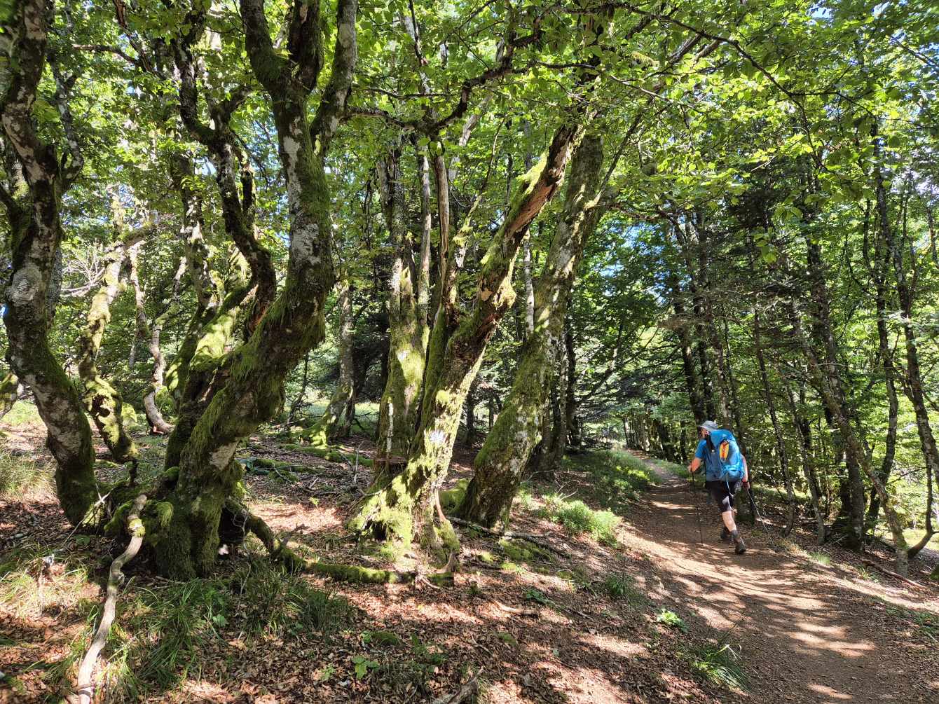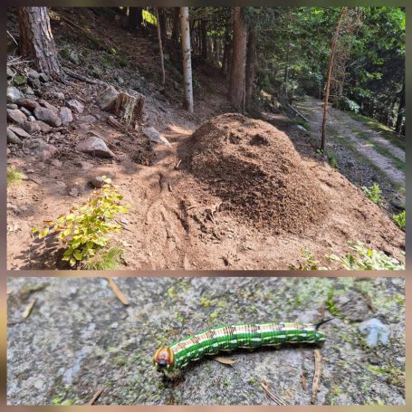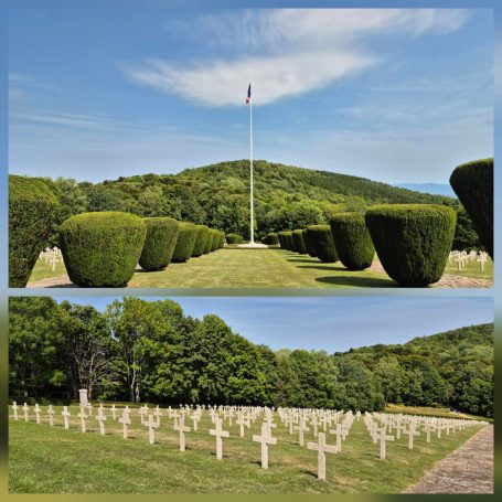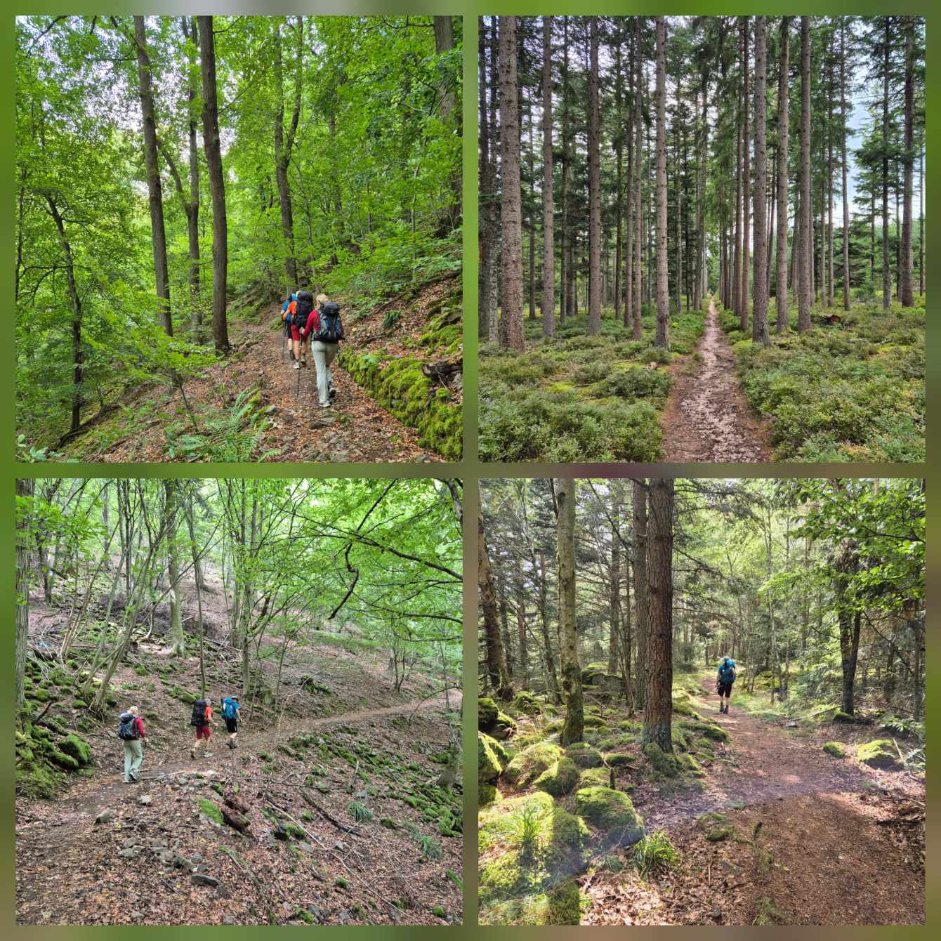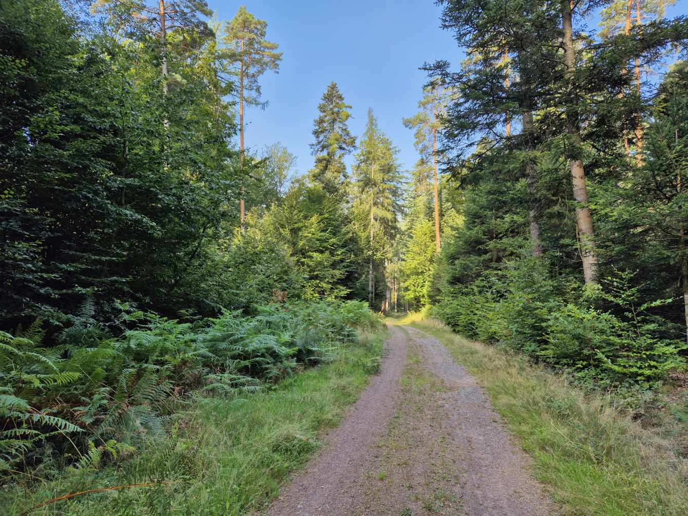Tagesbericht: Nachdem wir nach Sonnenuntergang das Fenster unserer "Obstkiste" (wie Ulli unser Zimmer nennt) öffnen, wird die Innentemperatur so weit erträglich, dass wir einigermaßen schlafen können. Etwas erholt geht's um 7:30 Uhr zum Frühstück und eine starke Stunde später starten wir zu dritt in den Wandertag, den wir mit einer kleinen Extra-Schleife beginnen, um an einem französischen Militärfriedhof vorbeizugehen. Da unsere heutige Route nicht auf dem GR53/GR5 verläuft, sondern eine alternative Empfehlung aus unserem Wanderführer ist, wird die Streckenführung für Peter eine Challenge, da wir keinem festen Wanderzeichen folgen. Schnell wird der breite Forstweg wieder zum Pfad und wir kommen an etlichen halb verschütteten Bunkern, einem Graben und mehreren Kampfständen vorbei. EInmal mehr wird bewusst, dass dies ein lange und immer wieder umkämpftes Gebiet gewesen ist. Bald danach beginnt der Pfad mäßig steil anzusteigen, bis wir -oben angekommen- eine herrliche Höhenwanderung auf schmalen Pfaden vor uns haben; mal bewaldet, mal auf offener Fläche, mal mit etwas Ausblick; dazu häufig ein leichter Wind - wirklich sehr schön! Nach rund zwei Stunden verabschiedet sich Ulli und kehrt auf anderem Weg ins Hotel zurück; Peter und Michaela setzen die Tour fort. Es folgen wechselnde Abschnitte - Forstwege und Höhenwegs-Pfädchen; erneut "Kunst im Wald" und wir fragen uns, wer das warum so im "nirgendwo" platziert; auch einen weiteren Kriegsgedenkplatz passieren wir. Über einen sehr hohen Übergang kommen wir in ein 50 ha großes eingezäuntes Naturschutzgebiet und erreichen dort einen sehr schönen Aussichtspunkt - das Gipfelplateau der Chatte Pendue, 899m. Auf felsigem Pfad geht es wieder bergab und wir legen bald nach dem Verlassen des Naturschutzgebietes eine kleine Pause ein. Im weiteren Verlauf kommen wir an der Ruine Salm vorbei, bevor wir das kleine Dörfchen Salm durchqueren. Auf breitem Forstweg geht es leicht bergab weiter bis nach Rothau. Nachdem die Pfade am Vormittag viel Konzentration gefordert hatten, würde es uns für heute eigentlich reichen, aber unser Ziel liegt noch 5 km weiter und 120m höher... ...noch einmal legen wir eine kleine Pause ein, um dann auf einem netten Waldweg mit Wasserlauf nebendran den "Endspurt" zu starten. Erschöpft, aber zufrieden erreichen wir unser Hotel - das sehr schön ist und mit seiner Atmosphäre von der ersten Minute an für Erholung sorgt. Zu dem sehr leckeren Abendessen kommt Ulli nochmals zu uns und wir lassen den Abend gemütlich gemeinsam ausklingen.