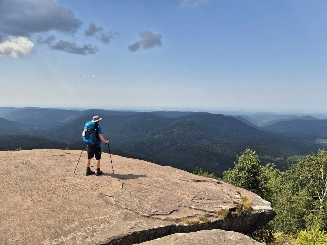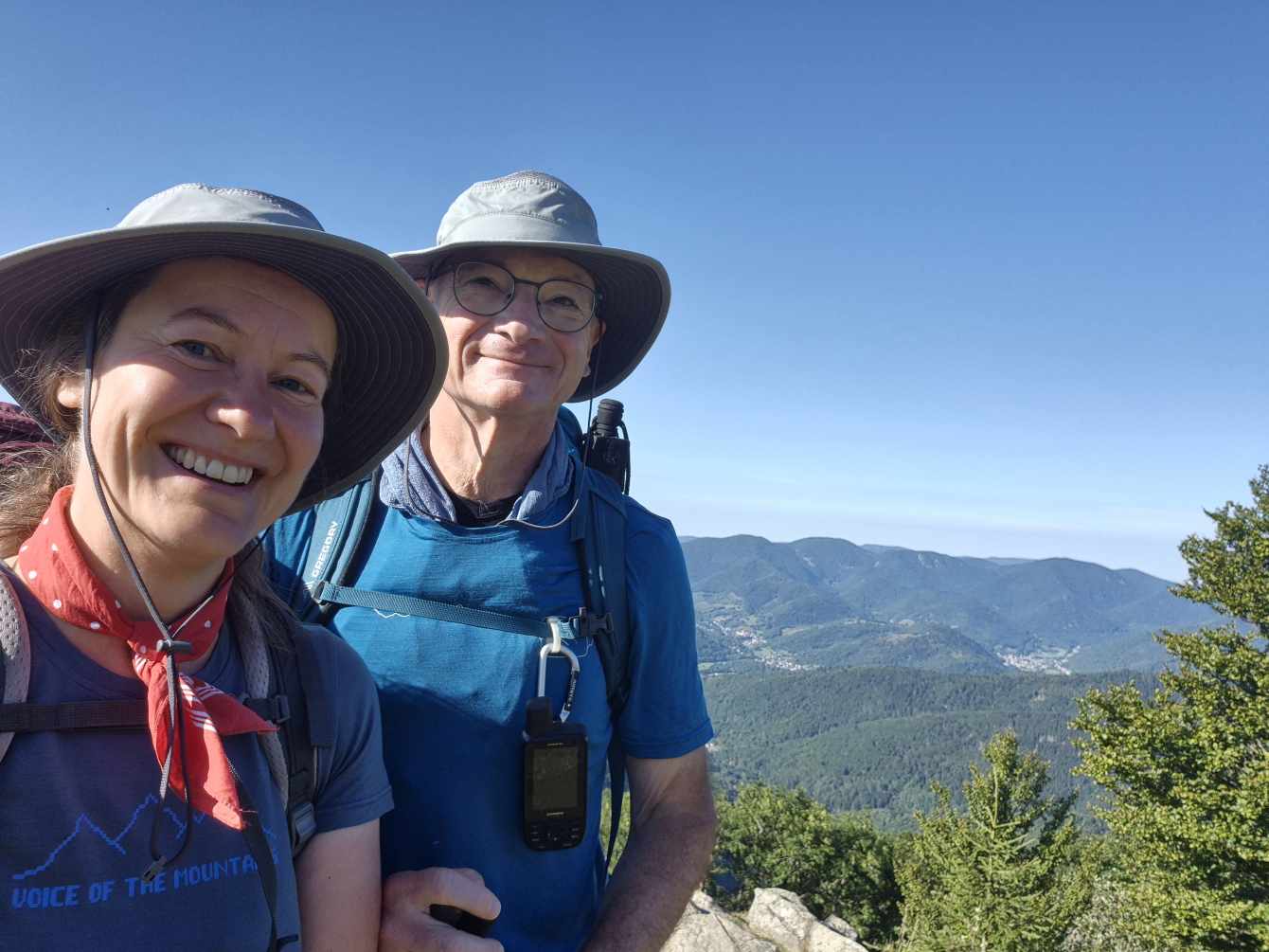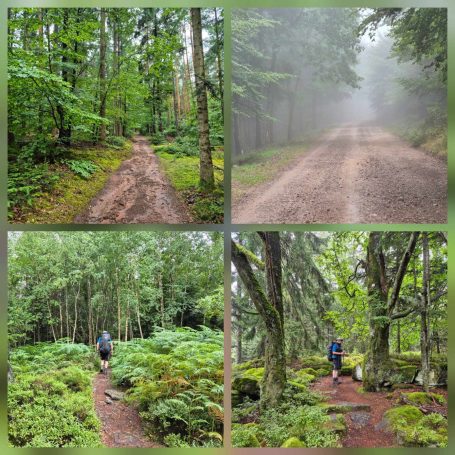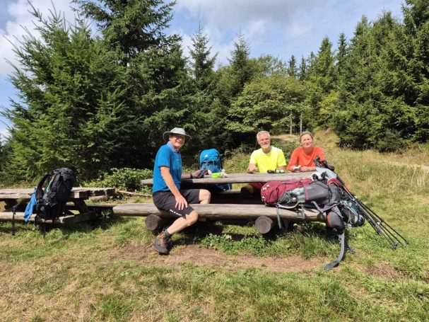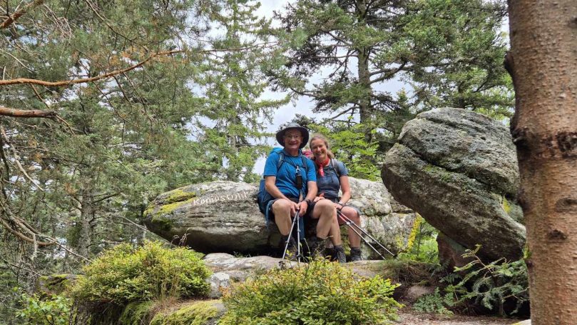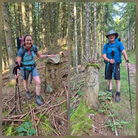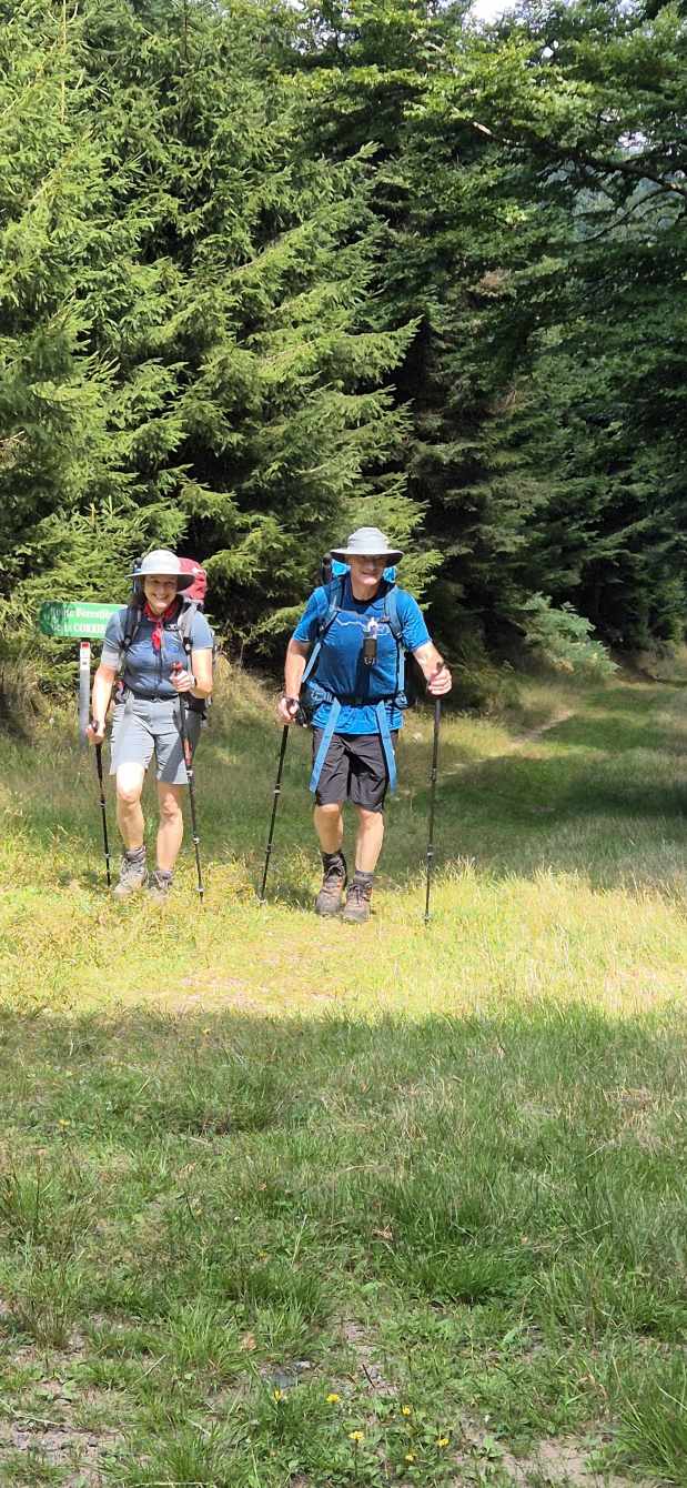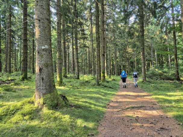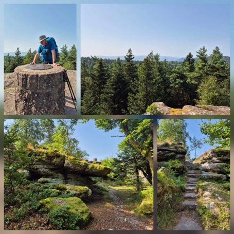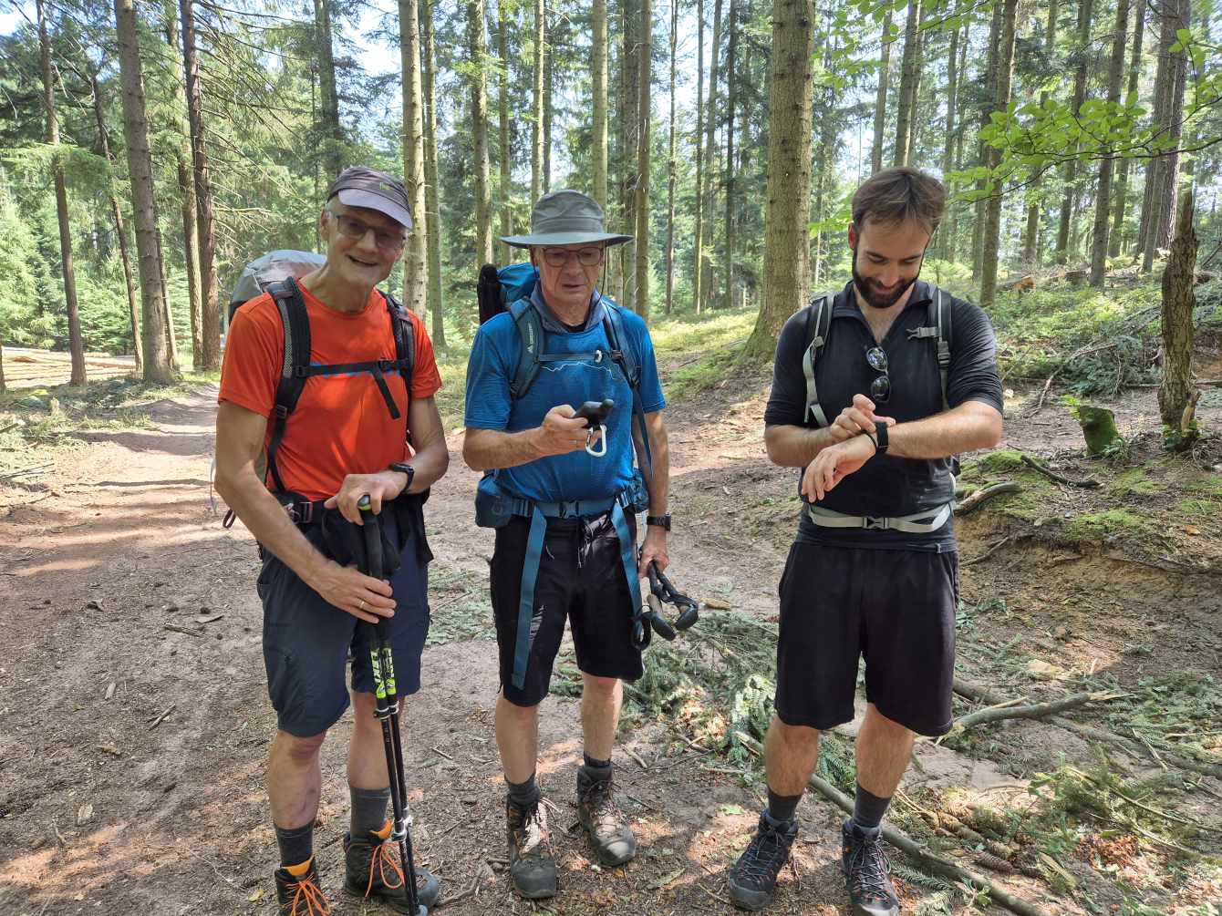 Tagesbericht: Um 6:00 Uhr weckt uns vor dem Wecker großes Glockengeläut, wie man es aus Bayern kennt. Die sehr freundliche Wirtin hat uns Frühstück sogar auf 7:00 Uhr angeboten - was wir gerne annehmen. Nach der Verabschiedung von Barbara und Joachim setzen wir unseren Weg fort. Zuerst geht es eine ganze Weile mit nur leichtem Anstieg auf breitem Weg durch den Wald. Dabei kommen wir an einigen Steinskulpturen vorbei - "Kunst im Wald". Angenehm erfrischend wirkt ein kleines Bächlein, an dem wir entlang laufen. Nach gut 1,5 Stunden schwenken wir auf einen schmalen, steileren und schönen Pfad ein. Und dann passiert uns ein wirkliches Missgeschick: Peters digitaler Track zeigt geradeaus - unsere Wegmarkierung weist aber links abbiegend; wir entscheiden uns für die Wegmarkierung und verpassen dann aber in der Folge irgendeine weitere Abzweigung - nach einer ganzen Weile werden wir skeptisch und checken die Lage mit der digitalen Karte: wir sind viel zu weit von unserem Weg abgekommen - ein Zurück würde uns zu viel Zeit kosten - also geht es nur noch vorwärts und irgendwie wieder auf unseren Weg treffen. Was Peter natürlich gelingt, aber wir haben damit einen Gipfel und eine sehenswerte Felsformation "verpasst". Um uns neu zu sortieren, legen wir eine kleine Rast ein - "es ist wie es ist" - und weiter geht's auf angenehmem Waldweg relativ eben. Bald schon haben wir dieselbe Situation: Peters Track weist geradeaus, die Wegmarkierung biegt ab. Wir beraten uns und entscheiden uns erneut für die Wegmarkierung, aber dieses Mal passen wir auf wie die Luchse, dass in absehbarer Zeit weitere Wegmarkierungen folgen. An einem Rastplatz legen wir eine Pause eine (Track und Wegmarkierung sind mittlerweile wieder deckungsgleich); zwei freundliche Franzosen -ebenfalls auf größerer Wanderschaft- (wir hatten sie auch gestern bereits gesehen) weisen uns auf eine nur 200m entfernte Quelle hin. Peter "spurtet" ohne Rucksack los und füllt unsere Wasserflaschen auf; so kühles Quellwasser erfrischt und flotten Schrittes geht es auf angenehmem Weg weiter. Seit dem Mittag sind erst vereinzelt, dann mehr Wolken aufgezogen und links von uns wird es etwas dunkler am Himmel. Als wir ein entferntes Donnergrollen hören, beschleunigt sich automatisch unser Schritt. Gut 30 min vor der vereinbarten Zeit sind wir am Treffpunkt - aber Ulli ist auch schon da und erwartet/begrüßt uns mit frischem Wasser. Zu dritt setzen wir den Weg fort, wo schon bald der sehr steile Schlussanstieg auf fast alpinen Pfädchen auf das Gipfelplateau des Grand Donon (1009m) vor uns liegt, mit seinem Wahrzeichen - dem Tempelchen im römischen Stil. Oben angekommen ist der Ausblick in alle Richtungen absolut begeisternd! Alle Gewitter sind entfernt an uns vorbeigezogen und wir sind trocken geblieben. "Auf der anderen Seite" machen wir uns schließlich an den nicht ganz so steilen Abstieg, der aber durch große Unebenheiten und Geröll nochmals alle Aufmerksamkeit erfordert. Dann erreichen wir unser Hotel auf der Plateforme du Donon; ein touristischer Hotspot - was sich in Service, Ausstattung, Menschenmenge etc. bermerkbar macht. Aber für eine Nacht muss und wird es gehen. Erstmals schreibt Michaela den Bericht im Frühstücksraum, weil das WLAN nicht bis ins Zimmer reicht. Peter versucht, mit offener Zimmertür und offenem Fenster die Wärme aus unserem Zimmer zu bekommen, die die defekte Klimaanlage in (!!) unser Zimmer geblasen hat (auf unsere Beschwerde hin, wird uns gesagt, wir könnten ja woanders hingehen...). Ein schöner Wandertag mit ungeplanten Ereignissen geht zu Ende.