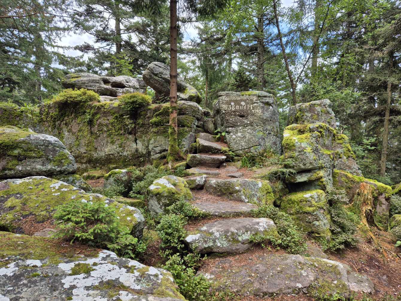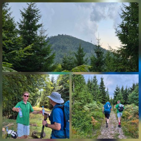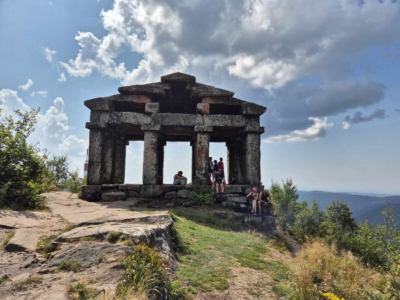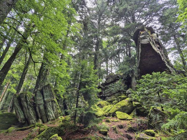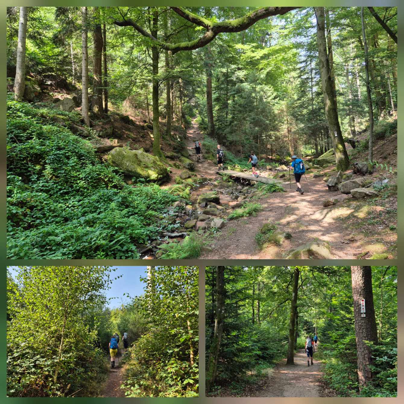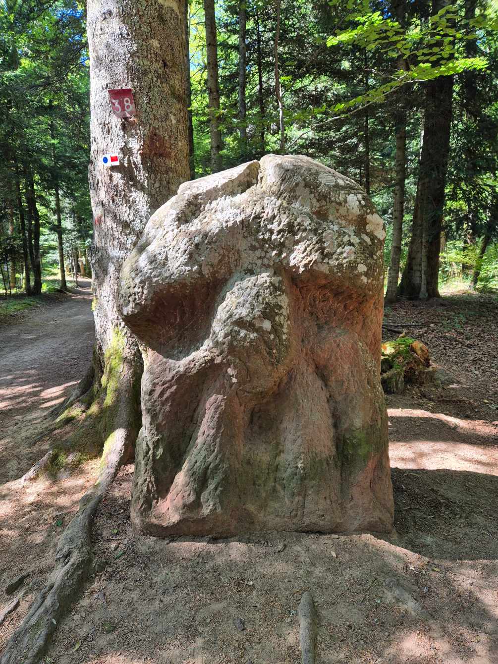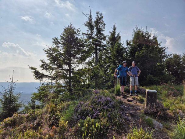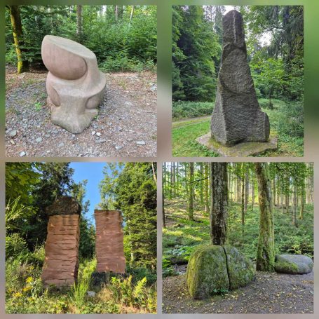 Tagesbericht: Um 6:00 Uhr weckt uns vor dem Wecker großes Glockengeläut, wie man es aus Bayern kennt. Die sehr freundliche Wirtin hat uns Frühstück sogar auf 7:00 Uhr angeboten - was wir gerne annehmen. Nach der Verabschiedung von Barbara und Joachim setzen wir unseren Weg fort. Zuerst geht es eine ganze Weile mit nur leichtem Anstieg auf breitem Weg durch den Wald. Dabei kommen wir an einigen Steinskulpturen vorbei - "Kunst im Wald". Angenehm erfrischend wirkt ein kleines Bächlein, an dem wir entlang laufen. Nach gut 1,5 Stunden schwenken wir auf einen schmalen, steileren und schönen Pfad ein. Und dann passiert uns ein wirkliches Missgeschick: Peters digitaler Track zeigt geradeaus - unsere Wegmarkierung weist aber links abbiegend; wir entscheiden uns für die Wegmarkierung und verpassen dann aber in der Folge irgendeine weitere Abzweigung - nach einer ganzen Weile werden wir skeptisch und checken die Lage mit der digitalen Karte: wir sind viel zu weit von unserem Weg abgekommen - ein Zurück würde uns zu viel Zeit kosten - also geht es nur noch vorwärts und irgendwie wieder auf unseren Weg treffen. Was Peter natürlich gelingt, aber wir haben damit einen Gipfel und eine sehenswerte Felsformation "verpasst". Um uns neu zu sortieren, legen wir eine kleine Rast ein - "es ist wie es ist" - und weiter geht's auf angenehmem Waldweg relativ eben. Bald schon haben wir dieselbe Situation: Peters Track weist geradeaus, die Wegmarkierung biegt ab. Wir beraten uns und entscheiden uns erneut für die Wegmarkierung, aber dieses Mal passen wir auf wie die Luchse, dass in absehbarer Zeit weitere Wegmarkierungen folgen. An einem Rastplatz legen wir eine Pause eine (Track und Wegmarkierung sind mittlerweile wieder deckungsgleich); zwei freundliche Franzosen -ebenfalls auf größerer Wanderschaft- (wir hatten sie auch gestern bereits gesehen) weisen uns auf eine nur 200m entfernte Quelle hin. Peter "spurtet" ohne Rucksack los und füllt unsere Wasserflaschen auf; so kühles Quellwasser erfrischt und flotten Schrittes geht es auf angenehmem Weg weiter. Seit dem Mittag sind erst vereinzelt, dann mehr Wolken aufgezogen und links von uns wird es etwas dunkler am Himmel. Als wir ein entferntes Donnergrollen hören, beschleunigt sich automatisch unser Schritt. Gut 30 min vor der vereinbarten Zeit sind wir am Treffpunkt - aber Ulli ist auch schon da und erwartet/begrüßt uns mit frischem Wasser. Zu dritt setzen wir den Weg fort, wo schon bald der sehr steile Schlussanstieg auf fast alpinen Pfädchen auf das Gipfelplateau des Grand Donon (1009m) vor uns liegt, mit seinem Wahrzeichen - dem Tempelchen im römischen Stil. Oben angekommen ist der Ausblick in alle Richtungen absolut begeisternd! Alle Gewitter sind entfernt an uns vorbeigezogen und wir sind trocken geblieben. "Auf der anderen Seite" machen wir uns schließlich an den nicht ganz so steilen Abstieg, der aber durch große Unebenheiten und Geröll nochmals alle Aufmerksamkeit erfordert. Dann erreichen wir unser Hotel auf der Plateforme du Donon; ein touristischer Hotspot - was sich in Service, Ausstattung, Menschenmenge etc. bermerkbar macht. Aber für eine Nacht muss und wird es gehen. Erstmals schreibt Michaela den Bericht im Frühstücksraum, weil das WLAN nicht bis ins Zimmer reicht. Peter versucht, mit offener Zimmertür und offenem Fenster die Wärme aus unserem Zimmer zu bekommen, die die defekte Klimaanlage in (!!) unser Zimmer geblasen hat (auf unsere Beschwerde hin, wird uns gesagt, wir könnten ja woanders hingehen...). Ein schöner Wandertag mit ungeplanten Ereignissen geht zu Ende.