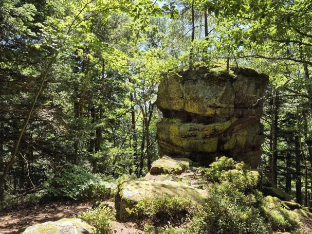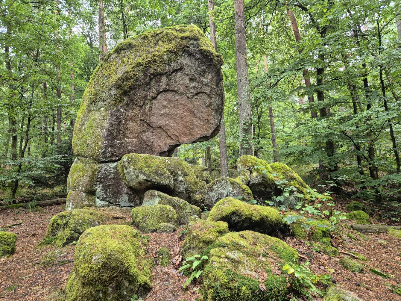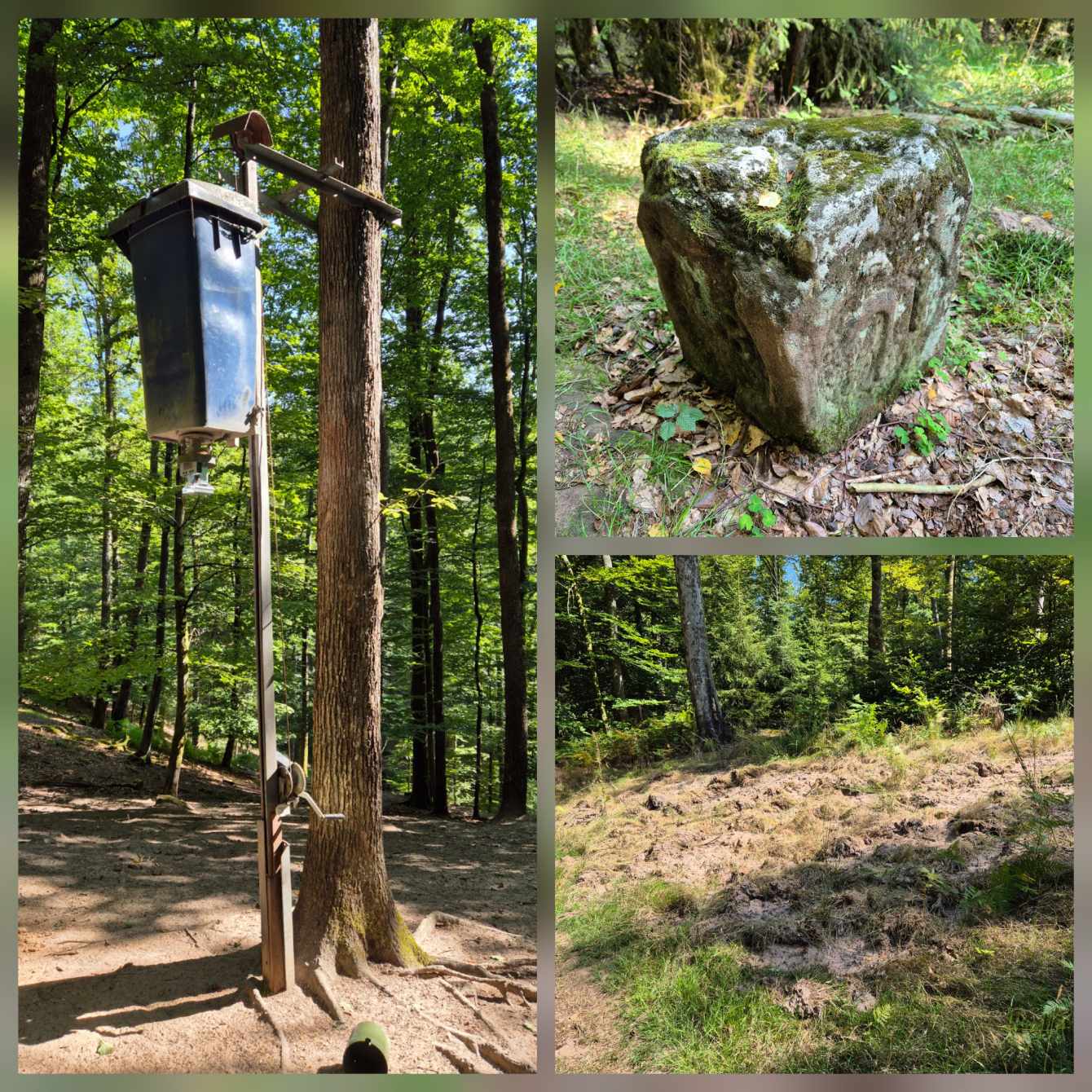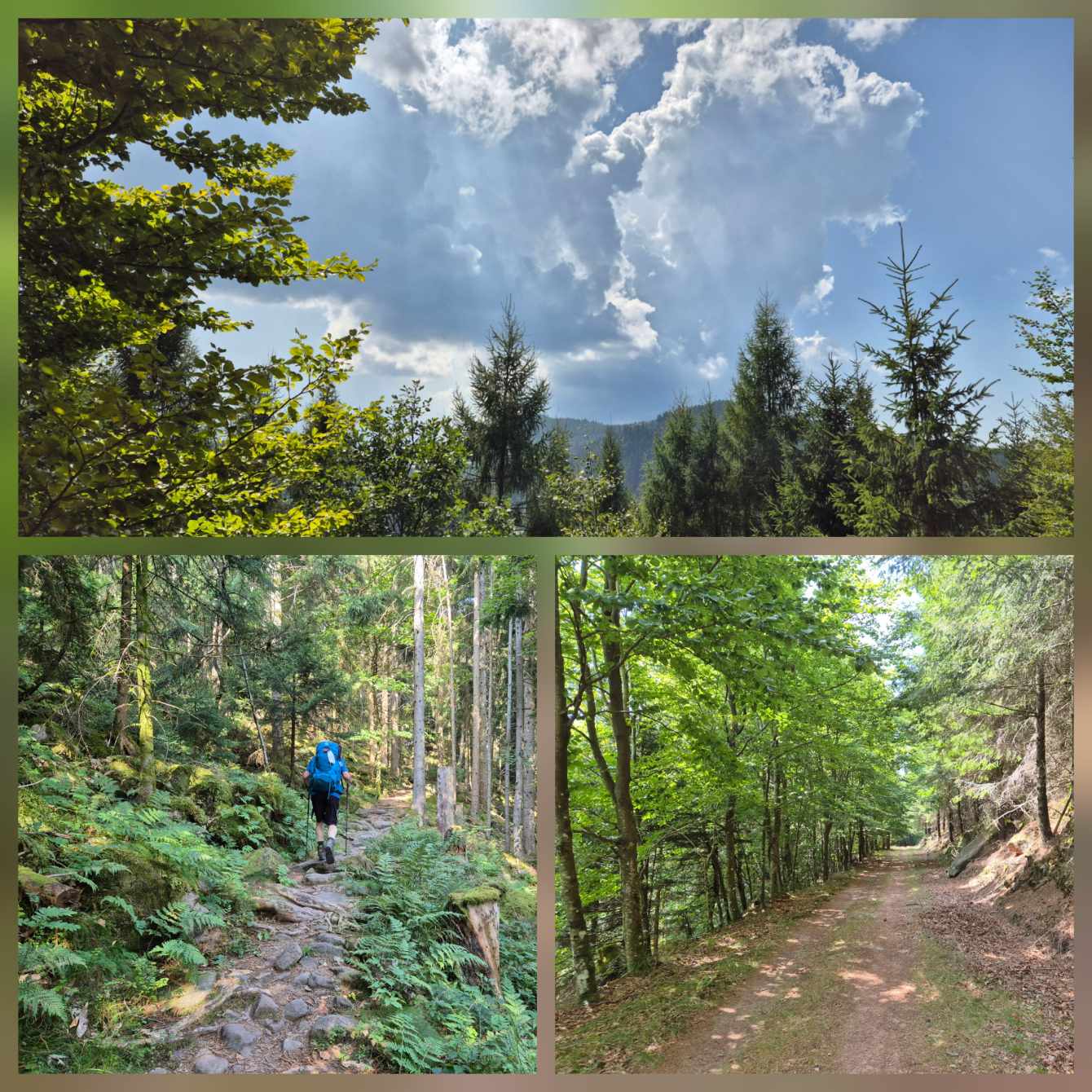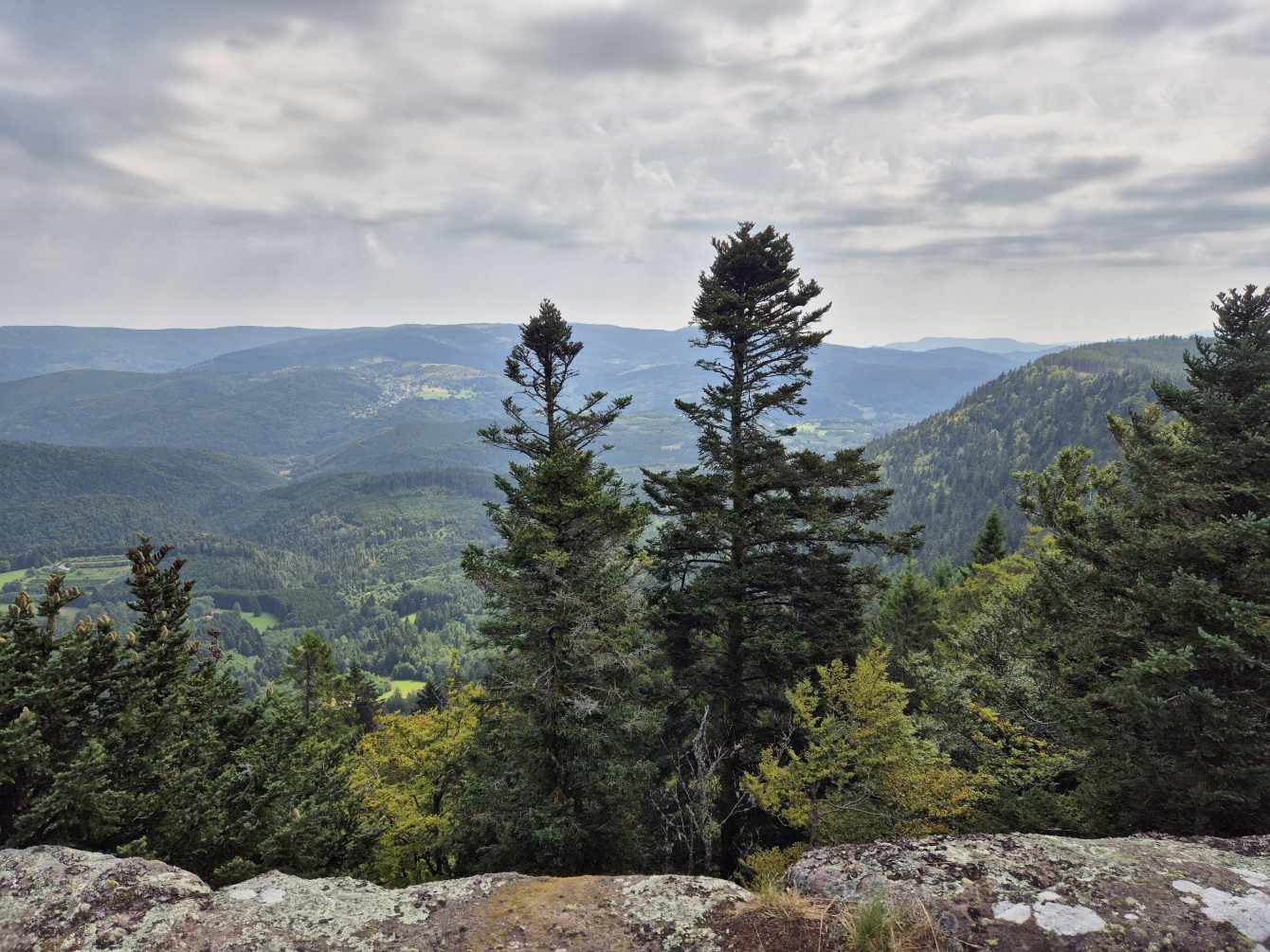 Tagesbericht: Um 6:00 Uhr weckt uns vor dem Wecker großes Glockengeläut, wie man es aus Bayern kennt. Die sehr freundliche Wirtin hat uns Frühstück sogar auf 7:00 Uhr angeboten - was wir gerne annehmen. Nach der Verabschiedung von Barbara und Joachim setzen wir unseren Weg fort. Zuerst geht es eine ganze Weile mit nur leichtem Anstieg auf breitem Weg durch den Wald. Dabei kommen wir an einigen Steinskulpturen vorbei - "Kunst im Wald". Angenehm erfrischend wirkt ein kleines Bächlein, an dem wir entlang laufen. Nach gut 1,5 Stunden schwenken wir auf einen schmalen, steileren und schönen Pfad ein. Und dann passiert uns ein wirkliches Missgeschick: Peters digitaler Track zeigt geradeaus - unsere Wegmarkierung weist aber links abbiegend; wir entscheiden uns für die Wegmarkierung und verpassen dann aber in der Folge irgendeine weitere Abzweigung - nach einer ganzen Weile werden wir skeptisch und checken die Lage mit der digitalen Karte: wir sind viel zu weit von unserem Weg abgekommen - ein Zurück würde uns zu viel Zeit kosten - also geht es nur noch vorwärts und irgendwie wieder auf unseren Weg treffen. Was Peter natürlich gelingt, aber wir haben damit einen Gipfel und eine sehenswerte Felsformation "verpasst". Um uns neu zu sortieren, legen wir eine kleine Rast ein - "es ist wie es ist" - und weiter geht's auf angenehmem Waldweg relativ eben. Bald schon haben wir dieselbe Situation: Peters Track weist geradeaus, die Wegmarkierung biegt ab. Wir beraten uns und entscheiden uns erneut für die Wegmarkierung, aber dieses Mal passen wir auf wie die Luchse, dass in absehbarer Zeit weitere Wegmarkierungen folgen. An einem Rastplatz legen wir eine Pause eine (Track und Wegmarkierung sind mittlerweile wieder deckungsgleich); zwei freundliche Franzosen -ebenfalls auf größerer Wanderschaft- (wir hatten sie auch gestern bereits gesehen) weisen uns auf eine nur 200m entfernte Quelle hin. Peter "spurtet" ohne Rucksack los und füllt unsere Wasserflaschen auf; so kühles Quellwasser erfrischt und flotten Schrittes geht es auf angenehmem Weg weiter. Seit dem Mittag sind erst vereinzelt, dann mehr Wolken aufgezogen und links von uns wird es etwas dunkler am Himmel. Als wir ein entferntes Donnergrollen hören, beschleunigt sich automatisch unser Schritt. Gut 30 min vor der vereinbarten Zeit sind wir am Treffpunkt - aber Ulli ist auch schon da und erwartet/begrüßt uns mit frischem Wasser. Zu dritt setzen wir den Weg fort, wo schon bald der sehr steile Schlussanstieg auf fast alpinen Pfädchen auf das Gipfelplateau des Grand Donon (1009m) vor uns liegt, mit seinem Wahrzeichen - dem Tempelchen im römischen Stil. Oben angekommen ist der Ausblick in alle Richtungen absolut begeisternd! Alle Gewitter sind entfernt an uns vorbeigezogen und wir sind trocken geblieben. "Auf der anderen Seite" machen wir uns schließlich an den nicht ganz so steilen Abstieg, der aber durch große Unebenheiten und Geröll nochmals alle Aufmerksamkeit erfordert. Dann erreichen wir unser Hotel auf der Plateforme du Donon; ein touristischer Hotspot - was sich in Service, Ausstattung, Menschenmenge etc. bermerkbar macht. Aber für eine Nacht muss und wird es gehen. Erstmals schreibt Michaela den Bericht im Frühstücksraum, weil das WLAN nicht bis ins Zimmer reicht. Peter versucht, mit offener Zimmertür und offenem Fenster die Wärme aus unserem Zimmer zu bekommen, die die defekte Klimaanlage in (!!) unser Zimmer geblasen hat (auf unsere Beschwerde hin, wird uns gesagt, wir könnten ja woanders hingehen...). Ein schöner Wandertag mit ungeplanten Ereignissen geht zu Ende.