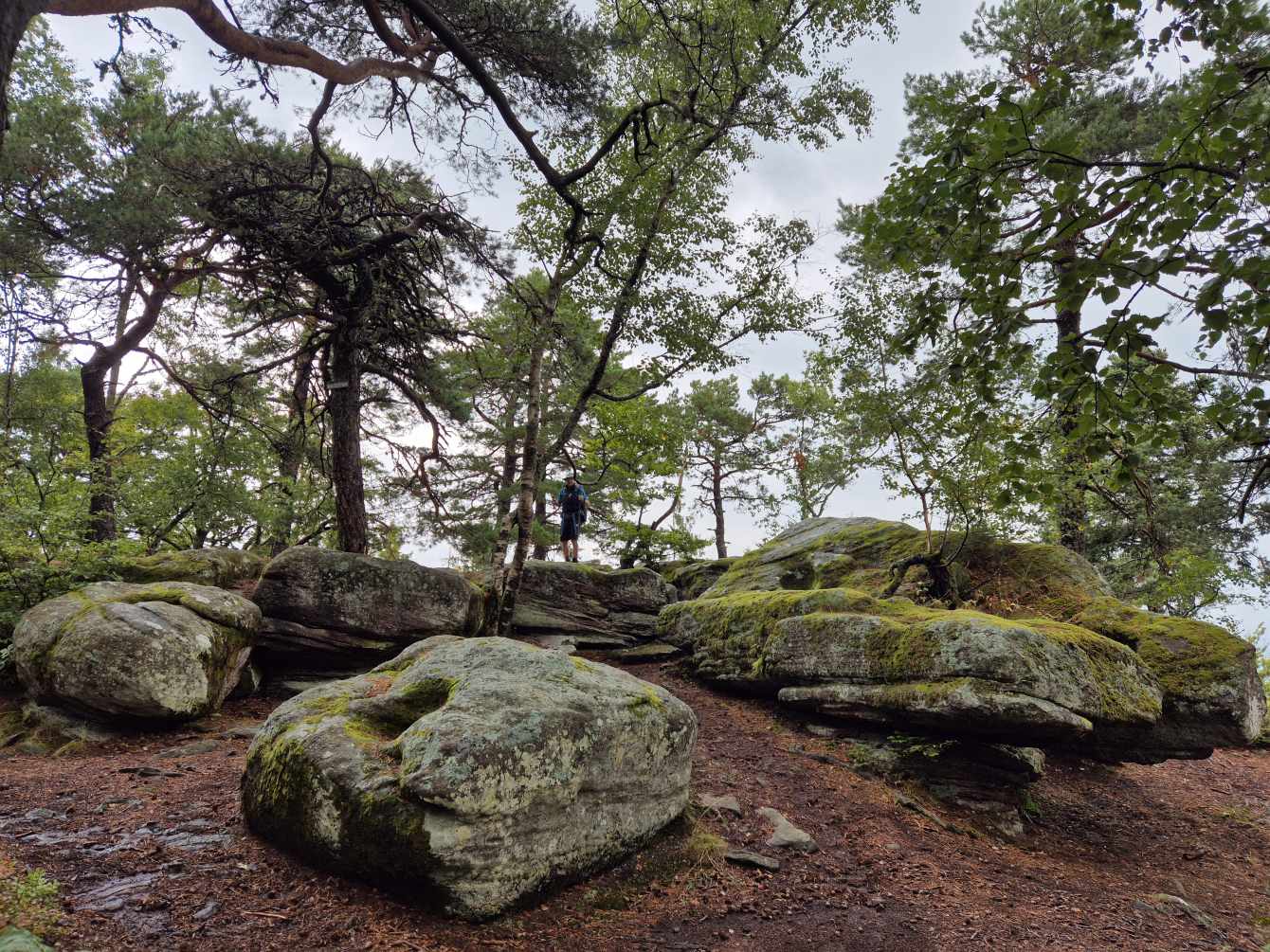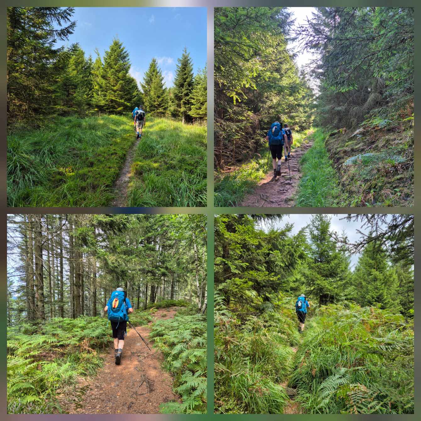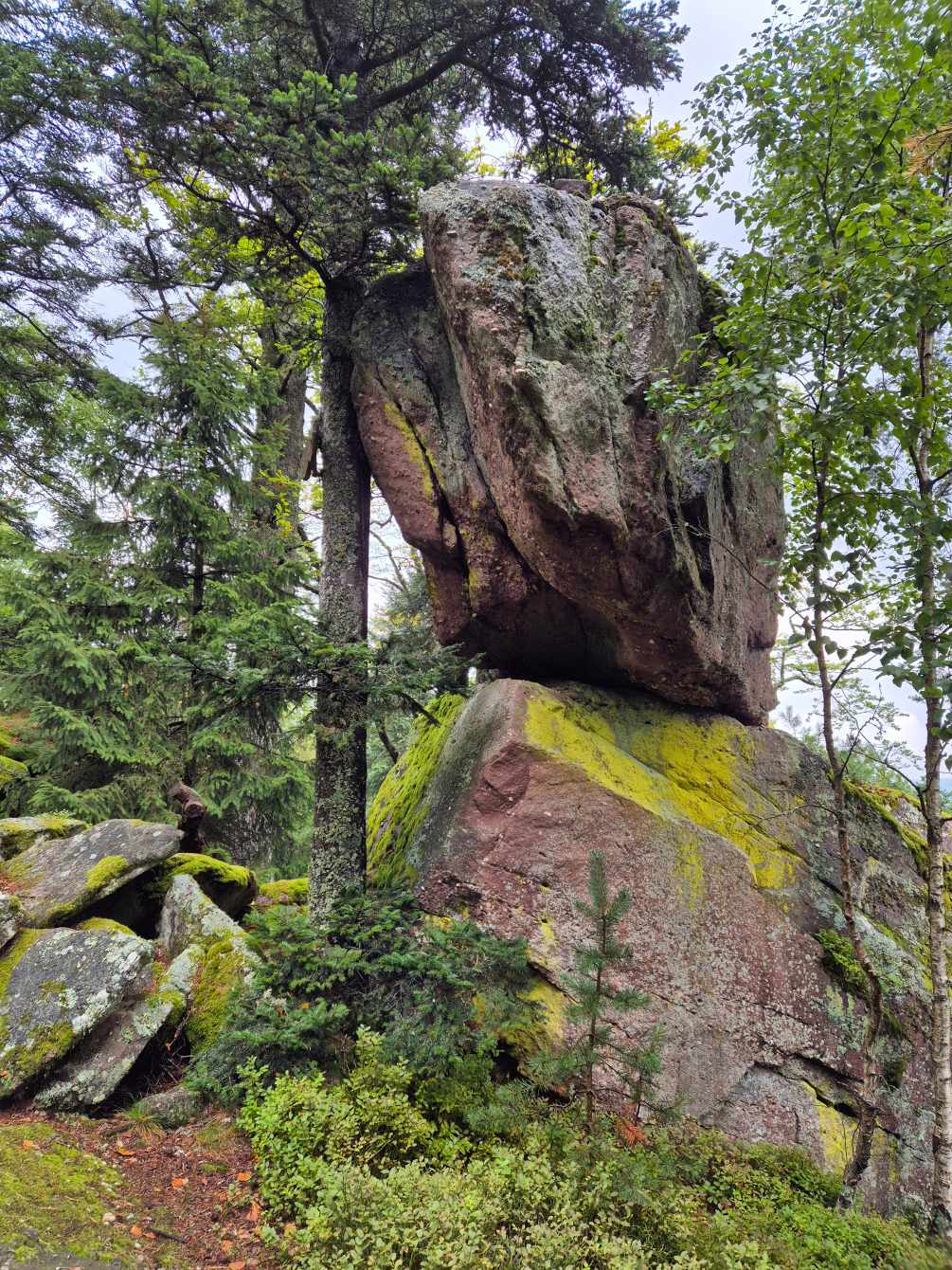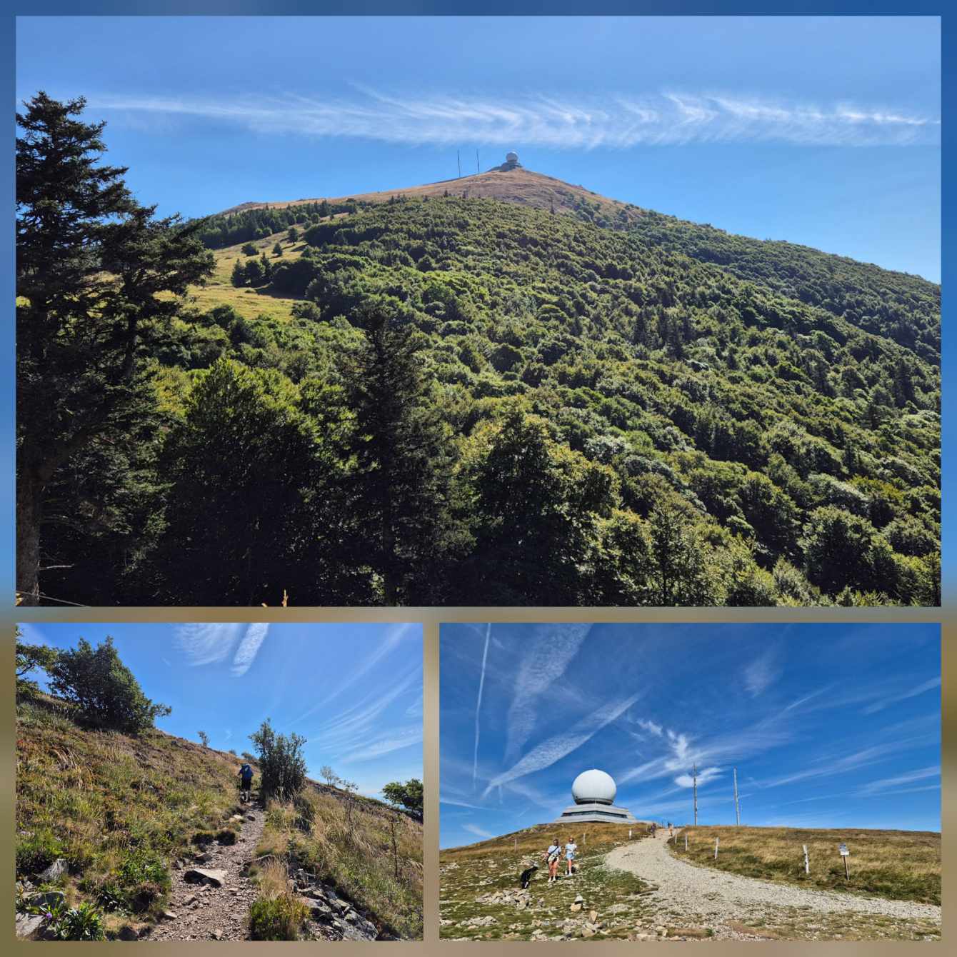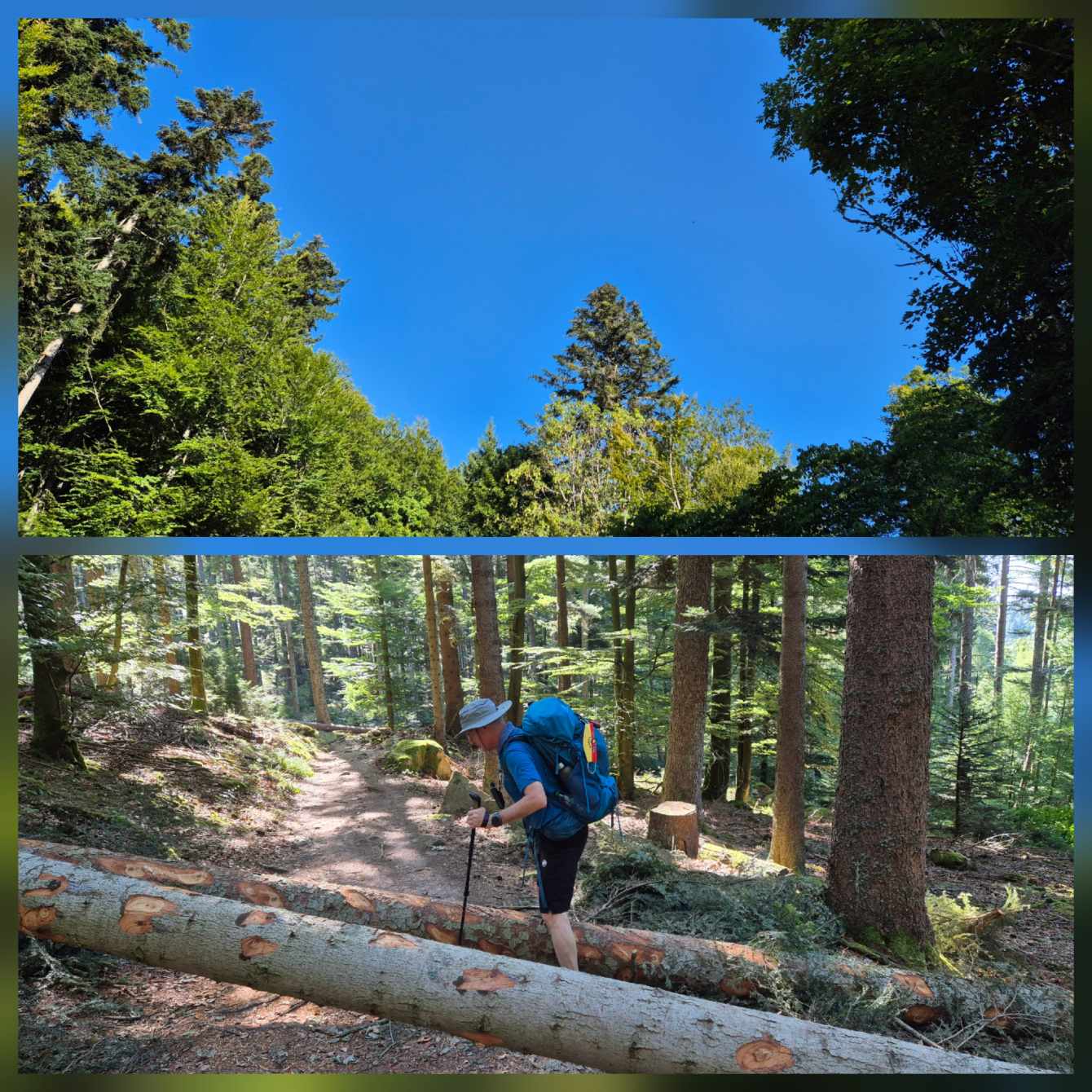 Tagesbericht: Um 6:00 Uhr weckt uns vor dem Wecker großes Glockengeläut, wie man es aus Bayern kennt. Die sehr freundliche Wirtin hat uns Frühstück sogar auf 7:00 Uhr angeboten - was wir gerne annehmen. Nach der Verabschiedung von Barbara und Joachim setzen wir unseren Weg fort. Zuerst geht es eine ganze Weile mit nur leichtem Anstieg auf breitem Weg durch den Wald. Dabei kommen wir an einigen Steinskulpturen vorbei - "Kunst im Wald". Angenehm erfrischend wirkt ein kleines Bächlein, an dem wir entlang laufen. Nach gut 1,5 Stunden schwenken wir auf einen schmalen, steileren und schönen Pfad ein. Und dann passiert uns ein wirkliches Missgeschick: Peters digitaler Track zeigt geradeaus - unsere Wegmarkierung weist aber links abbiegend; wir entscheiden uns für die Wegmarkierung und verpassen dann aber in der Folge irgendeine weitere Abzweigung - nach einer ganzen Weile werden wir skeptisch und checken die Lage mit der digitalen Karte: wir sind viel zu weit von unserem Weg abgekommen - ein Zurück würde uns zu viel Zeit kosten - also geht es nur noch vorwärts und irgendwie wieder auf unseren Weg treffen. Was Peter natürlich gelingt, aber wir haben damit einen Gipfel und eine sehenswerte Felsformation "verpasst". Um uns neu zu sortieren, legen wir eine kleine Rast ein - "es ist wie es ist" - und weiter geht's auf angenehmem Waldweg relativ eben. Bald schon haben wir dieselbe Situation: Peters Track weist geradeaus, die Wegmarkierung biegt ab. Wir beraten uns und entscheiden uns erneut für die Wegmarkierung, aber dieses Mal passen wir auf wie die Luchse, dass in absehbarer Zeit weitere Wegmarkierungen folgen. An einem Rastplatz legen wir eine Pause eine (Track und Wegmarkierung sind mittlerweile wieder deckungsgleich); zwei freundliche Franzosen -ebenfalls auf größerer Wanderschaft- (wir hatten sie auch gestern bereits gesehen) weisen uns auf eine nur 200m entfernte Quelle hin. Peter "spurtet" ohne Rucksack los und füllt unsere Wasserflaschen auf; so kühles Quellwasser erfrischt und flotten Schrittes geht es auf angenehmem Weg weiter. Seit dem Mittag sind erst vereinzelt, dann mehr Wolken aufgezogen und links von uns wird es etwas dunkler am Himmel. Als wir ein entferntes Donnergrollen hören, beschleunigt sich automatisch unser Schritt. Gut 30 min vor der vereinbarten Zeit sind wir am Treffpunkt - aber Ulli ist auch schon da und erwartet/begrüßt uns mit frischem Wasser. Zu dritt setzen wir den Weg fort, wo schon bald der sehr steile Schlussanstieg auf fast alpinen Pfädchen auf das Gipfelplateau des Grand Donon (1009m) vor uns liegt, mit seinem Wahrzeichen - dem Tempelchen im römischen Stil. Oben angekommen ist der Ausblick in alle Richtungen absolut begeisternd! Alle Gewitter sind entfernt an uns vorbeigezogen und wir sind trocken geblieben. "Auf der anderen Seite" machen wir uns schließlich an den nicht ganz so steilen Abstieg, der aber durch große Unebenheiten und Geröll nochmals alle Aufmerksamkeit erfordert. Dann erreichen wir unser Hotel auf der Plateforme du Donon; ein touristischer Hotspot - was sich in Service, Ausstattung, Menschenmenge etc. bermerkbar macht. Aber für eine Nacht muss und wird es gehen. Erstmals schreibt Michaela den Bericht im Frühstücksraum, weil das WLAN nicht bis ins Zimmer reicht. Peter versucht, mit offener Zimmertür und offenem Fenster die Wärme aus unserem Zimmer zu bekommen, die die defekte Klimaanlage in (!!) unser Zimmer geblasen hat (auf unsere Beschwerde hin, wird uns gesagt, wir könnten ja woanders hingehen...). Ein schöner Wandertag mit ungeplanten Ereignissen geht zu Ende.