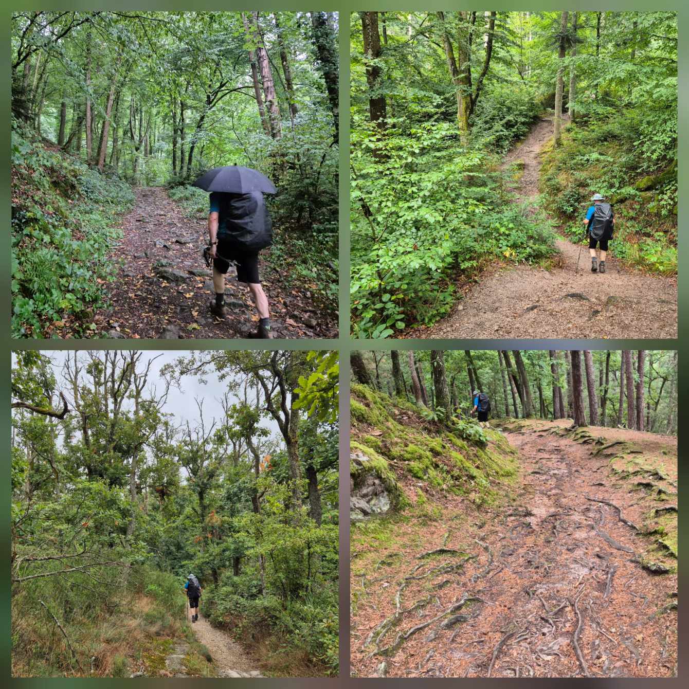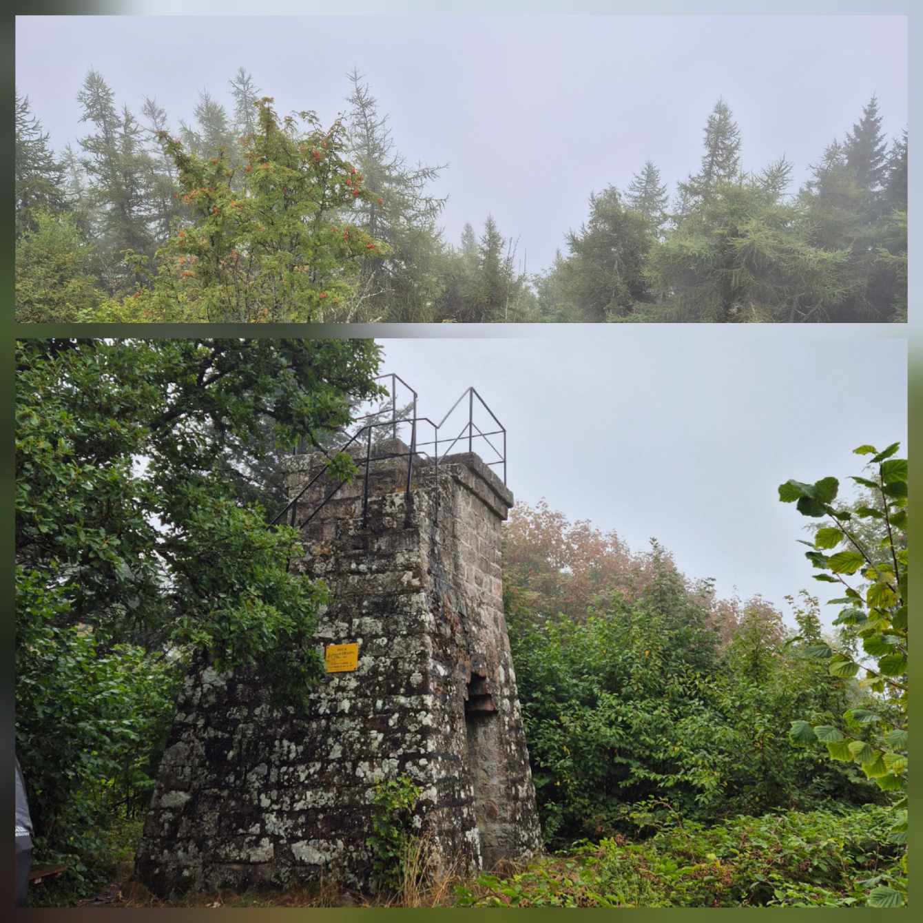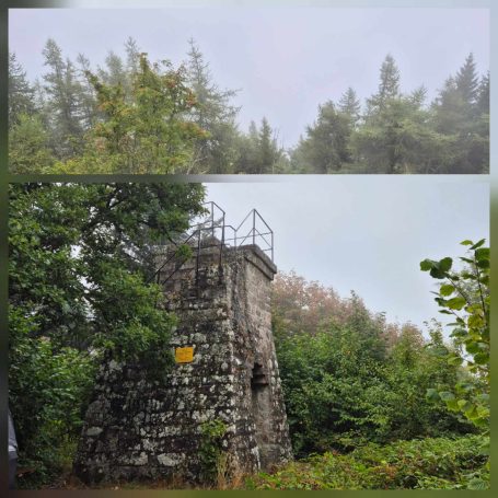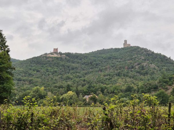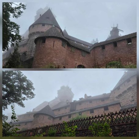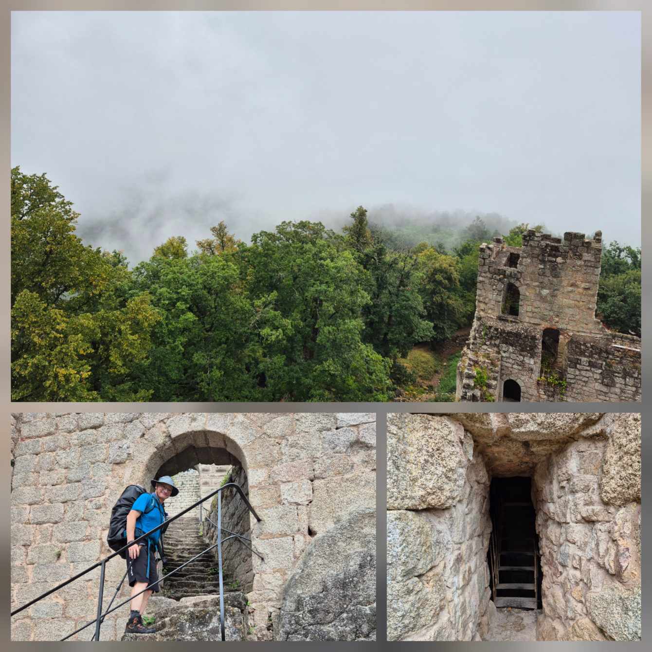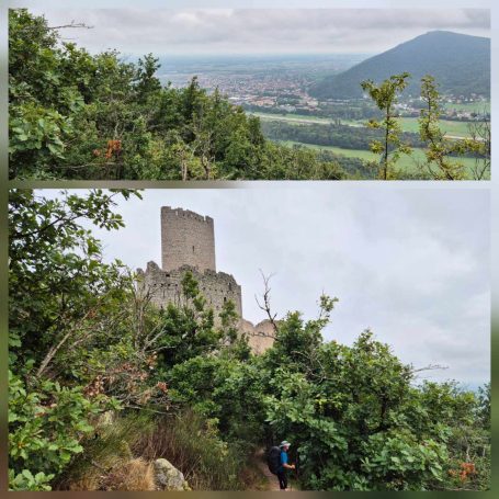 Tagesbericht: Nach dem Aufwachen durch den Wecker dringt sofort das Regen-Geräusch an unser Ohr - so war es vorhergesagt - so ist es gekommen. Nachdem die Temperatur aber angenehm und der Regen nur leicht ist, starten wir nach dem ausgiebigen Frühstück mit Regenschirm in den Tag und halten uns an Karl Valentin "Ich freue mich, wenn es regnet; wenn ich mich nicht freue, regnet es auch". Es geht aus Andlau raus und dann auf gut gehbaren Waldwegen kontinuierlich leicht bergauf; bald wechseln sich schmalere Pfade und Wege ab, aber immer ansteigend. Wir sind über diese "einfachen" Wege froh, da die Nässe natürlich dazu führt, dass Steine und Wurzeln stellenweise rutschig werden. Nach 2,5 Stunden erreichen wir den Gipfel des Ungersberg (901m) mit einem kleinen Aussichtsturm, von dem aus man einen eindrucksvollen Blick in die Rheinebene haben können sollte - bei uns war da nichts zu sehen - und so machen wir uns wieder an den Abstieg, zuerst etwas steiler und steiniger, bald wieder auf gut gehbaren Pfaden und Wegen. Der Regen hört auf und wir folgen unserem Weg in leichtem auf und ab. Leider ist weit und breit keine nette Schutzhütte in Sicht (wie wir sie schon gelegentlich hatten), so dass eine feuchte Bank im Freien zur Mittagsrast ausreichen muss und Peters faltbare Thermositzkissen zum Einsatz kommen. Am Nachmittag kommen wir zuerst am kleinen "Rocher de l'Âne" (Eselsfels) vorbei und bald darauf erreichen wir die Ruine Bernstein. Wir geben alles und besteigen über eine superschmale, enge, dunkle Treppe den Turm - und haben erneut Null-Komma-Null Aussicht. Als nächstes passieren wir die Ruine Ortenbourg (deren Turm nicht bestiegen werden kann) - an dieser Stelle haben wir für heute erstmals einen klitzekleinen Ausblick. Auf schmalem Pfad steigen wir noch ganz in die Ebene ab und erreichen bald darauf das nette Örtchen Châtenois und unser Hotel. Da das Hotel-Restaurant heute Ruhetag hat, folgen wir einer Empfehlung der Wirtin und speisen in einem nur 100 m entfernten Restaurant wirklich ausgezeichnet.
