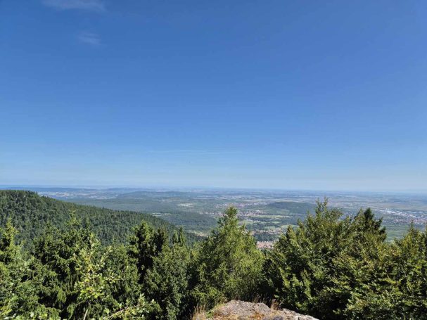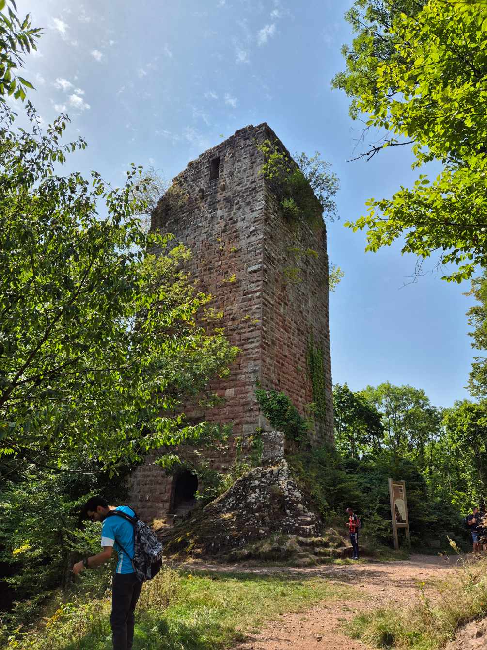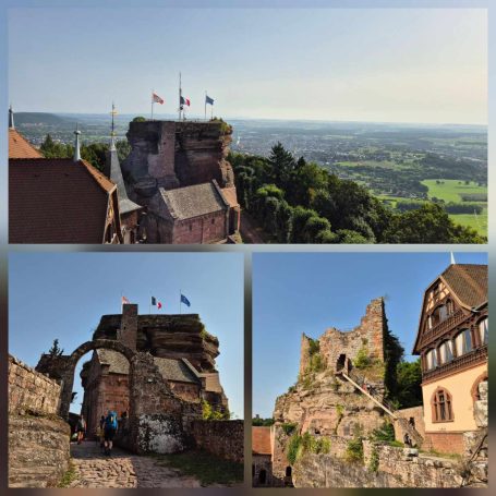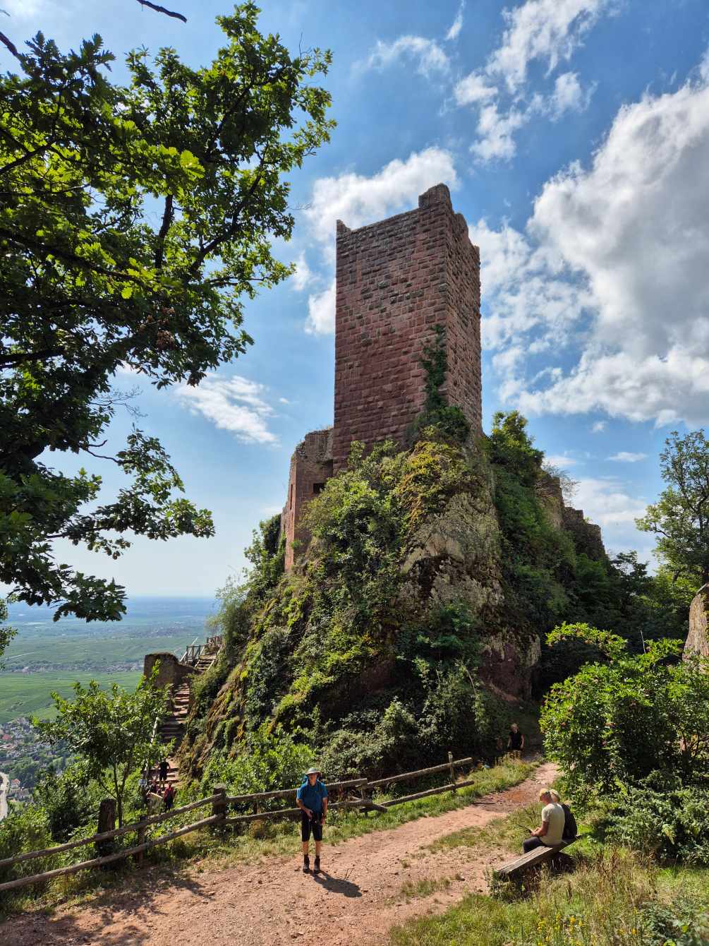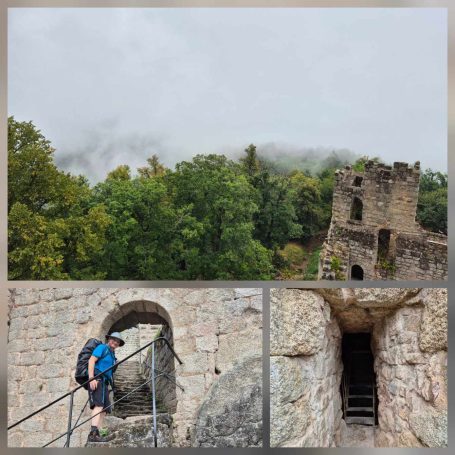 Tagesbericht: Aus unbekanntem Grund haben wir beide nicht gut geschlafen, obwohl die Müdigkeit ausreichend groß gewesen war. Aufgrund der Efeu-bewachsenen Hausfassade haben wir die einfach verglasten Fenster geschlossen gelassen, um kein Viechzeug ins Zimmer zu bekommen - mit dem Ergebnis, dass unsere gewaschene Wanderkleidung noch etwas klamm ist. Mit dem Föhn wärmen wir sie etwas an - der Rest trocknet am Körper. Erneut sind wir um 8:00 Uhr die Ersten beim Frühstück, das deutlich französischer ist, aber zur Stärkung vollkommen ausreicht; der hausgemachte Mirabellenkuchen ist ausgezeichnet! Beim Zahlen kann es die Wirtin kaum glauben, dass wir am Abend zuvor keinen Wein zum Essen hatten - das wird uns vermutlich noch ein paar Mal passieren. Michaela ist etwas genervt, weil das Hotel von DIenstag eine Email geschrieben hat und auf einmal Frühstück, Abendessen und Rezeptionsöffnung anders sind als vorher reserviert. Das müssen wir uns abends nochmals genauer anschauen - jetzt geht's erst einmal los. Bei noch angenehmer Wärme und strahlendem Sonnenschein verlassen wir den Ort und stellen fest, dass Peters Navi anders möchte als die Wegmarkierung weist... ...nach kurzer Überlegung folgen wir dem ausgewiesenen Weg, der in einer Ehrenschleife noch einen Zugang zu eine Ruine mitnimmt, auf die wir aber verzichten, da unsere heutige Strecke bereits lang genug ist. Seit Verlassen des Ortes geht es stetig bergauf und es stellt sich nicht mehr die Frage, ob unsere Kleidung trocken war, da wir bereits wieder ausreichend schwitzen. Auf wechselnden Wald- und gelegentichen Forstwegen geht es mehrheitlich bergauf; ganz gelegentlich begegnen uns Menschen. Wir erklimmen die Anhöhe der Burgruine Vieux-WIndstein - aber "die kann nichts" und wir steigen wieder ab. Etwas später, nach einem weiteren knackigen Anstieg, erreichen wir die Ruine Neuf-Windstein, von der aus man einen schönen Ausblick auf den umliegenden Wald hat. Der weitere Weg ist schön, aber ohne besondere Highlights, An- und Abstiege wechseln sich ab. Um 12:30 Uhr - Streckenhalbzeit - bietet sich ein Rastplatz für eine Mittagspause mit Nüssen und Feigen an. Etwas erholt geht es anschließend weiter und nach nur rund 1 km kommen wir an eine sonntags bewirtschaftete Hütte und machen für ein großes Apfelschorle kurz nochmals Rast. Anschließend folgt ein Weg in Serpentinen den Berg hinauf zu einem Aussichtsturm. Wir hätten ihn bestiegen - aber es führt nur eine sehr enge Buntsandsteintreppe mit schmalen, sehr ausgetretenen Stiegen, fast im Dunkeln nach oben - nein, ein unnötiges Risiko müssen wir nicht eingehen - und so geht es auf der anderen Seite des Berges wieder nach unten.