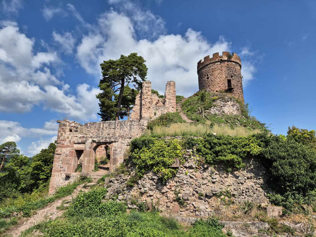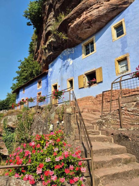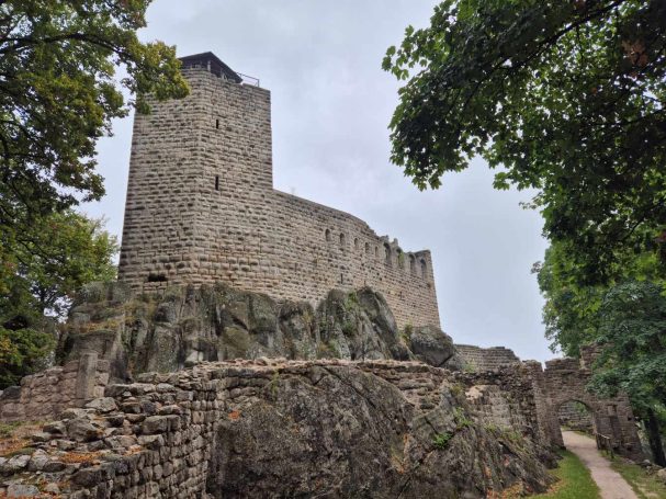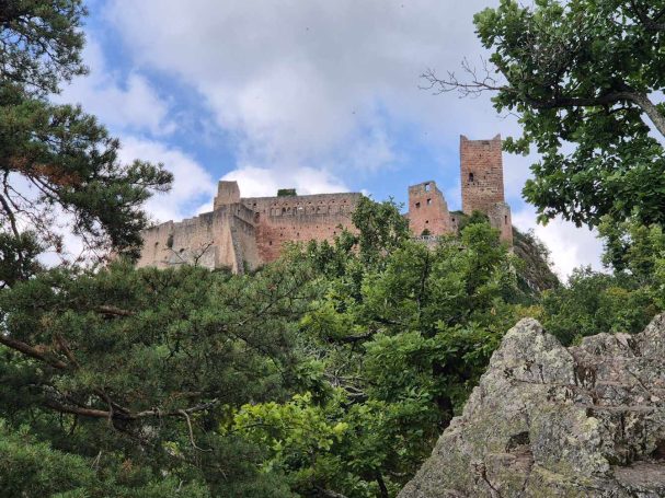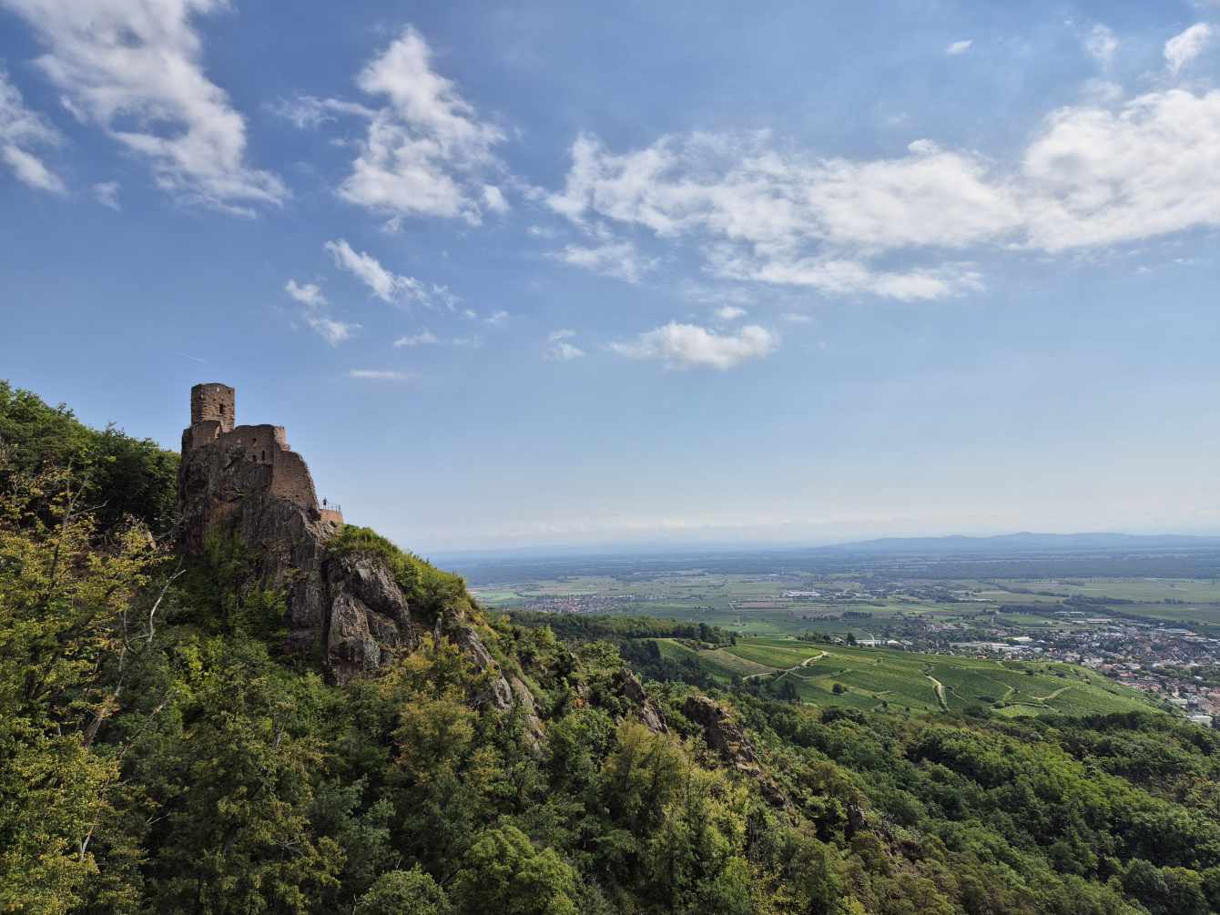 Tagesbericht: Aus unbekanntem Grund haben wir beide nicht gut geschlafen, obwohl die Müdigkeit ausreichend groß gewesen war. Aufgrund der Efeu-bewachsenen Hausfassade haben wir die einfach verglasten Fenster geschlossen gelassen, um kein Viechzeug ins Zimmer zu bekommen - mit dem Ergebnis, dass unsere gewaschene Wanderkleidung noch etwas klamm ist. Mit dem Föhn wärmen wir sie etwas an - der Rest trocknet am Körper. Erneut sind wir um 8:00 Uhr die Ersten beim Frühstück, das deutlich französischer ist, aber zur Stärkung vollkommen ausreicht; der hausgemachte Mirabellenkuchen ist ausgezeichnet! Beim Zahlen kann es die Wirtin kaum glauben, dass wir am Abend zuvor keinen Wein zum Essen hatten - das wird uns vermutlich noch ein paar Mal passieren. Michaela ist etwas genervt, weil das Hotel von DIenstag eine Email geschrieben hat und auf einmal Frühstück, Abendessen und Rezeptionsöffnung anders sind als vorher reserviert. Das müssen wir uns abends nochmals genauer anschauen - jetzt geht's erst einmal los. Bei noch angenehmer Wärme und strahlendem Sonnenschein verlassen wir den Ort und stellen fest, dass Peters Navi anders möchte als die Wegmarkierung weist... ...nach kurzer Überlegung folgen wir dem ausgewiesenen Weg, der in einer Ehrenschleife noch einen Zugang zu eine Ruine mitnimmt, auf die wir aber verzichten, da unsere heutige Strecke bereits lang genug ist. Seit Verlassen des Ortes geht es stetig bergauf und es stellt sich nicht mehr die Frage, ob unsere Kleidung trocken war, da wir bereits wieder ausreichend schwitzen. Auf wechselnden Wald- und gelegentichen Forstwegen geht es mehrheitlich bergauf; ganz gelegentlich begegnen uns Menschen. Wir erklimmen die Anhöhe der Burgruine Vieux-WIndstein - aber "die kann nichts" und wir steigen wieder ab. Etwas später, nach einem weiteren knackigen Anstieg, erreichen wir die Ruine Neuf-Windstein, von der aus man einen schönen Ausblick auf den umliegenden Wald hat. Der weitere Weg ist schön, aber ohne besondere Highlights, An- und Abstiege wechseln sich ab. Um 12:30 Uhr - Streckenhalbzeit - bietet sich ein Rastplatz für eine Mittagspause mit Nüssen und Feigen an. Etwas erholt geht es anschließend weiter und nach nur rund 1 km kommen wir an eine sonntags bewirtschaftete Hütte und machen für ein großes Apfelschorle kurz nochmals Rast. Anschließend folgt ein Weg in Serpentinen den Berg hinauf zu einem Aussichtsturm. Wir hätten ihn bestiegen - aber es führt nur eine sehr enge Buntsandsteintreppe mit schmalen, sehr ausgetretenen Stiegen, fast im Dunkeln nach oben - nein, ein unnötiges Risiko müssen wir nicht eingehen - und so geht es auf der anderen Seite des Berges wieder nach unten.