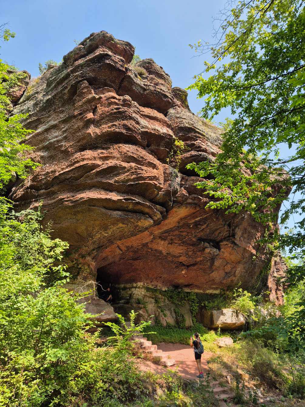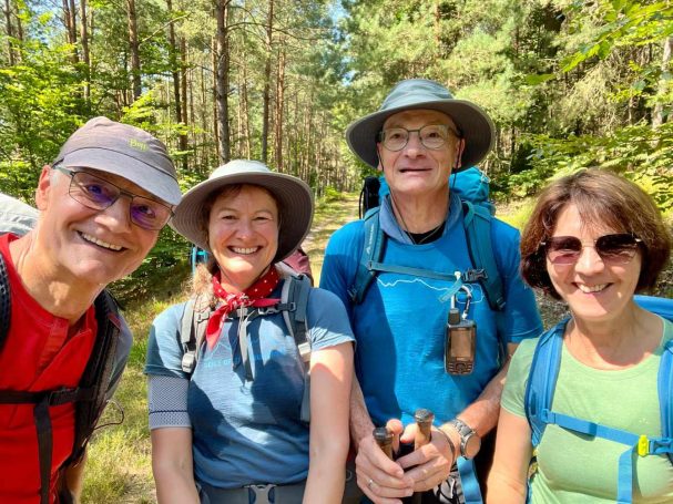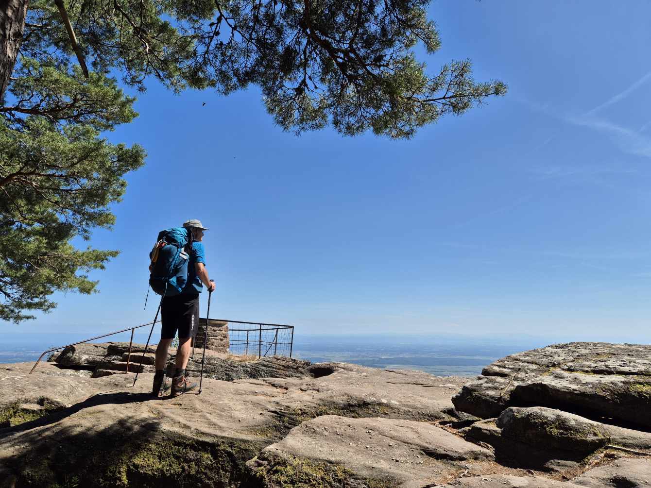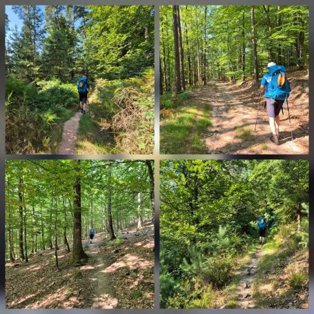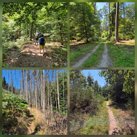 Tagesbericht: Nach einem eher französischen Frühstück starten wir wieder etwas erholt bei bereits guter Wärme in den neuen Tag. Unsere kleine Wandergruppe war auf 2 Hotels verteilt - aber problemlos finden wir zusammen und nehmen gemeinsam gleich den ersten Anstieg zur Ruine Le Haut-Barr in Angriff. Hier verweilen wir etwas und genießen die Aussicht, auch wenn es leider nicht 100% klar ist. Weiter geht es auf sehr schönen Pfaden auf und ab, mit wechselndem Wald. Wir kommen auf den Brotschberg mit einem 1897 vom VogesenClub errichteten Aussichtsturm, den Joachim und Patrick besteigen - die anderen legen eine kleine Pause ein. Wenig später erreichen wir von oben den Brotschfelsen, von dem aus man mit etwas Kraxelei erneut einen schönen Ausblick hat. In Serpentinen führt der Weg dann nach unten an den Felsfuß mit der beeindruckend großen "Grotte du Brotsch". Die Waldpfade bleiben begeisternd und nur gelegentlich sind kleine Abschnitte auf ebenfalls schönen Waldwegen und ganz selten müssen wir asphaltiert laufen. Es geht immer wieder auf und ab und gelegentlich ist ein Anstieg etwas knackiger oder ein Abstieg etwas steiler. Eine wirklich herrliche Strecke heute! Wir legen von Zeit zu Zeit eine kleine Pause ein - leider gibt es am Weg keine Einkehrmöglichkeit, so dass wir unsere Nuss-, Keks-, Riegel- Vorräte weiter plündern müssen. Wirklich anstrengend wird es mit der Zeit mit der Hitze, obwohl wir glücklicherweise fast vollständig im Wald laufen; auch die Wasservorräte werden knapp und wir sind froh, dass Joachim ein Wasseraufbereitssystem dabei hat, mit dem wir bedenkenlos an einem Wasserlauf Wasser schöpfen und filtern können. Quasi "ans Ende" der heutigen schönen Wege haben Patrick und Sandra ein Uber-Taxi an einen Treffpunkt bestellt, um sich zu ihrem Auto zurückbringen zu lassen - Peter, Michaela, Joachim und Barbara setzen den Weg noch knapp 3 km bis zum gebuchten Hotel in Wangenbourg fort, wo die heiß ersehnte Dusche für Erfrischung und Abkühlung sorgt. Das Abendessen ist ok, aber wir haben bisher deutlich besser gespeist gehabt. / Nachtrag: das Uber-Taxi hat kurz nach der vereinbarten Zeit die Reservierung gecancelt und Patrick und Sandra haben noch eine kleine Odyssee gehabt, bevor sie schlussendlich gut zu ihrem Auto und dann daheim angekommen sind.