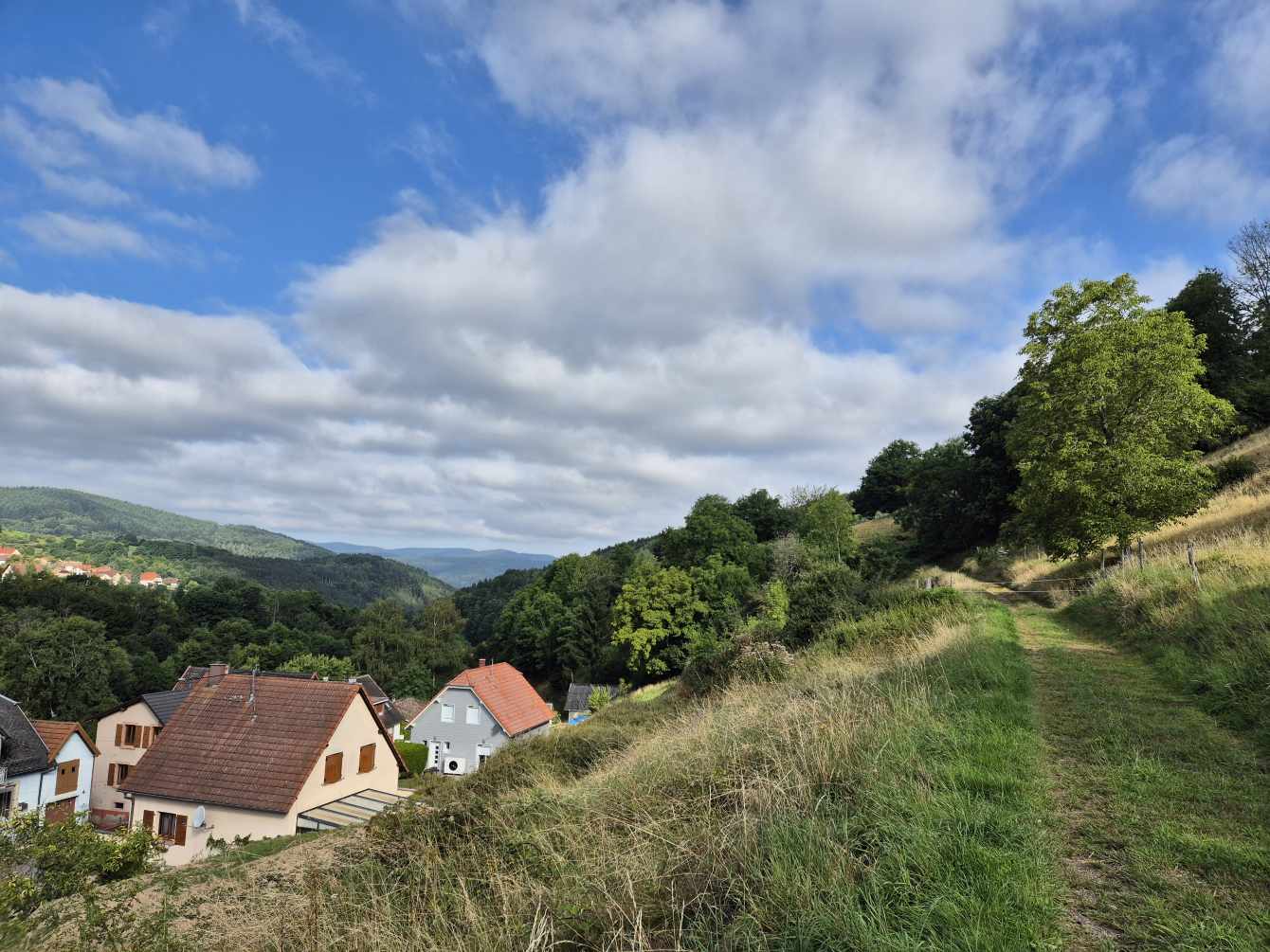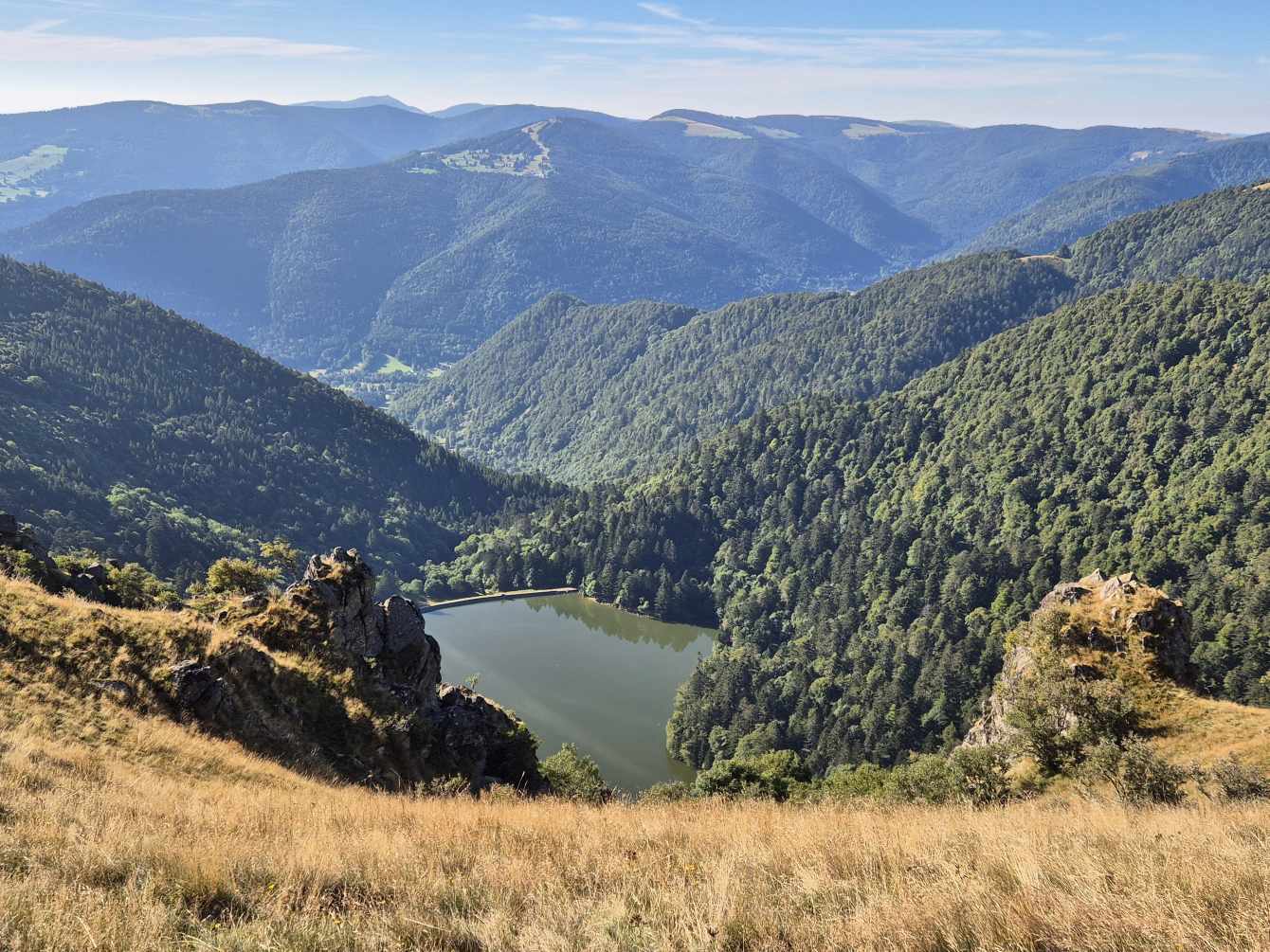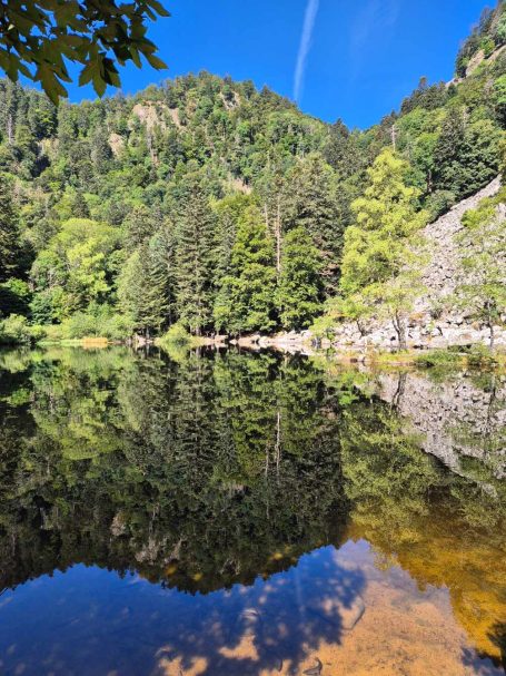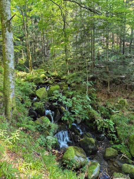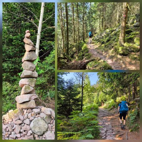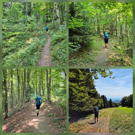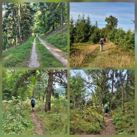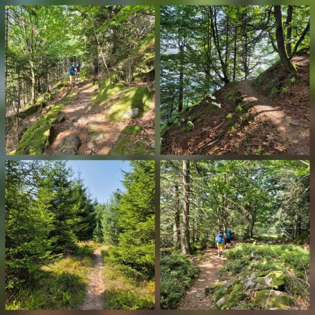 Tagesbericht: Bei 12 Zimmern und 2 WCs und 2 Waschräumen (mit je 1 Waschbecken) gehen wir von einem Engpass am Morgen aus und stellen den Wecker auf 6 Uhr, obwohl es erst um 8 Uhr Frühstück gibt - wir sind die Ersten im Bad. Angesichts unserer bevorstehenden Tour nehmen wir ergänzend zum französischen Frühstück noch eine Schüssel Müsli mit Banane -der Tag wird es zeigen- das trägt bis in den Nachmittag. Bei schönstem Wetter starten wir und haben schnell den Gipfel des Hohneck (1363 m) erreicht - wie am Vortag, als wir knapp unterhalb des Gipfels zu unserer Unterkunft abgebogen waren, ist der Rundum-Weitblick einfach begeisternd! Aber auch der "Tiefblick" ins Tal ist schön, zumal wir dort gaaaaanz weit unten den Stausee entdecken, an dem wir vorbei müssen. 1,5 Stunden geht es dann zünftig bergab auf Pfaden und schmalen Wegen -teil etwas blockig, teil angenehm- erst über sonnenbeschienene Wiesenhänge, später im Wald bis wir den Lac de Schiessrothried (930 m) erreicht haben. Und der teils steilere Abstieg geht weiter - nun entlang eines kleinen Bächleins, das munter bergab stürzt; bald darauf erreichen wir den kleinen Karsee Lac du Fischboedle (794 m). Weiter geht es bergab auf einem wirklich wunderschönen Pfad entlang besagten Bächleins, mal links davon, mal rechts davon, mal mehr, mal weniger steil, bis wir das Tal erreichen und dann auf breiterem Weg das Örtchen Mittlach (529 m). Am Ortsausgang bietet sich eine halbschattige Bank zur Rast an, bevor wir uns am nächsten Berg an den gut 1,5 Stunden durchgehenden Aufstieg machen, auch hier auf sehr schönen Pfaden; das erste Teilstück ist auch ein Trimm-dich-Pfad und Peter versucht sich zu unserer beider Belustigung an einem Gerät. Dann haben wir eine Hochebene erreicht (u.a. Col du Herrenberg 1191 m), auf der Kühe weiden und wir ein Stück gemütlich in der Sonne laufen. Den größten An- und Abstieg haben wir damit für heute geschafft, auch wenn im Folgenden noch drei kleinere "Hubbel" zu nehmen sind, mal im offenen Gelände mit viel Aussicht, mal durch schönen Vogesenwald. Und dann erreichen wir unsere rustikale Auberge du Steinlewald; da neben uns nur zwei weitere Paare übernachten, sind Etagen-Dusche und -WC kein Problem. Das Abendessen ist ausgezeichnet und vor allem üppig, so dass wir richtig satt werden. Was für ein schöner Tag mit einer landschaftlich abwechselungsreichen Tour!