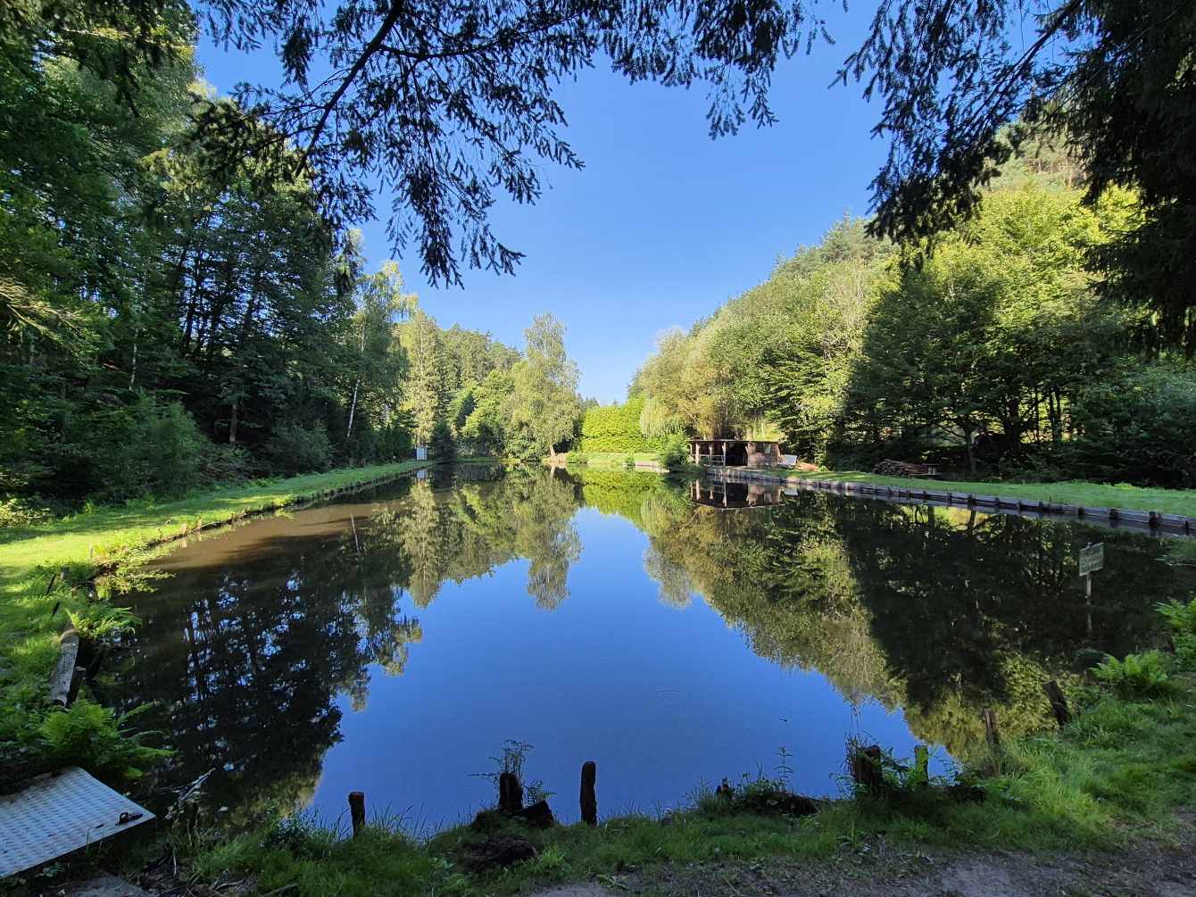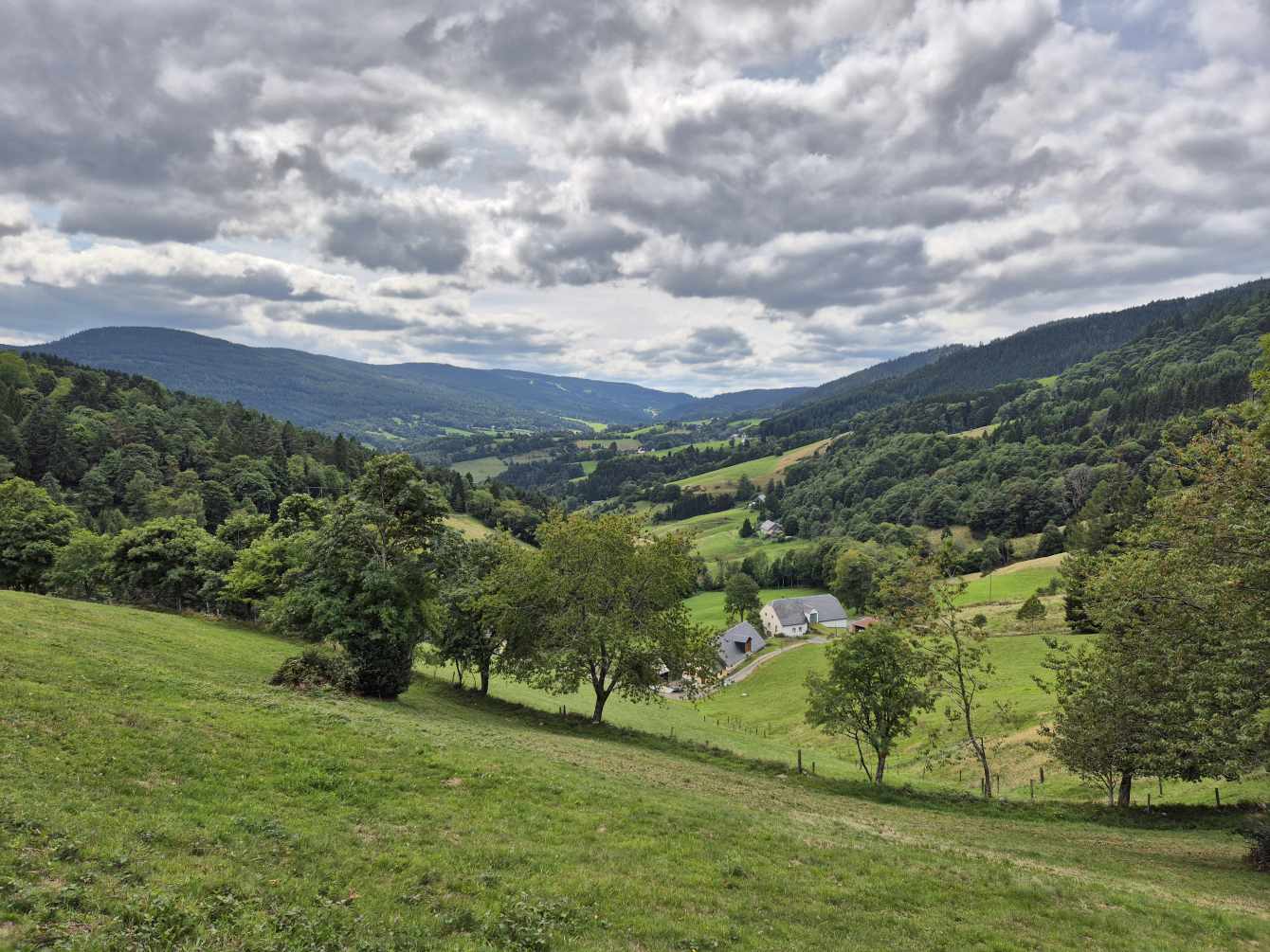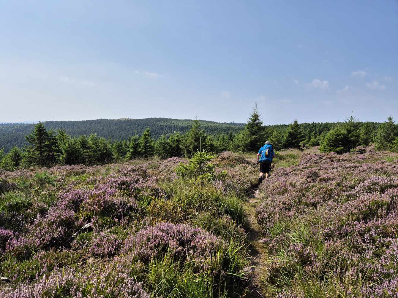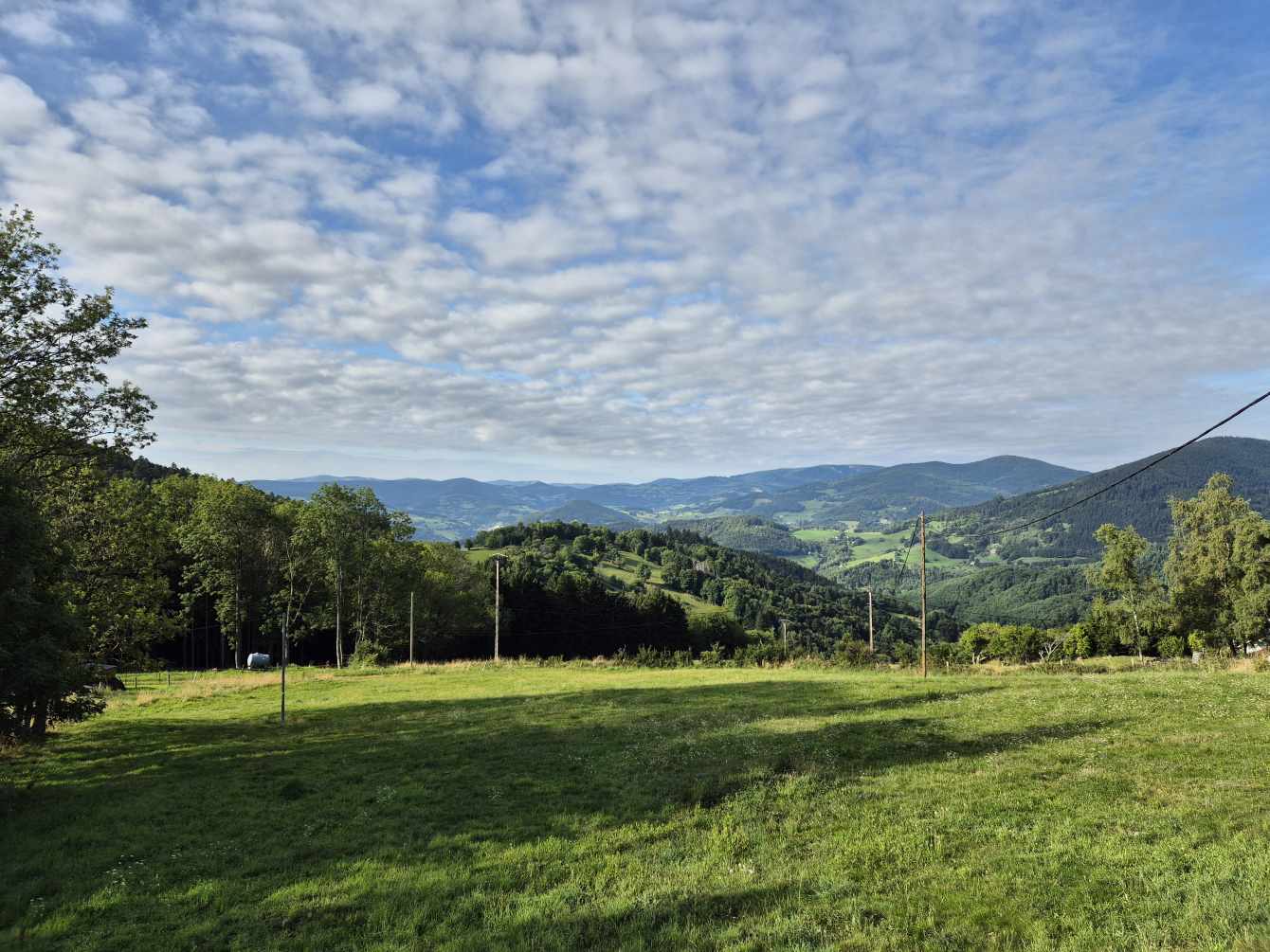 Tagesbericht: Bei 12 Zimmern und 2 WCs und 2 Waschräumen (mit je 1 Waschbecken) gehen wir von einem Engpass am Morgen aus und stellen den Wecker auf 6 Uhr, obwohl es erst um 8 Uhr Frühstück gibt - wir sind die Ersten im Bad. Angesichts unserer bevorstehenden Tour nehmen wir ergänzend zum französischen Frühstück noch eine Schüssel Müsli mit Banane -der Tag wird es zeigen- das trägt bis in den Nachmittag. Bei schönstem Wetter starten wir und haben schnell den Gipfel des Hohneck (1363 m) erreicht - wie am Vortag, als wir knapp unterhalb des Gipfels zu unserer Unterkunft abgebogen waren, ist der Rundum-Weitblick einfach begeisternd! Aber auch der "Tiefblick" ins Tal ist schön, zumal wir dort gaaaaanz weit unten den Stausee entdecken, an dem wir vorbei müssen. 1,5 Stunden geht es dann zünftig bergab auf Pfaden und schmalen Wegen -teil etwas blockig, teil angenehm- erst über sonnenbeschienene Wiesenhänge, später im Wald bis wir den Lac de Schiessrothried (930 m) erreicht haben. Und der teils steilere Abstieg geht weiter - nun entlang eines kleinen Bächleins, das munter bergab stürzt; bald darauf erreichen wir den kleinen Karsee Lac du Fischboedle (794 m). Weiter geht es bergab auf einem wirklich wunderschönen Pfad entlang besagten Bächleins, mal links davon, mal rechts davon, mal mehr, mal weniger steil, bis wir das Tal erreichen und dann auf breiterem Weg das Örtchen Mittlach (529 m). Am Ortsausgang bietet sich eine halbschattige Bank zur Rast an, bevor wir uns am nächsten Berg an den gut 1,5 Stunden durchgehenden Aufstieg machen, auch hier auf sehr schönen Pfaden; das erste Teilstück ist auch ein Trimm-dich-Pfad und Peter versucht sich zu unserer beider Belustigung an einem Gerät. Dann haben wir eine Hochebene erreicht (u.a. Col du Herrenberg 1191 m), auf der Kühe weiden und wir ein Stück gemütlich in der Sonne laufen. Den größten An- und Abstieg haben wir damit für heute geschafft, auch wenn im Folgenden noch drei kleinere "Hubbel" zu nehmen sind, mal im offenen Gelände mit viel Aussicht, mal durch schönen Vogesenwald. Und dann erreichen wir unsere rustikale Auberge du Steinlewald; da neben uns nur zwei weitere Paare übernachten, sind Etagen-Dusche und -WC kein Problem. Das Abendessen ist ausgezeichnet und vor allem üppig, so dass wir richtig satt werden. Was für ein schöner Tag mit einer landschaftlich abwechselungsreichen Tour!