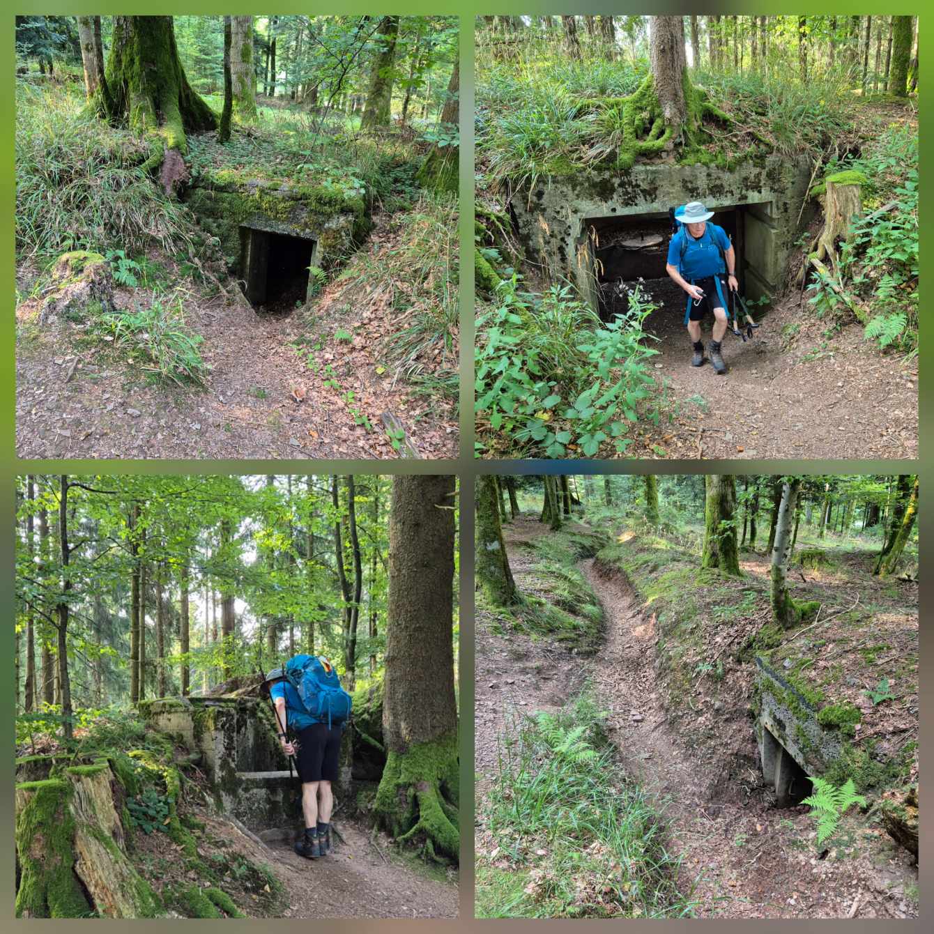 Tagesbericht: Um 4:45 Uhr klingelt der Wecker und nach einem schnellen Kaffee geht's Richtung Bahnhof. Auch in diesem Jahr challengt uns die Deutsche Bahn: Zug 1 fährt planmäßig; in Karlsuhe können wir einen verspäteten früheren Zug nehmen, allerdings führt eine kurzfristige Gleisänderung zu einem kleinen Spurt durch den Bahnhof; in WInden stranden wir dann, da unser Folgezug entfällt und der Schienenersatzverkehr erst später fährt. Wir unternehmen zwei Versuche, ein Uber-Taxi zu bekommen... ...aber so sehr auf dem Land findet sich kein Fahrer - und so bleibt uns nichts anderes übrig, als auf den Bus zu warten. Der Busfahrer gibt dann aber alles und heizt halsbrecherisch übers Land und durch die Dörfer; 30 min später als geplant erreichen wir Weissenburg. Schnell die ganze Technik starten; ein Start-Selfie machen -denn weit und breit ist kein Mensch um uns herum- und los geht's. Nur kurz streifen wir den Rand von Weissenburg City und bereits nach 2 km sind wir im Grünen und haben nur noch Landschaft um uns. Die Wegmarkierung des GR53, ein rotes Rechteck, ist sehr gut und wir kommen zügig voran. Bei der zunehmenden Wärme ist es sehr angenehm, dass der Weg nahezu vollständig durch den Wald verläuft - mal licht und hoch, mal eng und dicht, mal Laub-, mal Nadelwald. Von Weissenburg geht es beständig sacht bergauf - mal etwas mehr, mal etwas weniger. Dass wir den ersten Col (Col du Pigeonnier; 432 m) der Tour passiert haben, merken wir erst, als es "hinten dran" wieder bergab geht. Wir passieren das verschlafen wirkende Örtchen Climbach und kurz danach verlassen wir den GR53 um zum "four à chaux", einer Artillerie-Festung der Ligne Maginot zu gelangen, wo wir uns auf 13:30 zu einer deutschen Führung vorab angemeldet hatten. Insgesamt 2,5 Stunden führt uns unser Guide durch diese unterirdische Kaserne; sehr spannend und sehr beeindruckend! Wir fragen uns, ob so ein Bau heute noch möglich wäre - so durchdacht und in so schneller Bauzeit... Wir kommen in die Bereiche Kaserne, Gefechtsstand, Technikraum und erhalten ein lebhaftes Bild des Alltags. In der Anlage hat es nur 13 °C, so dass wir tatsächlich am Ende ordentlich ausgekühlt sind und die wärmende Sonne auf den letzten 2 Kilometern bis zu unserem Zielort Lembach regelrecht genießen. Die Wanderroutinen in günstig Rucksack entpacken, Wäsche waschen etc. müssen sich erst wieder einspielen, aber wir schaffen es frisch geduscht pünktlich zum Abendessen. Sehr erfreut entdecken wir auf der Karte ein alkoholfreies Bier... ...aber <brrrr> das wird wohl nicht unser Favorit werden; dafür ist das Essen mega lecker und wir beschließen sehr genüsslich und zufrieden diesen ersten Wandertag. Michaela hat mit Maus und neuer Tablet-Tastatur eine deutliche Verbesserung beim Tagebuch schreiben erreicht - das fluppt jetzt richtig zügig.