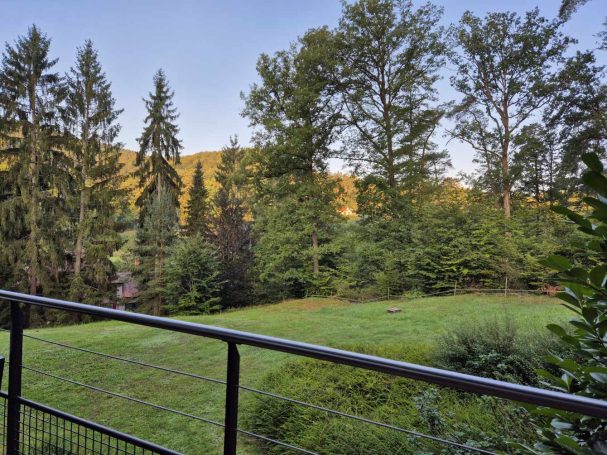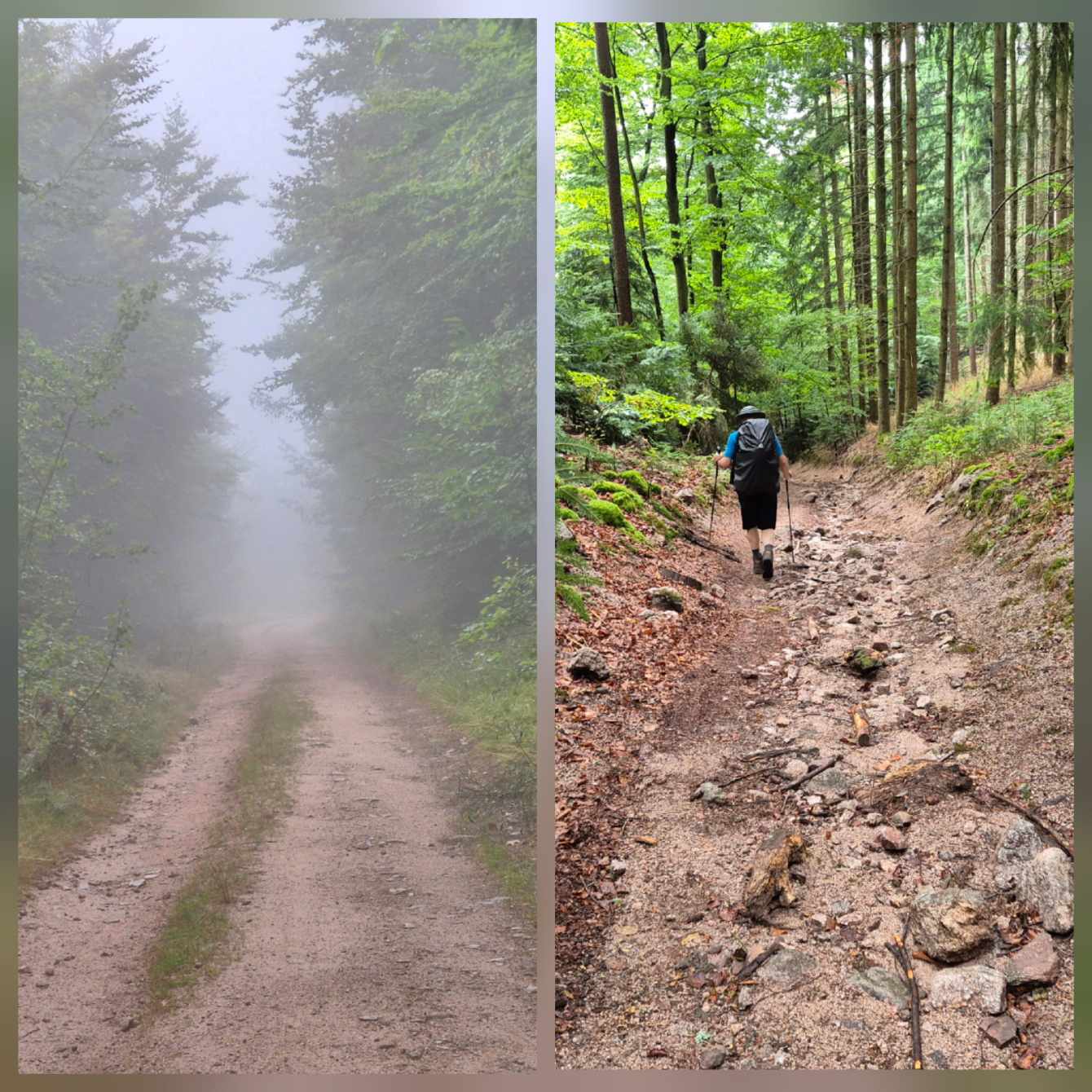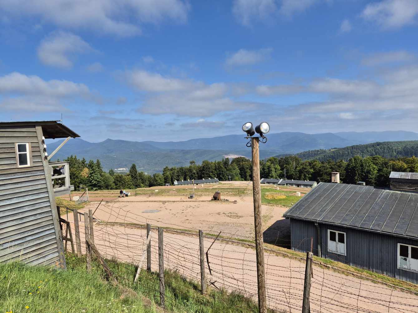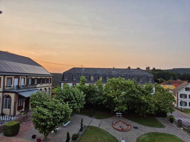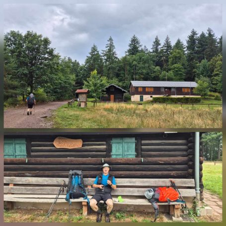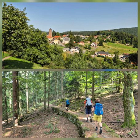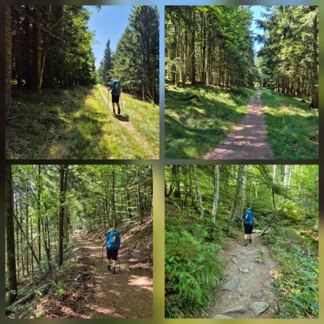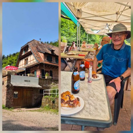 Tagesbericht: Das hatten wir auch noch nie - 2x ein 1,40m Bett mit jeweils entsprechend großer Bettdecke, d.h. eine Gesamtbettbreite von 2,80m. Peter kann Michaelas nächtliches Schnarchen nicht durch einfaches Anstupsen unterbrechen, weil sie zu weit weg liegt... Noch einwenig matt vom gestrigen Tag stärken wir uns bei einem schönen Frühstück und lassen es etwas ruhiger angehen, da die heutige Etappe eine kürzere ist mit weniger Höhenmetern. Die ersten knapp 300 Höhenmeter legen wir allerdings gleich nach dem Start hin und steigen auf Waldwegen zum KZ Struthof auf. Wir hatten diesen Ort bewusst in unsere Etappenplanung aufgenommen und Zeit vorgesehen; vor Ort entscheiden wir uns aber gegen die Besichtigung des Geländes, da dieses gut einsehbar ist und auch außen rum viele erklärende Tafeln stehen. Vielleicht ist es dieses Aufeinanderprallen von acht Tagen friedvollem Wandern in Stille und herrlicher, friedlicher Natur und diese unfassbare Grausamkeit und Brutalität des Nazi Regimes - vielleicht noch in Verbindung mit dem aktuellen Weltgeschehen - wir sind zutiefst bewegt, Michaela kämpft stellenweise mit den Tränen - damit hatten wir nicht gerechnet. Es ist gut, dass die folgenden Kilometer einfache schmale Wege sind, ohne Ablenkung und jeder schweigend seinen Gedanken nachgehen kann. Erst nach und nach nehmen wir unsere Umgebung wieder mit allen Sinnen wahr. Seit Struthof sind wir nun auf dem GR5 unterwegs; die Wege und Pfade bleiben heute einfach, ohne besondere Herausforderung; gelegentlich gibt es auch etwas Ausblick; gegen Mittag legen wir eine kurze Pause an einer Schutzhütte ein. Am Nachmittag kommen wir an der Cascade du Hohwald vorbei, ein netter Wasserfall, bevor wir unseren heutigen Zielort Le Hohwald und unser Hotel erreichen. Die frühere Ankunft erlaubt noch ein kleines Nickerchen bevor wir zu einem erneut sehr guten Abendessen gehen.