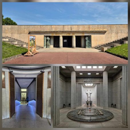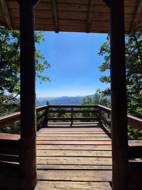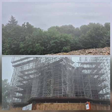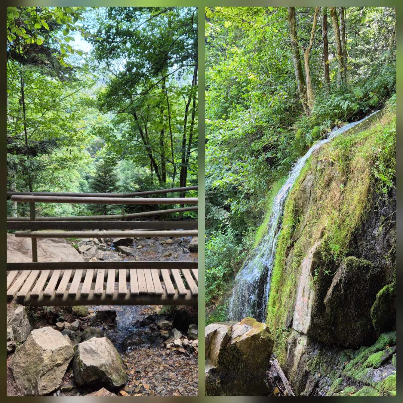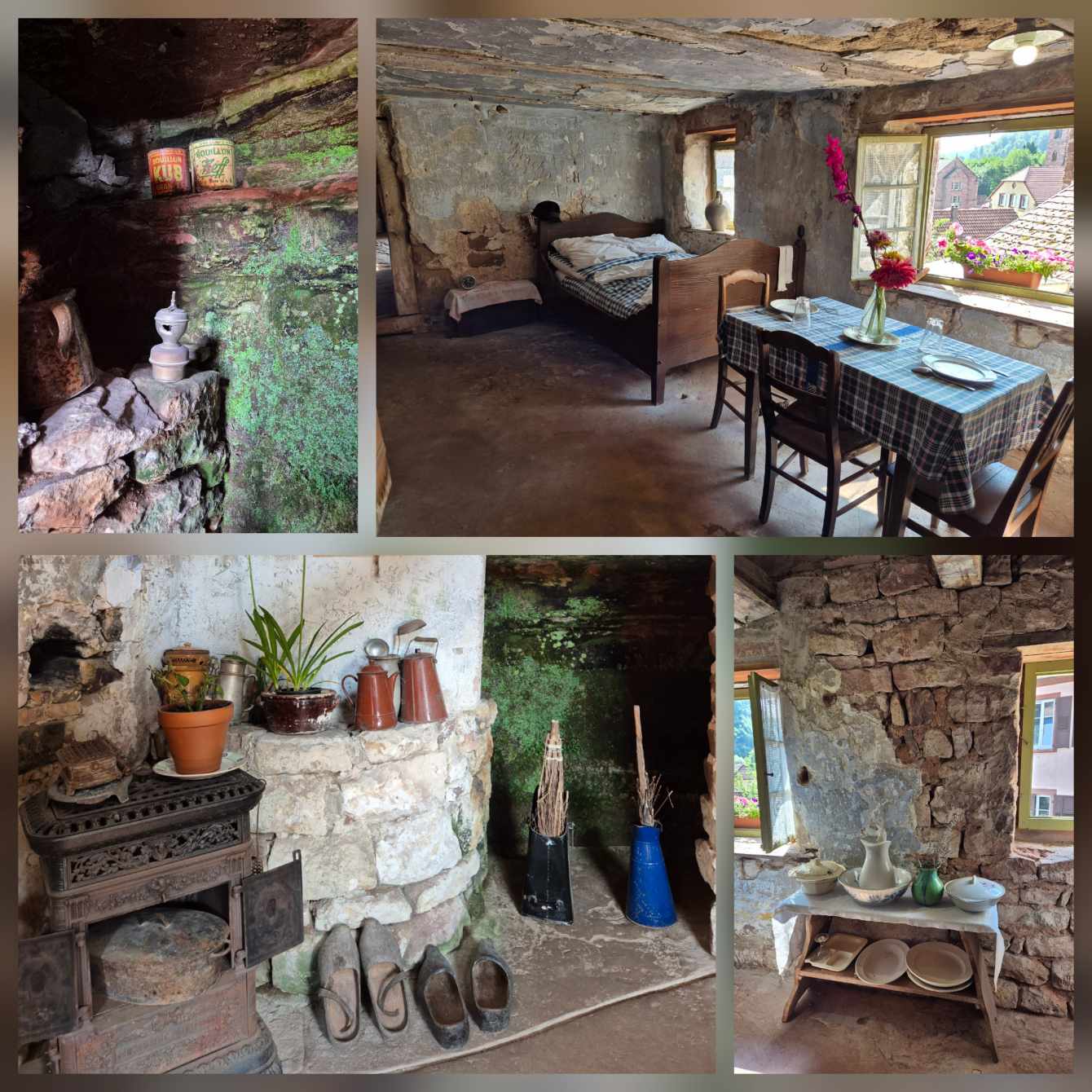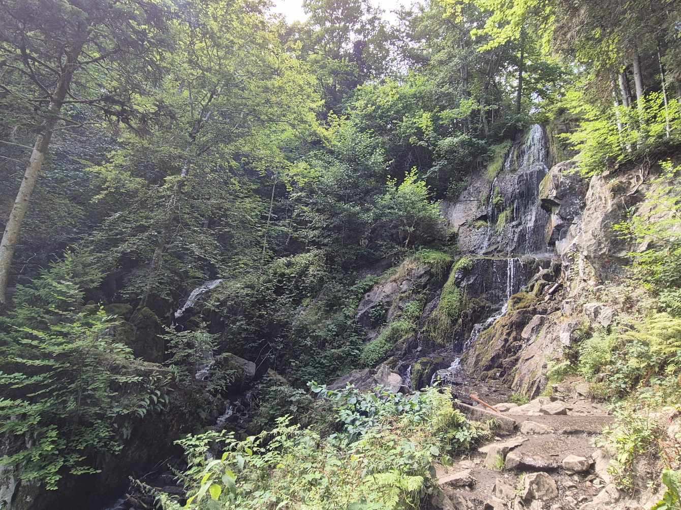 Tagesbericht: Das hatten wir auch noch nie - 2x ein 1,40m Bett mit jeweils entsprechend großer Bettdecke, d.h. eine Gesamtbettbreite von 2,80m. Peter kann Michaelas nächtliches Schnarchen nicht durch einfaches Anstupsen unterbrechen, weil sie zu weit weg liegt... Noch einwenig matt vom gestrigen Tag stärken wir uns bei einem schönen Frühstück und lassen es etwas ruhiger angehen, da die heutige Etappe eine kürzere ist mit weniger Höhenmetern. Die ersten knapp 300 Höhenmeter legen wir allerdings gleich nach dem Start hin und steigen auf Waldwegen zum KZ Struthof auf. Wir hatten diesen Ort bewusst in unsere Etappenplanung aufgenommen und Zeit vorgesehen; vor Ort entscheiden wir uns aber gegen die Besichtigung des Geländes, da dieses gut einsehbar ist und auch außen rum viele erklärende Tafeln stehen. Vielleicht ist es dieses Aufeinanderprallen von acht Tagen friedvollem Wandern in Stille und herrlicher, friedlicher Natur und diese unfassbare Grausamkeit und Brutalität des Nazi Regimes - vielleicht noch in Verbindung mit dem aktuellen Weltgeschehen - wir sind zutiefst bewegt, Michaela kämpft stellenweise mit den Tränen - damit hatten wir nicht gerechnet. Es ist gut, dass die folgenden Kilometer einfache schmale Wege sind, ohne Ablenkung und jeder schweigend seinen Gedanken nachgehen kann. Erst nach und nach nehmen wir unsere Umgebung wieder mit allen Sinnen wahr. Seit Struthof sind wir nun auf dem GR5 unterwegs; die Wege und Pfade bleiben heute einfach, ohne besondere Herausforderung; gelegentlich gibt es auch etwas Ausblick; gegen Mittag legen wir eine kurze Pause an einer Schutzhütte ein. Am Nachmittag kommen wir an der Cascade du Hohwald vorbei, ein netter Wasserfall, bevor wir unseren heutigen Zielort Le Hohwald und unser Hotel erreichen. Die frühere Ankunft erlaubt noch ein kleines Nickerchen bevor wir zu einem erneut sehr guten Abendessen gehen.