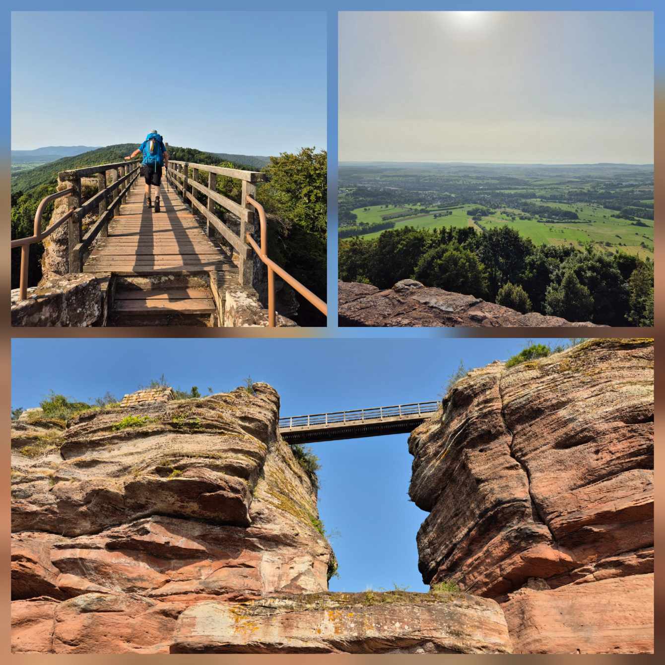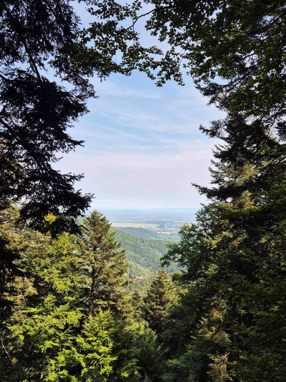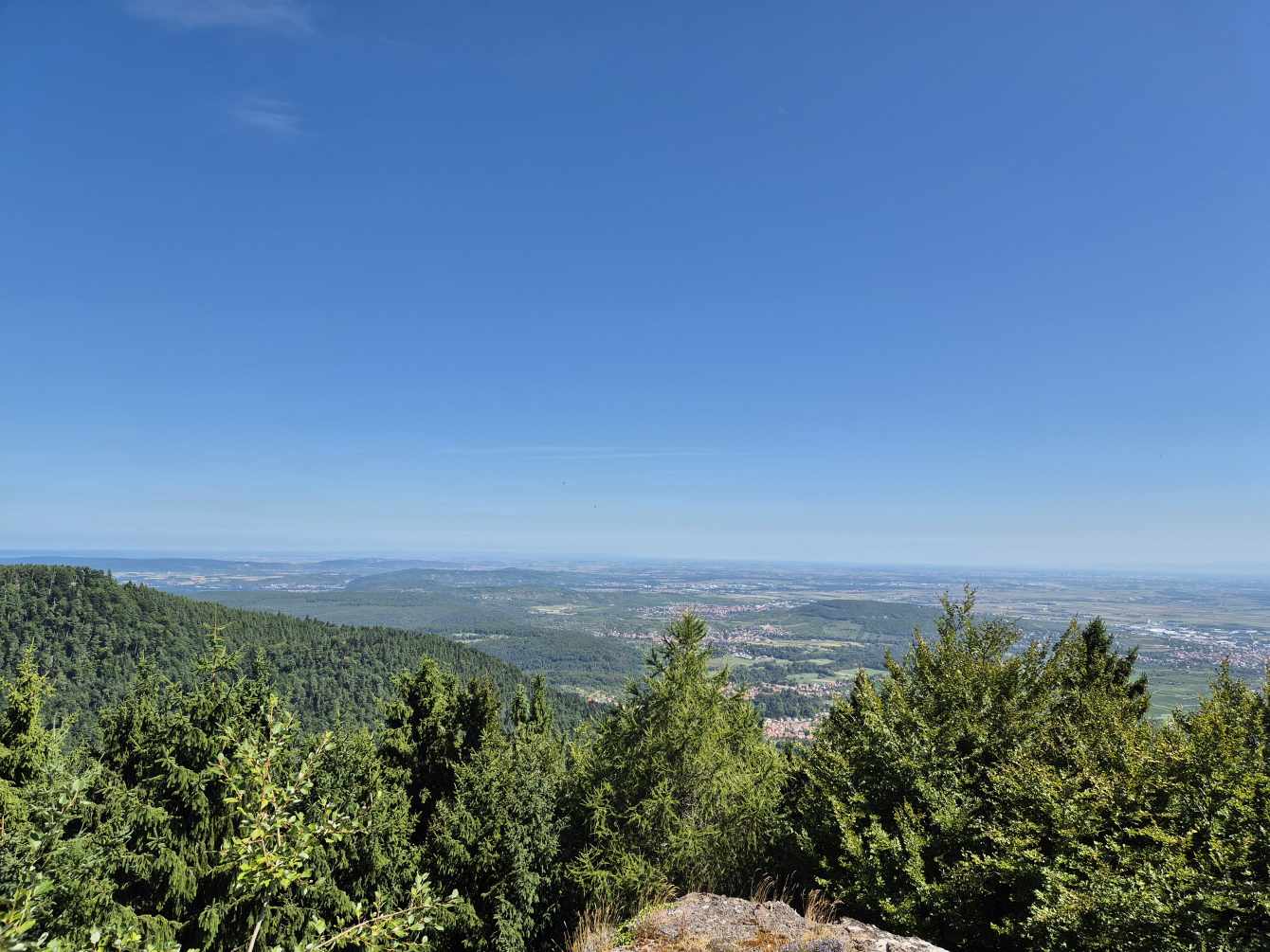 Tagesbericht: Wir werden wach von einem Geräusch, dass sich durch die offenen Fenster wie Regen anhört - aber nein, das ist nur starker Wind in den großen Bäumen im Park gegenüber, der sich bald legt. Mit der aufgehenden Sonne stellt sich sehr bald Wärme und dann eine große Hitze ein. Unser weiterer Weg verläuft oberhalb von Wangenbourg, sodass wir schon aus dem Ort raus den ersten Anstieg haben. Eine Weile folgen wir einem Waldweg und hätten fast den Abzweig auf ein steil ansteigendes Pfädchen übersehen, wenn auf diesem nicht ein sehr großer Ameisenhaufen gethront hätte. Nach rund 1,5 Stunden mehr oder weniger steilem, aber durchgehendem Anstieg erreichen wir den Gipfelfelsen des Schneebergs (leider ohne Schnee) und genießen die Aussicht. Damit ist der Hauptanstieg für heute geschafft und über schmale, schöne Wege und Pfade geht es wieder bergab, mal mehr, mal weniger steil. Zwischendrin gibt es immer wieder schöne Ausblicke in die Ebene - wenn auch etwas eingetrübt, da es ziemlich diesig ist. Kurz vor dem Mittag bietet sich eine Bank zu einer kurzen Rast an, dann geht es weiter in das Schutzgebiet am Nideck, einem der am meisten besuchten Naturschauplätze im Departement Bas-Rhin: wir passieren auf schönen Pfaden und schmalen Wegen die Ruine Nideck und kommen nach einem steilen Abstieg über ungezählte Treppen an die "Cascade du Nideck", einem 25 m hohen Wasserfall. Hier ist reges Treiben und nach einem obligatorischen Foto wandern wir rasch weiter - weiter bergab, bis zur etwas rustikalen "Auberge du Nideck", wo wir aber ausgezeichneten Quetsche-Kuchen und alkoholfreies Bier bekommen und Peter sein ersehntes Calippo. Die verbleibende Strecke am Nachmittag wird trotz meist schattiger Wege durch die Hitze sehr anstrengend, zum Glück sind keine allzu großen An-/Abstiege mehr zu bewältigen. Plötzlich ist Urmatt erreicht und unsere Zimmer sind bezugsfertig. Zum Abendessen stößt Ulli zu uns, der am nächsten Tag ein Stück mit uns laufen wird. Er bringt uns auch Nachschub an Rei in der Tube mit, sowie einen speziellen Schraubendreher und Batterien, da Michaelas Tastatur gestern ihren Geist aufgegeben hat. Peter ist erfolgreich und Michaela kann sehr erleichtert diesen Tagesbericht wieder mit "echter" Tastatur schreiben.