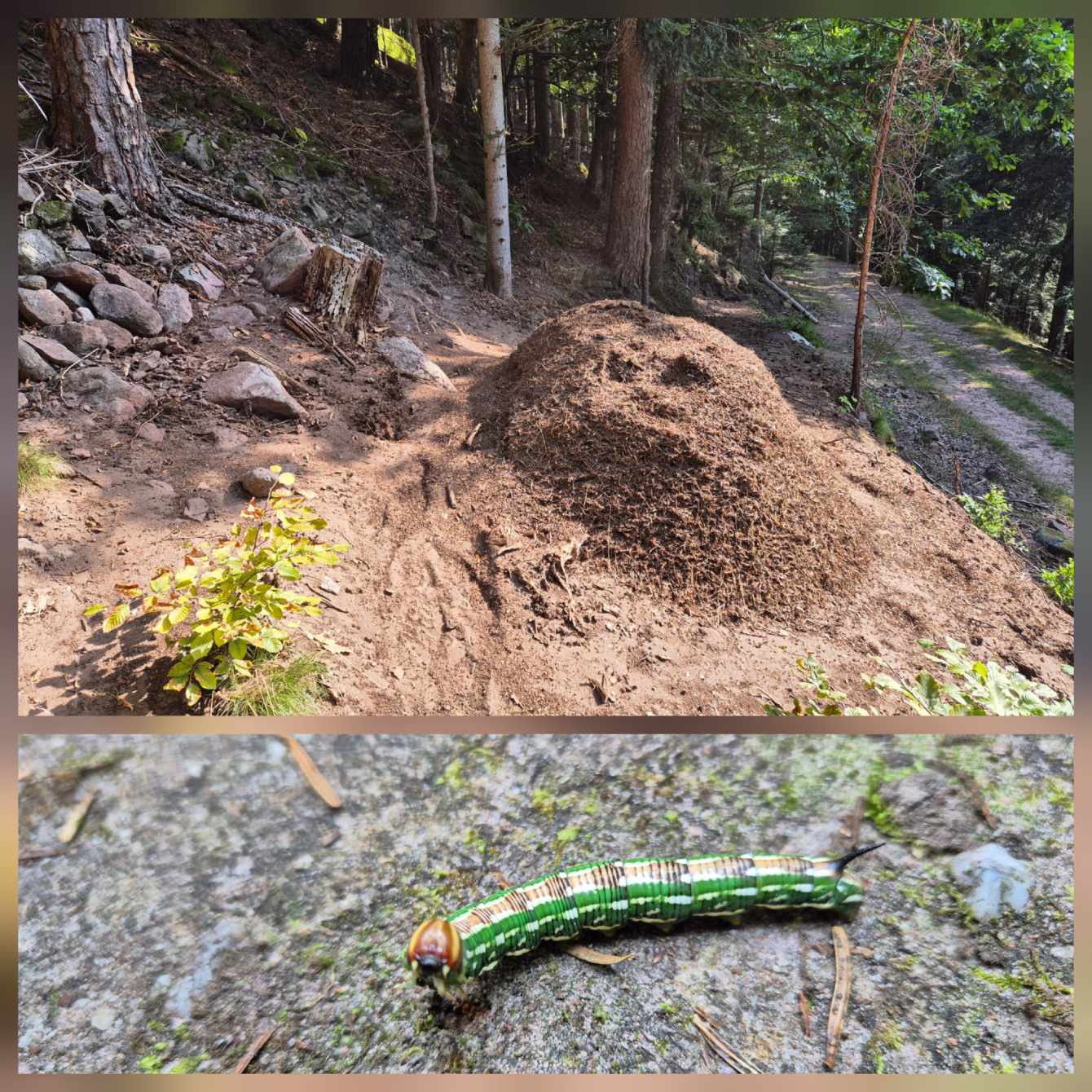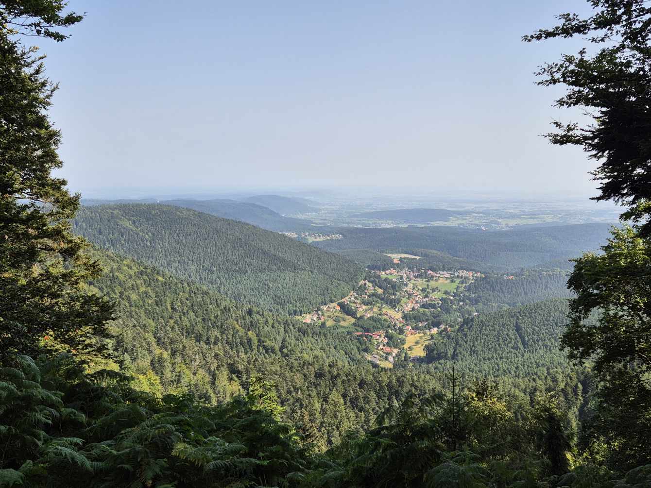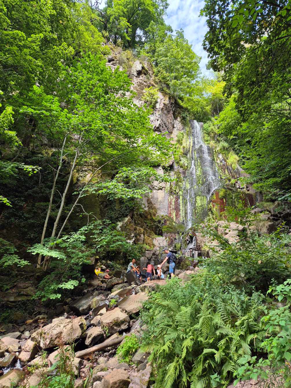 Tagesbericht: Wir werden wach von einem Geräusch, dass sich durch die offenen Fenster wie Regen anhört - aber nein, das ist nur starker Wind in den großen Bäumen im Park gegenüber, der sich bald legt. Mit der aufgehenden Sonne stellt sich sehr bald Wärme und dann eine große Hitze ein. Unser weiterer Weg verläuft oberhalb von Wangenbourg, sodass wir schon aus dem Ort raus den ersten Anstieg haben. Eine Weile folgen wir einem Waldweg und hätten fast den Abzweig auf ein steil ansteigendes Pfädchen übersehen, wenn auf diesem nicht ein sehr großer Ameisenhaufen gethront hätte. Nach rund 1,5 Stunden mehr oder weniger steilem, aber durchgehendem Anstieg erreichen wir den Gipfelfelsen des Schneebergs (leider ohne Schnee) und genießen die Aussicht. Damit ist der Hauptanstieg für heute geschafft und über schmale, schöne Wege und Pfade geht es wieder bergab, mal mehr, mal weniger steil. Zwischendrin gibt es immer wieder schöne Ausblicke in die Ebene - wenn auch etwas eingetrübt, da es ziemlich diesig ist. Kurz vor dem Mittag bietet sich eine Bank zu einer kurzen Rast an, dann geht es weiter in das Schutzgebiet am Nideck, einem der am meisten besuchten Naturschauplätze im Departement Bas-Rhin: wir passieren auf schönen Pfaden und schmalen Wegen die Ruine Nideck und kommen nach einem steilen Abstieg über ungezählte Treppen an die "Cascade du Nideck", einem 25 m hohen Wasserfall. Hier ist reges Treiben und nach einem obligatorischen Foto wandern wir rasch weiter - weiter bergab, bis zur etwas rustikalen "Auberge du Nideck", wo wir aber ausgezeichneten Quetsche-Kuchen und alkoholfreies Bier bekommen und Peter sein ersehntes Calippo. Die verbleibende Strecke am Nachmittag wird trotz meist schattiger Wege durch die Hitze sehr anstrengend, zum Glück sind keine allzu großen An-/Abstiege mehr zu bewältigen. Plötzlich ist Urmatt erreicht und unsere Zimmer sind bezugsfertig. Zum Abendessen stößt Ulli zu uns, der am nächsten Tag ein Stück mit uns laufen wird. Er bringt uns auch Nachschub an Rei in der Tube mit, sowie einen speziellen Schraubendreher und Batterien, da Michaelas Tastatur gestern ihren Geist aufgegeben hat. Peter ist erfolgreich und Michaela kann sehr erleichtert diesen Tagesbericht wieder mit "echter" Tastatur schreiben.
