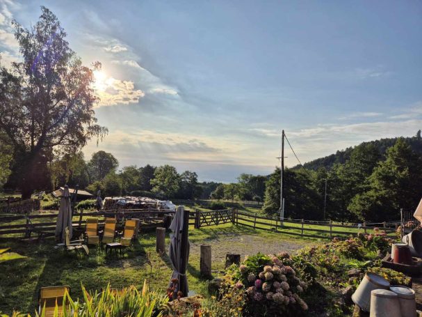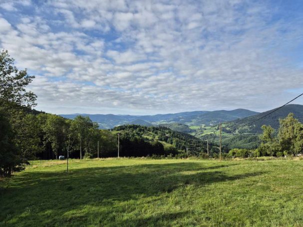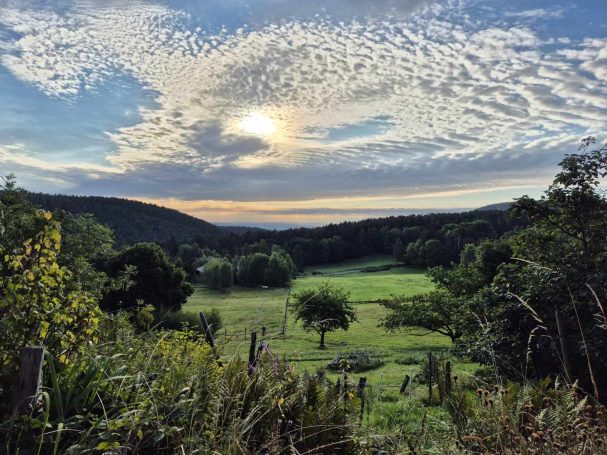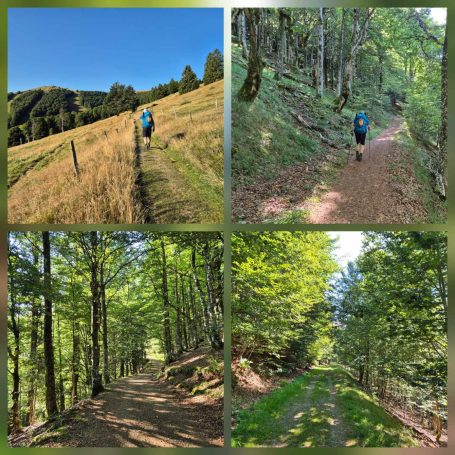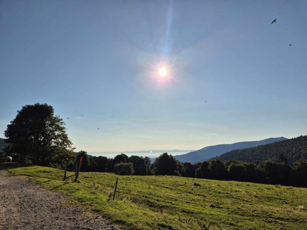 Tagesbericht: Ein 1,40 m Bett ist uns einfach zu schmal und wir haben nicht sonderlich tief geschlafen, um dem anderen weder die Decke zu klauen, noch ihn aus dem Bett zu drängen. Unser Zimmer ist in der Nacht ziemlich ausgekühlt und wir sind dankbar für den Heizlüfter, den uns unsere Wirtin hingestellt hat und mit dem wir das Bad einigermaßen angewärmt bekommen. Vom Zimmer zum Frühstücksraum müssen wir ins Freie - huch, das ist noch ganz schön kalt, aber dafür gibt es einen wunderschönen Sonnenaufgang! Auf die Frage, wie es ihr geht, antwortet Tini: "Ich habe Körper." (in Erweiterung zur gebräuchlichen Beschreibung "ich habe Rücken"; aber das groovt sich bald nach dem Start ein.) Das Frühstück ist kein wirklicher Energiespender - etwas Toast, Butter, Marmelade, Käse, Joghurt mit Haferflocken - das muss reichen. Nach einer herzlichen Verabschiedung durch unsere Wirtin machen wir uns bei lockerer Bewölkung und mittlerweile erträglicher Temperatur auf den Weg. Wie gehabt geht es die ersten 1,5 Stunden nur bergauf - so kommt der Kreislauf in Schwung und uns wird warm; zuerst asphaltiert aus dem Ort raus, dann auf Forstwegen, schließlich auf schmalerem Weg. Dann genießen wir auf 1170 m einen sehr schönen Rundumblick und folgen eine Weile einem Höhenpfad mit immer wieder schönen Ausblicken. Auf einem Forstweg -als "Chemin Militaire" gekennzeichnet- geht es in nur leichtem auf und ab weiter, bis wir mit einem knackigen Schlussanstieg auf schmalem Pfad den Petit Brézouard (1203 m) erreichen und erneut begeistert sind von der Aussicht. Etwa 20 min später lädt eine Bank in der Sonne zur Mittagsrast ein und anschließend setzen wir den langen Abstieg auf wechselnden Wegen fort bis wir den Ort Le Bonhomme auf 690 m erreichen und ihn durchqueren, um dann nochmals auf 2,5 km einen steilen Anstieg auf schmalen Pfaden plus etwas flacheres "Auslaufen" zu unserem Zielhotel zu bewältigen. Aber die Anstrengung hat sich gelohnt: unser Hôtel Étang du Dévin liegt einsam am Berg mit einer sagenhaften Aussicht, und wir genießen diese direkt nach Ankunft zusammen mit einem großen Stück Heidelbeerkuchen in der Sonne. Abends hat der Wirt einen deutschen und einen französischen Tisch für die Hausgäste gerichtet und es kommen große Suppenschüsseln und Platten mit dem Hauptgericht auf den Tisch und jeder schöpft sich.