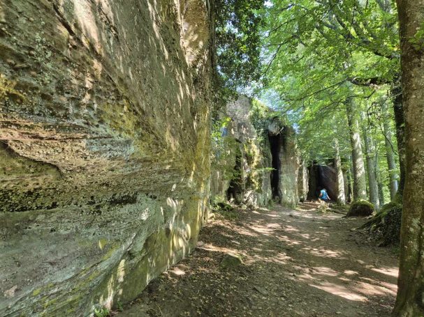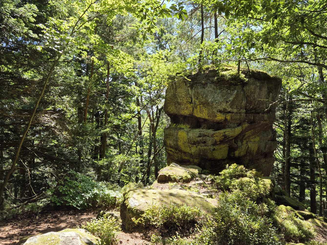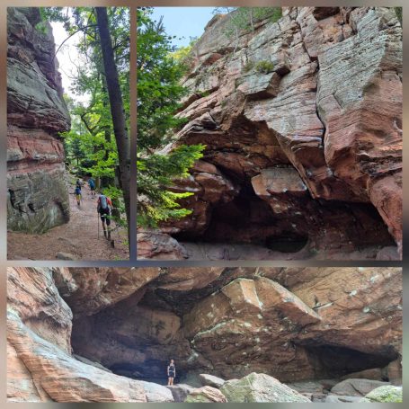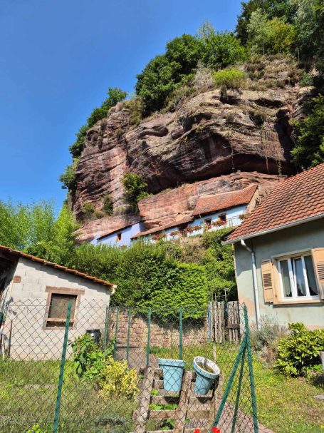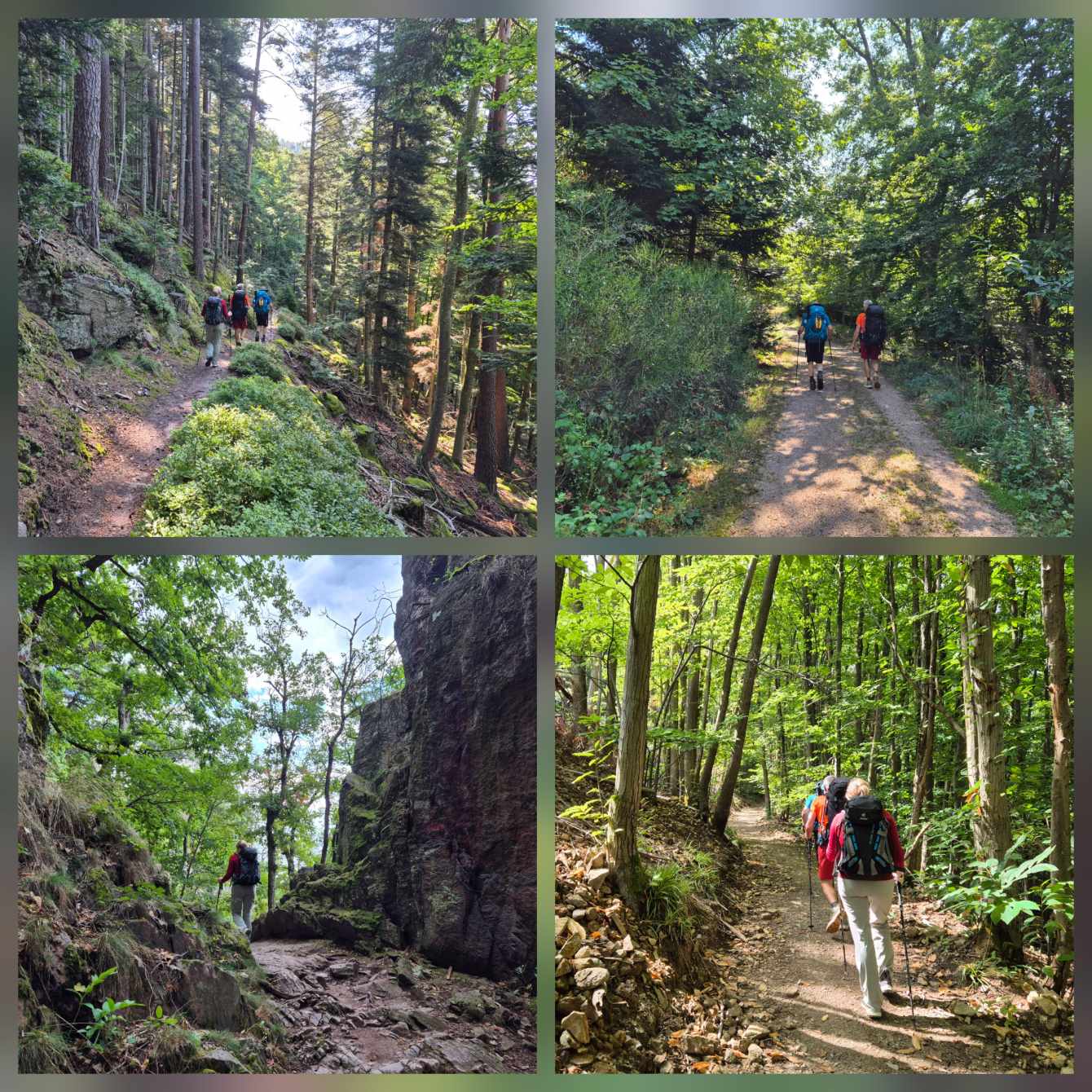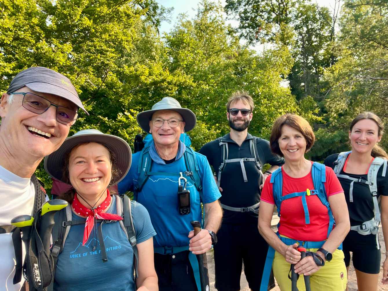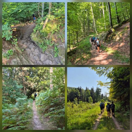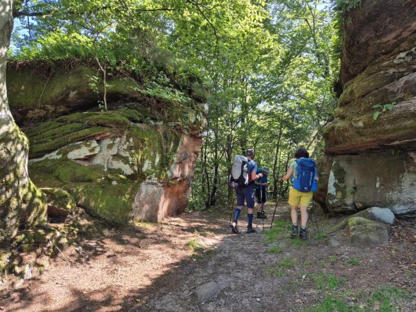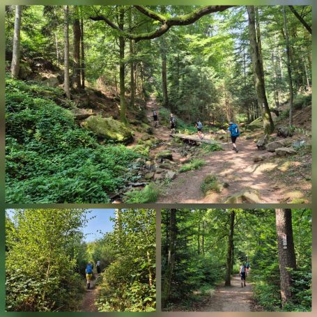 Tagesbericht: Vorhang und Fenster auf - und uns begrüßt ein weiterer schöner Tag. Nach einem leckeren stärkenden Frühstück stoßen noch Patrick und Sandra zu uns und wir setzen den Weg gemeinsam zu sechst fort; zu Beginn müssen wir die unterschiedlichen Gehgeschwindigkeiten etwas synchronisieren. Bald nach dem Start erreichen wir den Rocher du Corbeau (Rabenfelsen), von dem aus man einen kleinen Ausblick auf das vor uns liegende Waldgebiet hat. In engen Kehren geht es auf schmalem Pfad bergab und bald darauf führen Waldpfade und -wege wieder moderat bergauf. Wir bleiben bei diesem Wechsel von auf und ab und erreichen nach rund 2 Stunden das Dörfchen Graufthal, bekannt durch die "Felsenwohnungen" - 3 kleine Häuschen, die im 18. Jhdt. direkt in den Fels gebaut worden waren; die letzte Bewohnerin, die Felsekäth, hat ihre 82 Lebensjahre (bis 1958 !) dort gewohnt. Wir besichtigen die Häuschen und setzen dann unseren Weg fort, der uns durch Wälder und Wiesen führt, wobei wir bei zunehmender Hitze den Wald eindeutig bevorzugen. Nach etwa der Hälfte der Strecke legen wir eine kleine Rast -wie gehabt- mit Nüssen, Trockenobst und Keksen ein; im weiteren Wegverlauf müssen wir eine TGV-Strecke und eine Autobahn überqueren und hierzu ein Stück an einer Bundesstraße entlang laufen. Aber schon bald geht es wieder auf Pfaden weiter. Noch einmal legen wir eine kurze Pause ein, als sich eine Sitzgelegenheit geradezu aufdrängt und gehen dann auf die letzten 4 km. Wir passieren den 15 m hohen Sandsteinfelsen "Le Saut du Price Charles" und mit Hilfe einer Übersetzungs-App kann Peter uns die dazugehörige Sage vom Französischen ins Deutsche übersetzt vorlesen. Der folgende Abstieg auf schmalem Pfad bringt uns Wald-beschattet an den Rand von Saverne, wo wir in brütender Hitze ins Zentrum wandern und in einem Café mächtigen Kuchen und XXL-Cockies verdrücken - das haben wir uns verdient! Bevor dann die totale Erschöpfung einsetzt, machen wir uns auf die letzten Meter zum Hotel und freuen uns alle mächtig auf die Dusche. Wir beschließen den Tag mit einem gemeinsamen leckeren Abendessen.