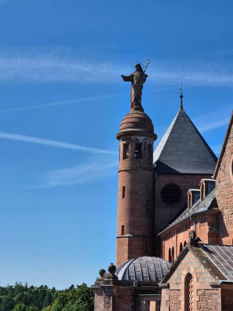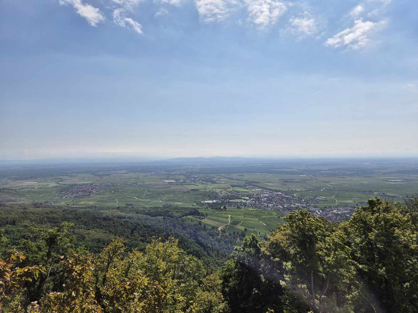 Tagesbericht: Unser Zimmer ist eine Maisonnette - Schlafzimmer oben, Bad und Wohnzimmer unten - da müssen wir sehr aufpassen, nichts zu vergessen. Nach einem guten Frühstück machen wir uns auf den Weg, der wieder einmal gleich mit einem Anstieg aufwartet. Auf wechselnden schönen Wegen geht es mäßig bergauf; manchmal verläuft der Weg ganz nah an einer Bundesstraße, die aber nicht "stört", da sehr wenig Verkehr ist. Auf schmalem Pfad kommen wir zur Heidenmauer, ein keltischer Ringwall (gemauert, 10 km lang, teilweise 4 m hoch) aus dem 2. Jh.v.Chr. - schon beeindruckend. Kurz darauf erreichen wir den bekannten Mont Ste-Odile (764 m). Hier sind einige Menschen unterwegs, aber es ist nicht überlaufen, so dass wir trotzdem gut und in aller Ruhe die herrliche Aussicht in die Rheinebene genießen können; auch die Kapelle besichtigen wir. Nach einer kleinen Rast und bevor wir weitergehen, nehmen wir einen kurzen, aber heftigen Abstieg zur Quelle der heiligen Odilia auf uns (und im Anschluss wieder Aufstieg), um in ein winziges Fläschchen Wasser abzuzfüllen - ein Mitbringsel für Peters Mutter. Auf schönen Pfaden wandern wir mit nochmals etwas Anstieg zum Maennelstein (817 m) - und der Ausblick ist einfach begeisternd. Ab dann geht es kontinuierlich bergab, zumeist auf Pfaden und mäßig fallend, nur einige geröllige etwas steilere Passagen erfordern besondere Konzentration. Dann verlassen wir den Wald - wir haben das Rebland erreicht - und gleich wird es in der prallen Sonne sehr warm. In dem kleinen Örtchen Barr legen wir in einem kleinen Café noch eine Pause ein, um dann die letzten 3,5 km zu unserem Zielort Andlau nochmals flotten Schrittes zu bewältigen. Der Internet-Auftritt unseres Hotels war ansprechender, als es die Realität ist; was schade ist, da wir hier auch unseren morgigen Ruhetag verbringen werden. Mal schauen, wie sie das Problem des "kaputten" Wlan lösen; dieser Tagesbericht entsteht gerade im Restaurant-Bereich.