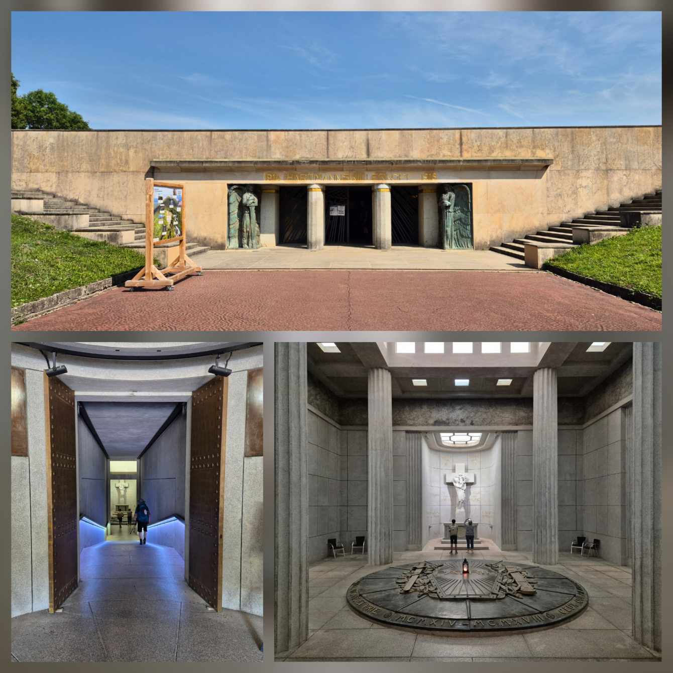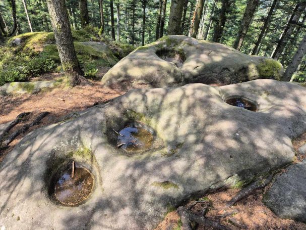 Tagesbericht: Ein herrlicher Sonnenaufgang kündigt einen weiteren schönen Tag an. Das Frühstück in Buffet-Form ist ausreichend, so dass wir gestärkt starten. DIe ersten 1,5 Stunden Anstieg -mal mehr, mal weniger steil- stehen im Zeichen des Ersten Weltkriegs: wir passieren einen ehemaligen deutschen Soldatenfriedhof, die Reste eines gemauerten Unterstandes, einen ca. 4 m hohen Eingang zu einem heute zugeschütteten Stollen, sowie etlichen verfallenen Schützengräben, Granattrichtern, Reste von Geschützstellungen, verrosteten Stacheldraht... und das alles in heute schönster Natur: einem einstigen See (Étang du Dévin) - heute eine wunderschöne Sumpfwiese, dem kleinen Granitfelsen Roche du Corbeau (Rabenfelsen) und sehr schöne Waldpfade. Dieses Nebeneinander von kriegerischer, menschlicher Zerstörung und dem Wunder der Natur macht uns nachdenklich und drängt die Frage auf, wofür der Mensch diese Kriege anzettelt.