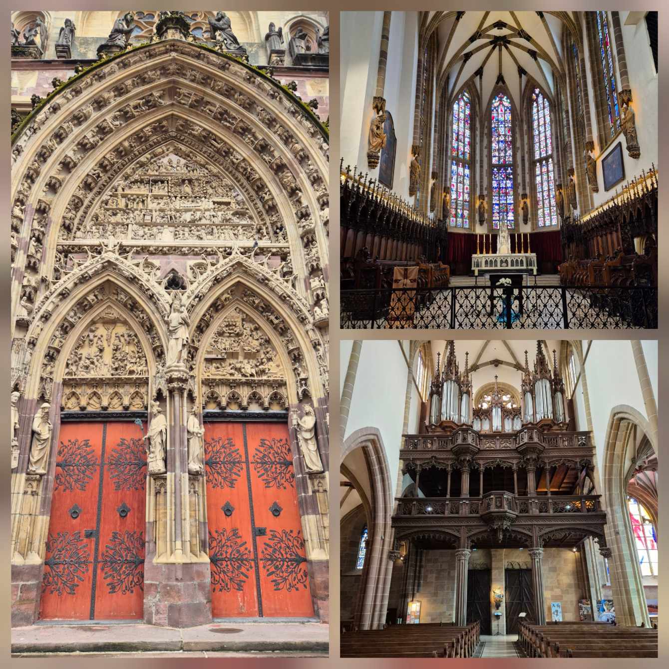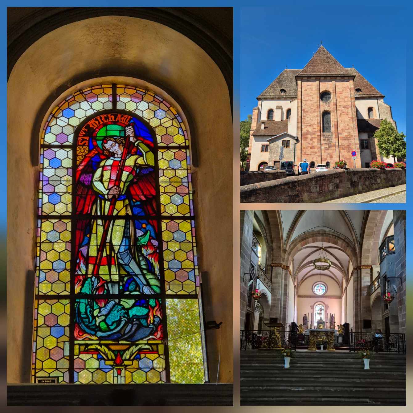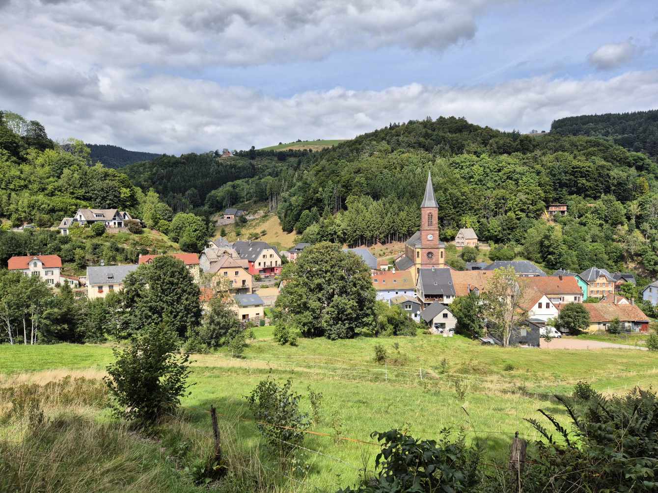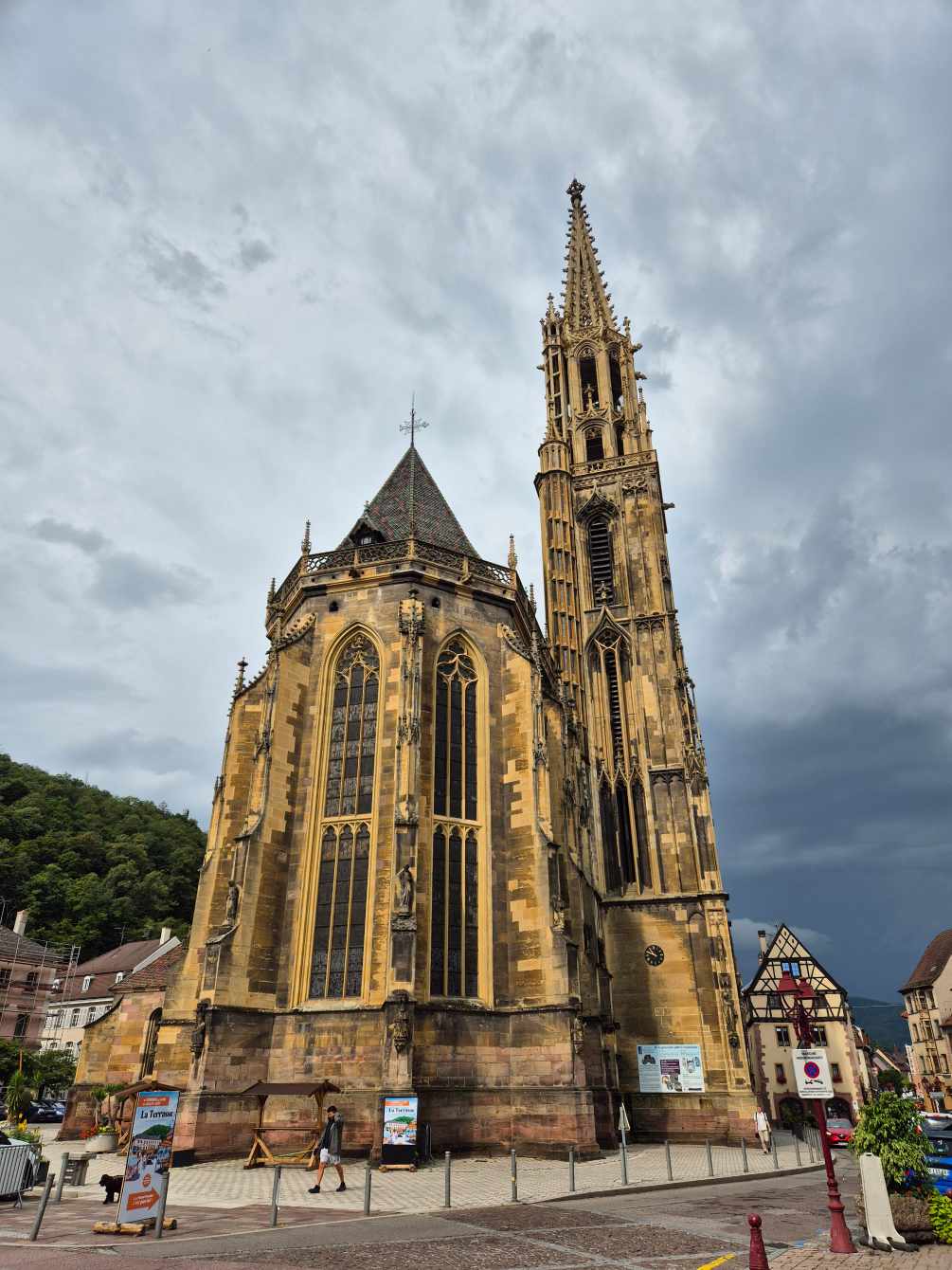 Tagesbericht: Der Regen hat in der Nacht aufgehört, die Luft ist frisch. Wir freuen uns über die Möglichkeit, bereits um 7 Uhr frühstücken zu können, da unsere Tour auch mit dem angepassten ersten Teil lang werden wird und wir froh sind, früh loskommen zu können. In starken 2,5 Stunden wandern wir von unserem Hotel nach Thann. Zuerst auf Waldwegen ein längeres Stück bergab und dann auf Wegen in der Vorbergzone in wechselndem Auf und Ab durch Reben, vorbei an Schrebergärten, Feldern und Streuobstwiesen, durch kleine Ortschaften und kleinere Waldabschnitte - da hat Peter eine schöne Alternativroute rausgesucht! Über uns ist der Himmel bewölkt und gelegentlich blinzelt die Sonne durch - aber über den Vogesen, wo unsere eigentliche Tour verlaufen sollte und ab mittags verlaufen wird, fangen sich an dunkle Wolken aufzutürmen und gegen später am Vormittag ist dumpfes Donner-Grollen zu hören. Kurz bevor wir Thann erreichen, können wir oberhalb einen kleinen Blick auf die Ruine der Engelbourg erhaschen, deren Turm bei der Zerstörung zur Seite gekippt und in mehrere Teile zerbrochen ist, wobei ein Teil Ähnlichkeit mit einem ins Tal hinabblickenden Auge hat und heute daher "l'œil de la sorcière" (Hexenauge) genannt wird. In Thann besichtigen wir das gotische Münster "Collégiale Saint-Thiébaut" - ein beeindruckender Bau. Beim Fotografieren des Münsters wird noch etwas anderes ganz deutlich - der mittlerweile schwarze Himmel über den Vogesen. Auf dem Marktplatz von Thann stehen einige überdachte Bänke und wir legen eine Pause ein und wägen unsere Optionen ab - kaum haben wir Platz genommen, geht der erste Regenschauer nieder und ein Gewitter zieht aus der Ferne auf. Der zweite Teil unseres heutigen Tages würde in die Berge und nur noch bergauf führen, laut Beschreibung mit einer gesicherten Stelle, die Aufmerksamkeit erfordert. Für Morgen lautet die Wettervorhersage stärkerer Regen bis in den frühen Nachmittag und unsere geplante Tour wäre eine ziemlich lange mit viel An- und Abstieg, wobei ein Teilstück bei Regen unbedingt zu vermeiden sei, d.h. den Donnerstag würden wir auf jeden Fall nicht wie geplant laufen können; und der Freitag wäre nur noch ein "Auslaufen", um nach Belfort zu kommen. In Abwägung aller Punkte kommen wir zu dem Schluss, dass es gut, vernünftig und passend ist, unsere Vogesendurchquerung hier und jetzt in Thann zu beenden. Wir hatten sehr schöne, interessante, abwechslungsreiche und gute 20 Tage - da müssen wir es auf die letzten zwei Tage nicht erzwingen, unnötige Risiken eingehen und bei Regen und Gewitter in der Gegend herumstapfen. Und so machen wir uns auf den Weg zum Bahnhof und fahren über Mulhouse und Müllheim zurück nach Bühl.