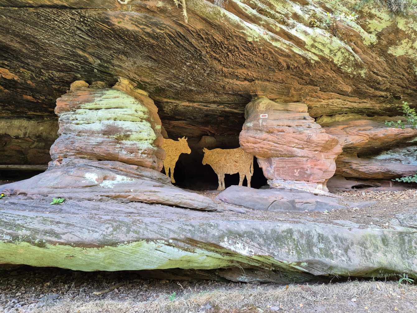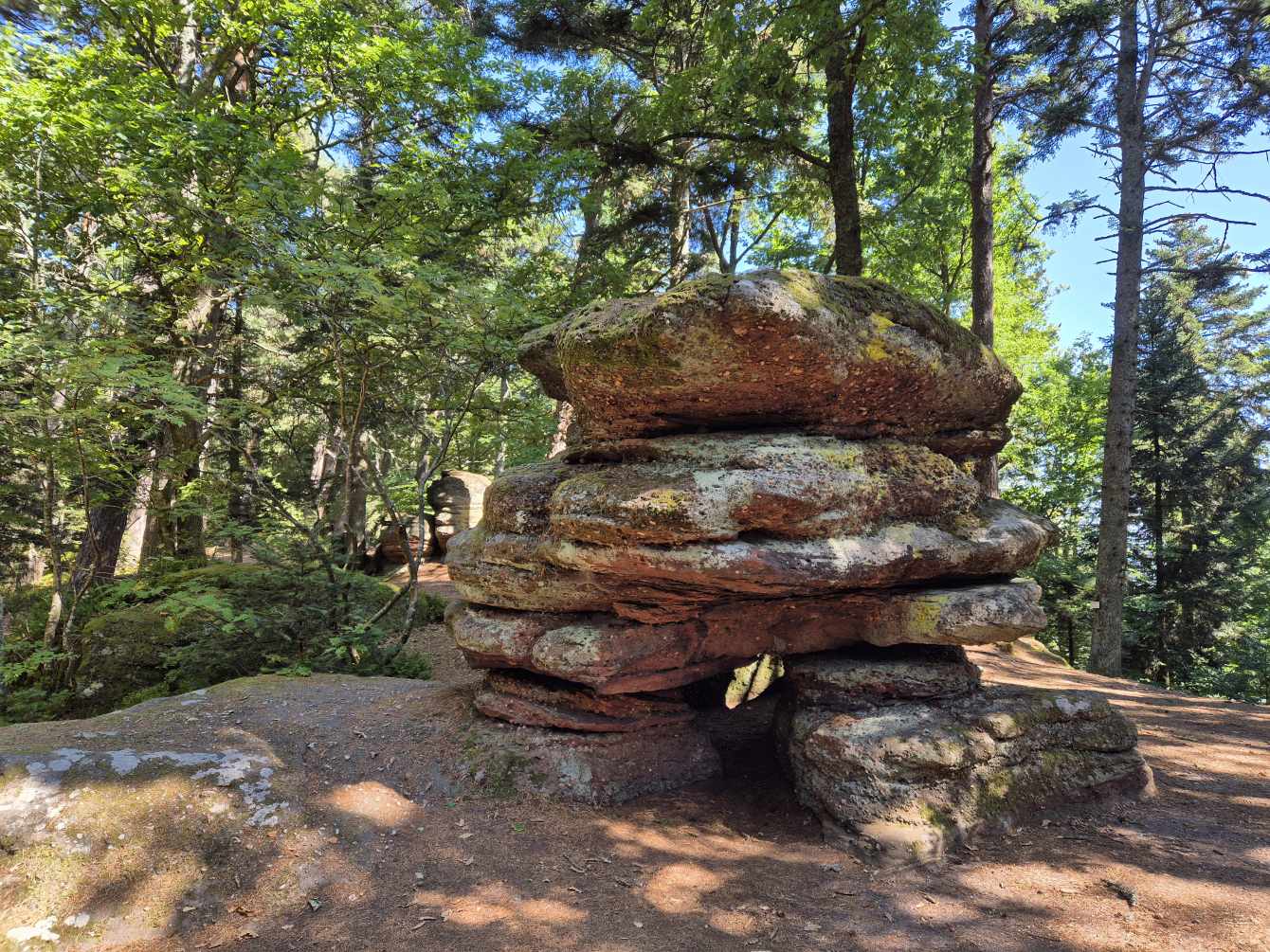 Tagesbericht: In diesem vermutlich nobelsten Hotel unserer Tour haben wir sehr gut geschlafen; mit einem schönen Zimmerausblick zu einem wolkenlosen Himmel kann der Tag kommen. Das Frühstück wird quasi als Mini-Buffet am Tisch serviert entsprechend unserer am Vorabend getroffenen Wahl. Alles sehr gediegen und entschleunigt, wobei unsere Frühstückszeit nicht mit "unendlich" eingeplant ist. Ein kleinwenig später als sonst starten wir - schön war's hier! Nach einem kleinen Wege-Verwirrspiel - wir hatten uns nicht gleich über ein Privatgrundstück getraut, obwohl unser Navi es eindeutig so auswies - so drehten wir eine kleine Schleife, um dann der Wegmarkierung folgend "von hinten" über das Privatgrundstück geleitet zu werden - nehmen wir Fahrt auf und in einem leichten auf und ab wandern wir über Waldpfade und schmale Wege. Erneut verlaufen die Wege durch wechselnde Wälder und mit dem Sonnenschein durch die Blätter entsteht eine sehr friedliche, stille Atmosphäre. Fast meditativ sind wir in stetigem Tempo unterwegs. Nach gut zwei Stunden treffen wir ziemlich punktgenau in Lichtenberg ein, wo unsere Freunde Barbara und Joachim zu uns stoßen. Gemeinsam setzen wir die Wanderung fort - und müssen ein kleinwenig mehr aufpassen, vor lauter Schwatzen keinen Abzweig zu verpassen. Nach anfänglich fast ausshließlich sehr schönen Waldpfaden, kommen später größere Abschnitte Wald-/Forstwege dazu, alles in moderatem auf und ab. Um die Mittagszeit durchqueren wir Wimmenau, leider ohne Café oder ähnlichem, so dass wir kurzerhand im Schatten des Rathauses eine Rast einlegen und uns mit Nüssen, Feigen und Keksen stärken. Der anschließende kurze Weg in der Sonne an Wiesen entlang zeigt, wie heiß es tatsächlich ist und wir sind froh, wieder "in den Wald eintauchen" zu können. Wir kommen am Felsmassiv "Rocher de l'Ochsenstall" vorbei; unter das große Felsdach wurden zur Verdeutlichung des Namens zwei Holzochsen gestellt. Erckartswiller, ein schier endlos scheinendes Straßendorf, müssen wir auf der Haupstraße passieren und das ist in der gleißenden Sonne auf heißem Teer kein wirklicher Genuss. Doch irgendwann sind wir durch und setzen unseren Weg bewaldet fort, weiterhin in leichtem auf und ab. Kurz vor unserem Zielort La Petite-Pierre müssen wir nochmals einen kleinen Abschnitt Asphalt in Auf- und Abstieg bewältigen, dann ist der Ort erreicht. Noch vor dem Hotel Check-in gönnen wir uns einen Pause mit Getränken und einem großen Stück sehr leckerem Mirabellenkuchen. Das spätere Abendessen ist ebenfalls sehr gut und die Portionen sind groß, so dass wir uns gut für Morgen stärken können. (Bilder leider unsortiert; ging nicht)