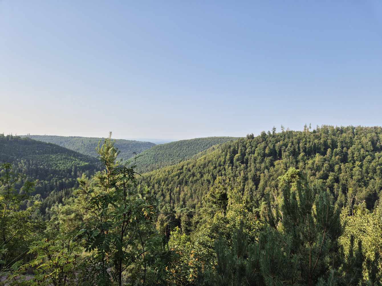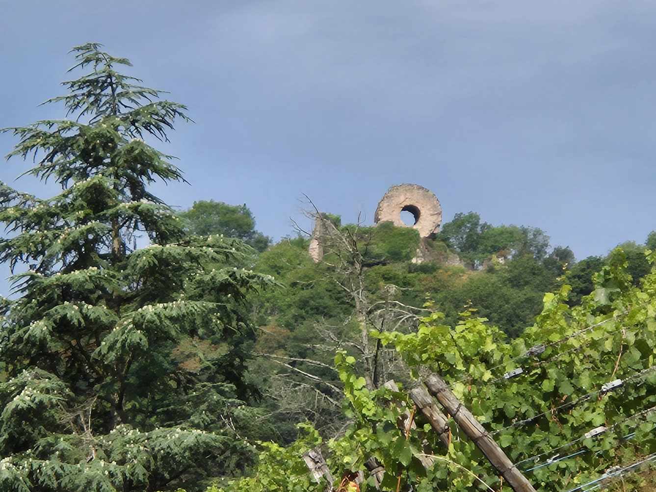 Am Rand von Niederbronn-les-Bains passieren wir eine Heilquelle, versäumen es aber, unsere Wasserflaschen aufzufüllen. Ein weiterer Anstieg führt uns zur Ruine Wasenbourg; von dort geht es dann zwar tendenziell bergab, aber ein paar kleinere Steigungen müssen wir noch nehmen, bevor uns der letzte Abstieg für heute nach Untermuehltal bringt, wo ein schönes Hotel mit gutem Essen auf uns wartet. Ein langer Wandertag mit schönen Eindrücken geht zu Ende. ...und ganz am Ende wird noch die EMail an das Hotel geschrieben und dieses Tagebuch...