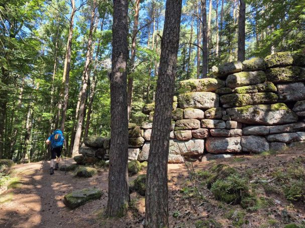 Tagesbericht: Unser sehr nettes Hotel liegt direkt neben dem Rathaus mit einer Glocke, wie eine Kirche, d.h. um 6:00 Uhr sitzen wir senkrecht im Bett. Da wir aber schon um 7:30 Uhr frühstücken dürfen, ist das nicht weiter schlimm; draußen regnet es. Das Frühstück ist sehr französisch und wenig Magen-füllend, und wir verputzen alles, was wir serviert bekommen. Als wir loswandern tröpfelt es nur noch minimal, und mit ein paar Schleifen durch die Reben sind wir bald oberhalb von Châtenois. Weiterhin bergauf geht es auf breiteren und schmaleren Wegen durch den Wald. Da die Wolken sehr tief hängen, wird es stellenweise fast dunkel auf unserem Weg. Auch fängt es wieder leicht an zu regnen, so dass wir die Regenschirme auspacken. Mit einem kurzen, knackigen Schlussanstieg erreichen wir "von hinten" über die Nottreppe eines Kiosk die Haut-Koenigsbourg, mittlerweile wieder regenfrei. Wir müssen lachen: vor uns ist die Burg komplett eingerüstet und Baustelle (Renovierung) und Blick nach links -eigentlich geniale Aussicht- alles trüb und gar keine Aussicht. Und dafür haben wir rund 550 Höhenmeter gemacht und sind gut durchgeschwitzt - wir nehmen es sportlich. Die Haut-Koenigsbourg ist ein Touristen-Hotspot, was sich in Heerscharen an Menschen und Chaos an Autos um uns herum zeigt. Wir gehen weiter entlang der Burg und können dabei einen Blick auf einen Teil bekommen, der nicht renoviert wird - eine beeindruckende Anlage! Auf eine Besichtigung bei diesem Trubel verzichten wir und setzen unseren Weg fort. Kaum 5 Minuten weiter sind wir wieder alleine unterwegs, zuerst ein Stück bergab auf schmalem Weg und dann etliche Kilometer in leichtem auf und ab auf einem doppelspurigen, unspektakulären Forstweg. An einem geschlossenen Naturfreundehaus legen wir an einer überdachten Bank eine Mittagspause ein; es ist deutlich kühler geworden - fast könnte man eine langärmelige Jacke auspacken - da es jetzt aber wieder munter bergauf geht, wird uns schnell wieder warm. Bald nach der Rast zweigen wir vom breiten Weg ab und bekommen wieder herrliche, schmale Pfade; mit einem kräftigen Anstieg erreichen wir die Rocher des Géants (Hochfelsen; 940 m) und haben zumindest ein kleinwenig Ausblick. Um nicht ein Teilstück zurückgehen zu müssen, sucht Peter spontan nach einem anderen Weg und so werden die nächsten zwei km ein "Überraschungspakt" mit ausgesprochen schönen Pfaden, interessanten Felsen und einem kleinen Abschnitt der 2300 m langen "Mur dit Paien" (Grenzmarkierung aus der frühen Neuzeit). Dann haben wir einen letzten steilen Abstieg auf schmalen Wegen vor uns - und stellen fest, dass das genau der Weg ist, den Peter für Morgen als Aufstieg rausgesucht hat... so wissen wir schon jetzt, was uns Morgen früh erwartet. Unsere heutige Unterkunft liegt sehr abgelegen; ein uriges Haus mit sehr netter Wirtin, einem lieben Hofhund und sehr gutem Abendessen. Erstmals packen wir unsere langärmelige Jacke zum Abendessen aus; und nach Ankunft war die warme Dusche auch eine Wohltat gewesen.