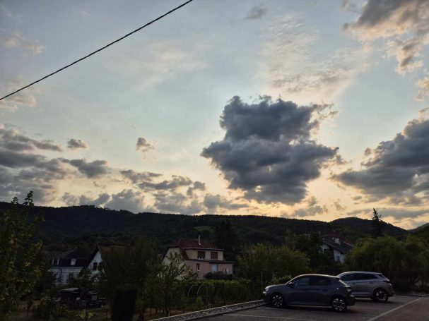 Wetter: am Vormittag sonnig und heiß, wolkenloser blauer Himmel; ab mittags vereinzelte Wolken, nachmittags fernes Donnergrollen und dunkle Wolken in der Ferne
